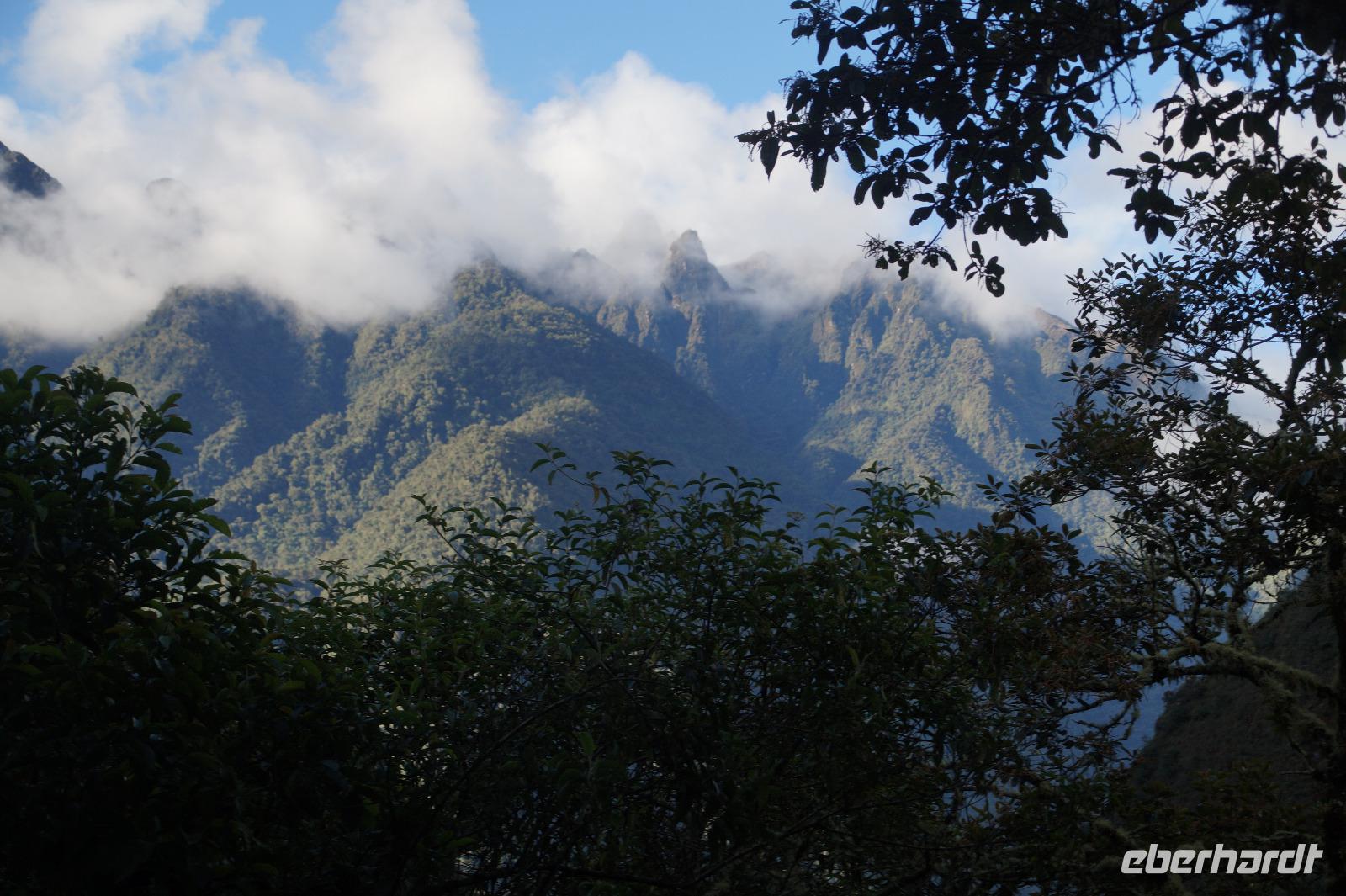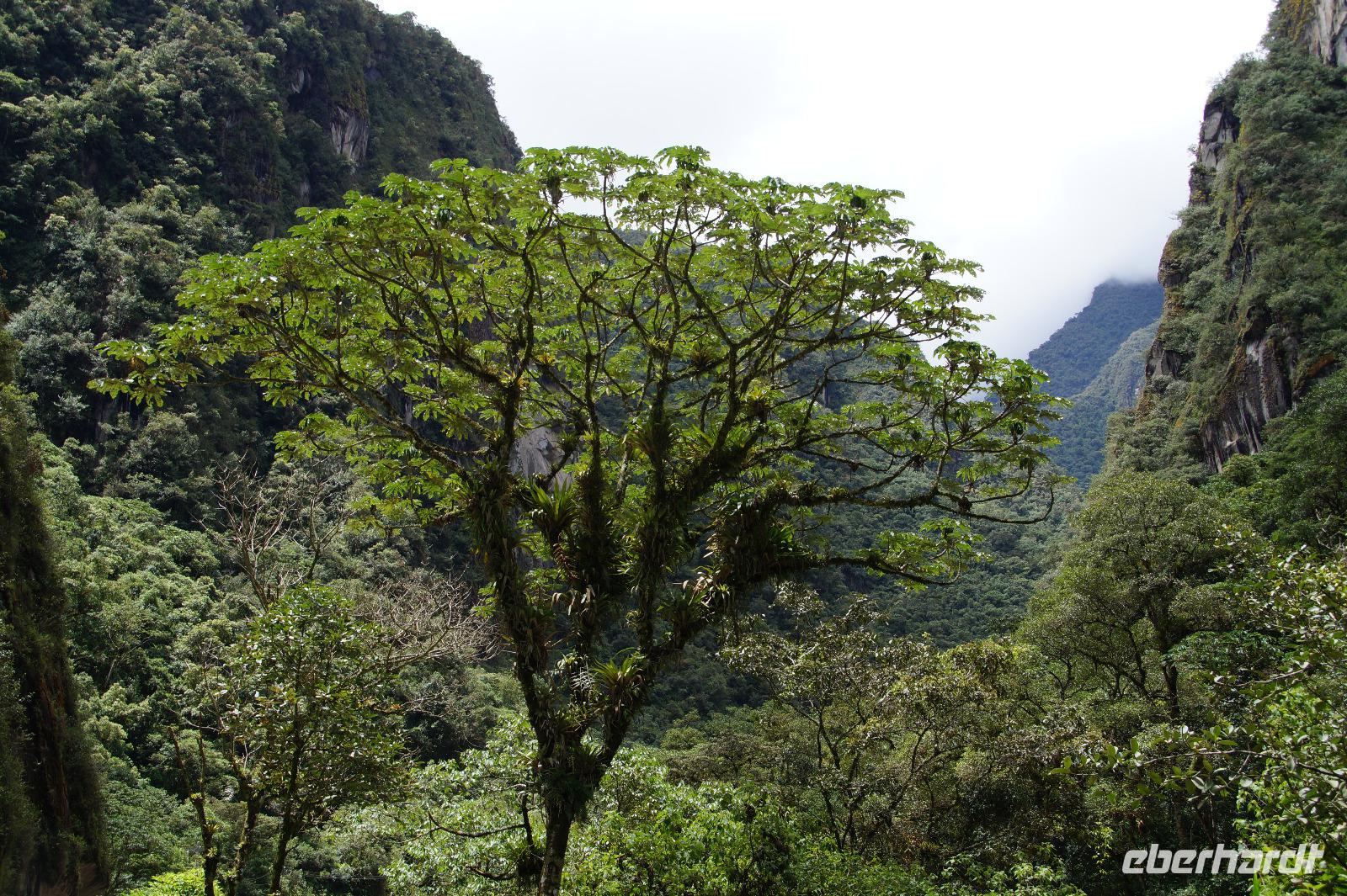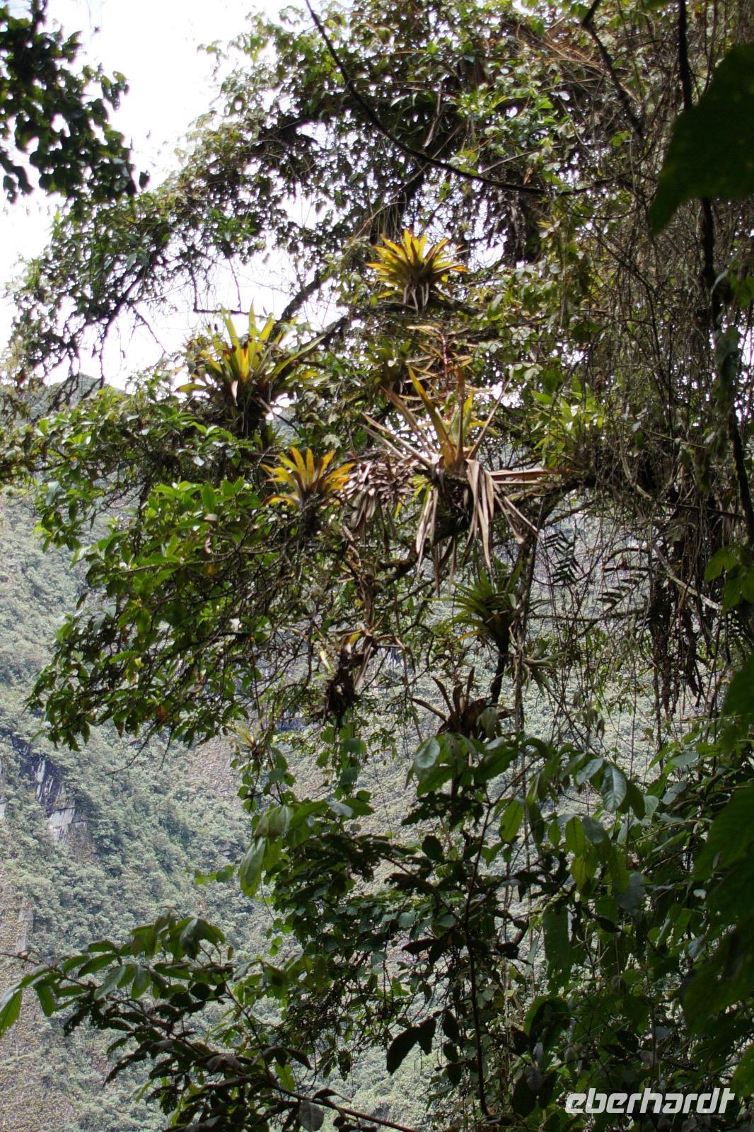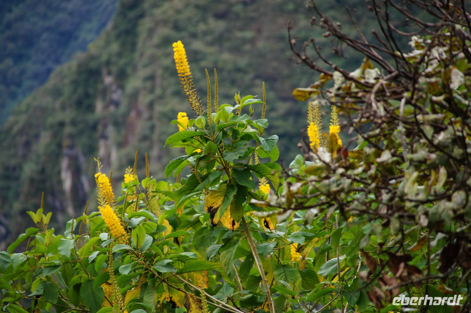 Wir kehren zurück nach Machu Picchu, von den anderen sehen wir nichts mehr. Unser nächstes Ziel ist die Inkabrücke. Ein schmaler Weg führt entlang des Steilhanges des eigentlichen Machu Picchu-Berges dorthin. Machu Picchu liegt eigentlich auf einen Bergrücken zwischen den Gipfeln Machu Picchu und Wayna (oder Huayna) Picchu und auf den meisten Fotos, die man von Machu Picchu kennt, v.a. auf den emblematischen Fotos, liegt der namensgebende Berg im Rücken des Betrachters, wohingegen der Gipfel des Huayna Picchu - sofern nicht vernebelt oder wolkenverhangen - auf allen Fotos zu sehen ist. Wir sind jetzt also auf dem schmalen Steig am Rande des Steilhangs, der zur Inka-Brücke führt. Hin und wieder beobachten wir Vögel oder auch Schmetterlinge, besonders einer, der seine Fressfeinde verwirrt, indem er je nach Flügelschlag blau oder gelb aussieht, fasziniert uns. Aber er ist zu schnell oder weit weg, um ihn auf das Fotopapier zu bannen. Eine Einheimische raunt mir zu, das sei der Machu Picchu-Morpho. Bei der Inernetrecherche später finde ich viele Schmetterlinge der Gattung Morpho, diesen speziellen aber nicht.