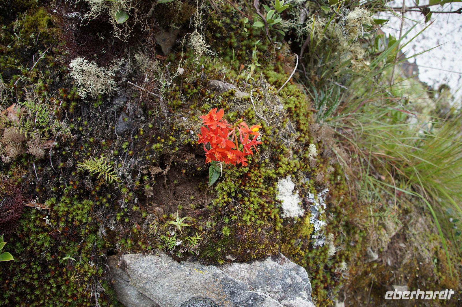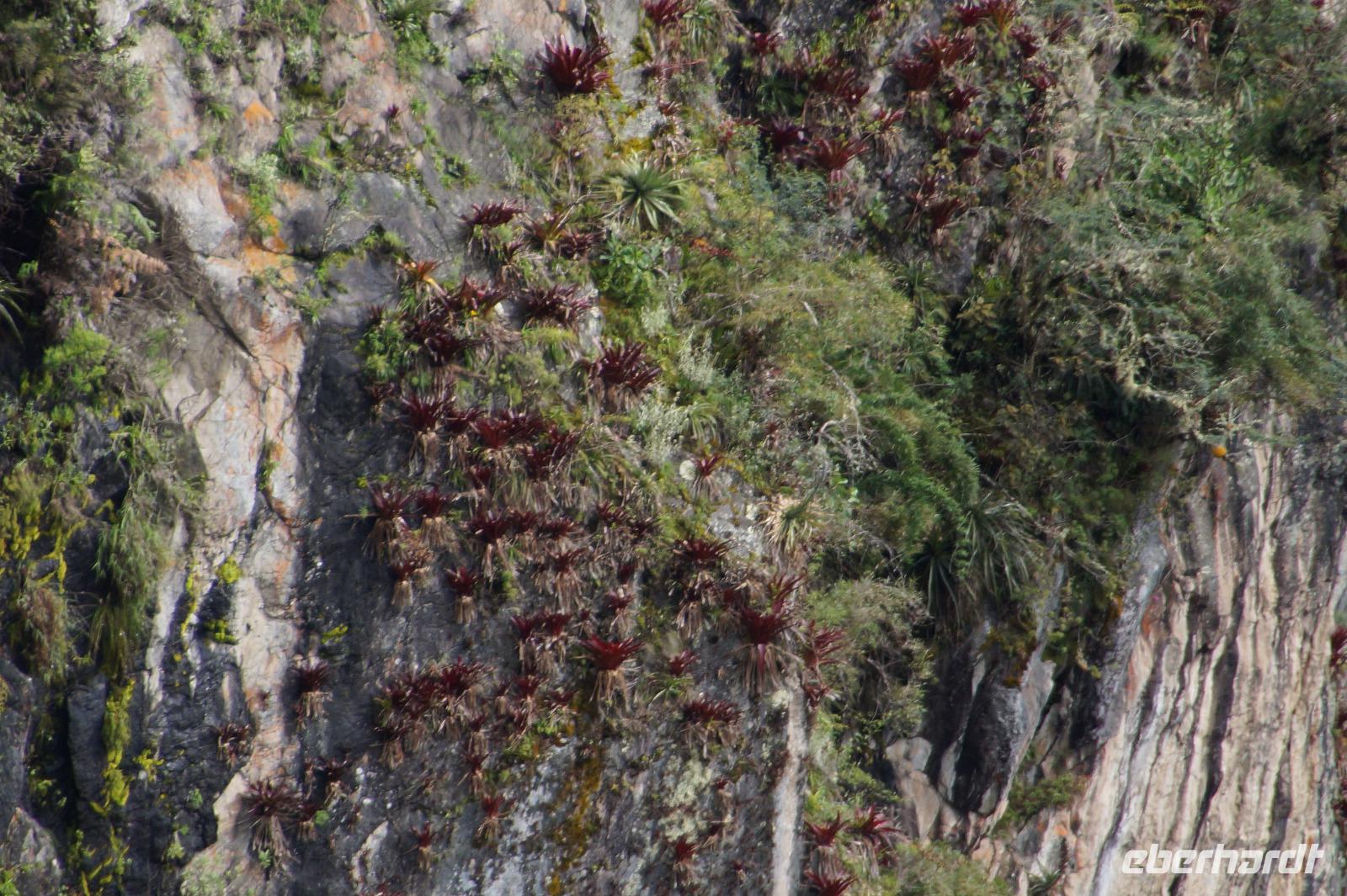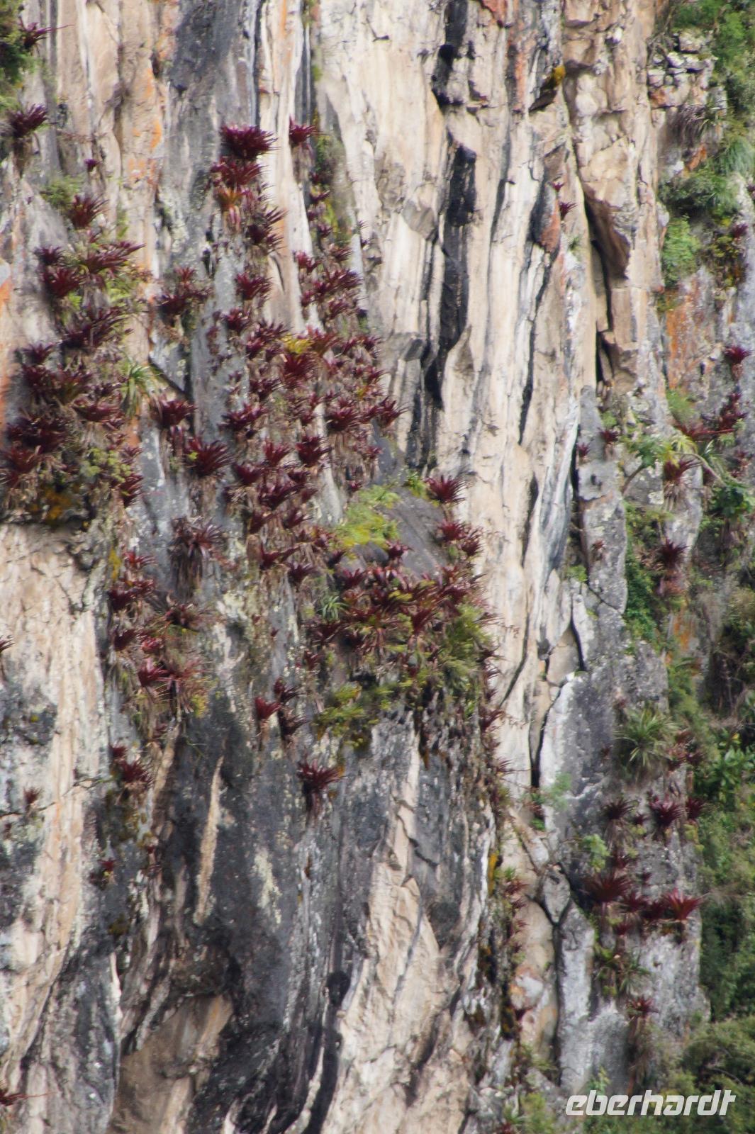 Wir kehren zurück nach Machu Picchu, von den anderen sehen wir nichts mehr. Unser nächstes Ziel ist die Inkabrücke. Ein schmaler Weg führt entlang des Steilhanges des eigentlichen Machu Picchu-Berges dorthin. Machu Picchu liegt eigentlich auf einen Bergrücken zwischen den Gipfeln Machu Picchu und Wayna (oder Huayna) Picchu und auf den meisten Fotos, die man von Machu Picchu kennt, v.a. auf den emblematischen Fotos, liegt der namensgebende Berg im Rücken des Betrachters, wohingegen der Gipfel des Huayna Picchu - sofern nicht vernebelt oder wolkenverhangen - auf allen Fotos zu sehen ist. Wir sind jetzt also auf dem schmalen Steig am Rande des Steilhangs, der zur Inka-Brücke führt. Hin und wieder beobachten wir Vögel oder auch Schmetterlinge, besonders einer, der seine Fressfeinde verwirrt, indem er je nach Flügelschlag blau oder gelb aussieht, fasziniert uns. Aber er ist zu schnell oder weit weg, um ihn auf das Fotopapier zu bannen. Eine Einheimische raunt mir zu, das sei der Machu Picchu-Morpho. Bei der Inernetrecherche später finde ich viele Schmetterlinge der Gattung Morpho, diesen speziellen aber nicht.