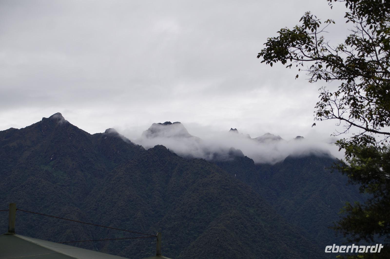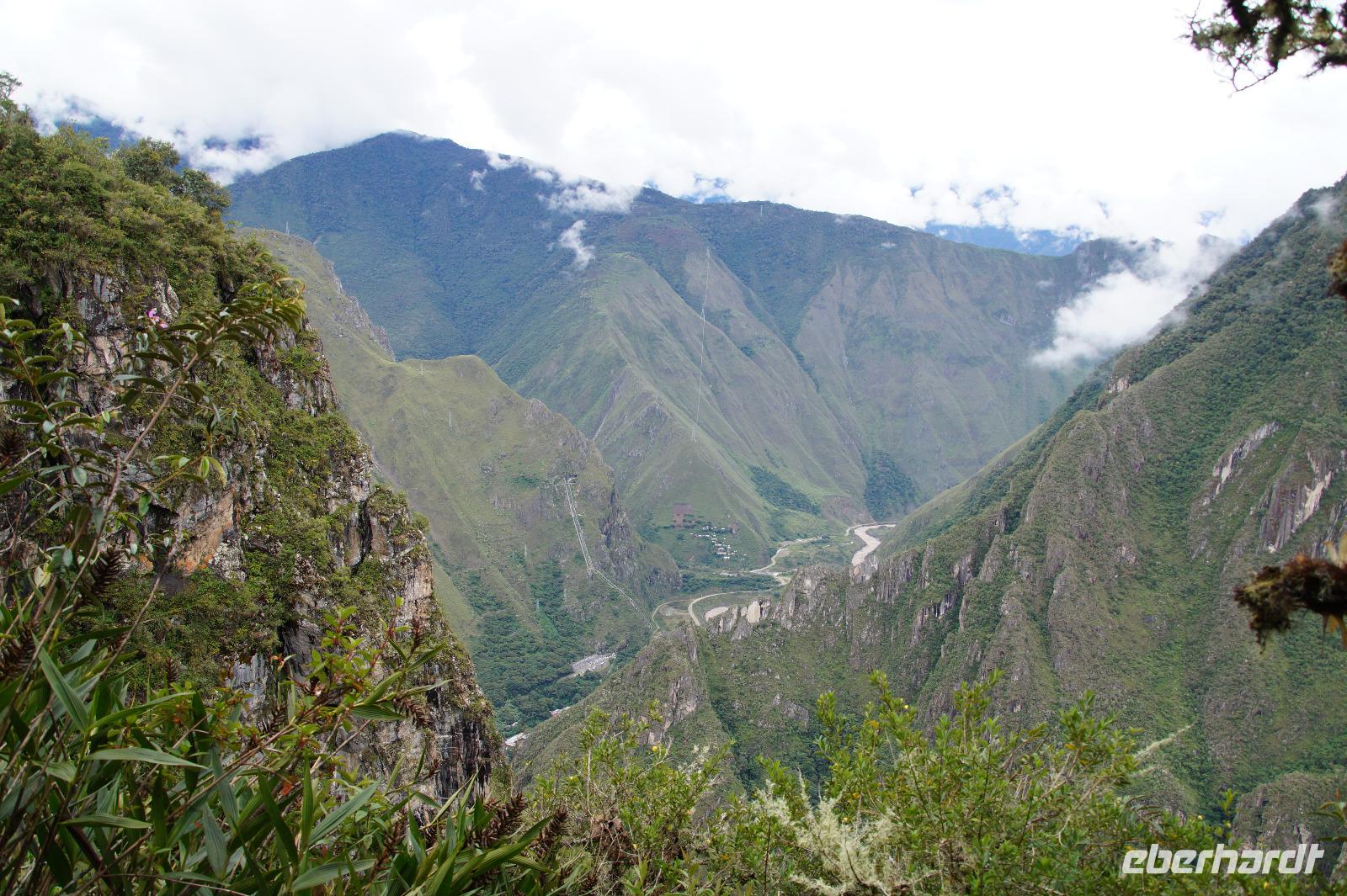 Als ich auch Richtung Ausgang strebe, frage ich einen Aufpasser, wie lange ich wohl zu Fuß bis nach Aguas Calientes bräuchte. Er mustert mich kurz und sagt: "Du? Anderthalb Stunden." Es ist 11:20 Uhr, um 13:00 sind wir an der Bahnstation verabredet. Ich denke mir "das passt" und laufe los. Unterwegs denke ich zwischenzeitlich "oh, oh, das wird nichts mit 13:00 Uhr", aber tatsächlich: Gegen 12:55 bin ich erschöpft aber pünktlich am Bahnhof, der Aufpasser hatte mich gut eingeschätzt. Insgesamt sind die harten Treppen von Machu Picchu nach Aguas Calientes ziemlich anstrengend, sie gehen stark in die Beine, daran haben wir - Elke und Bernd waren ja auch gelaufen - noch zwei Tage später Spaß.