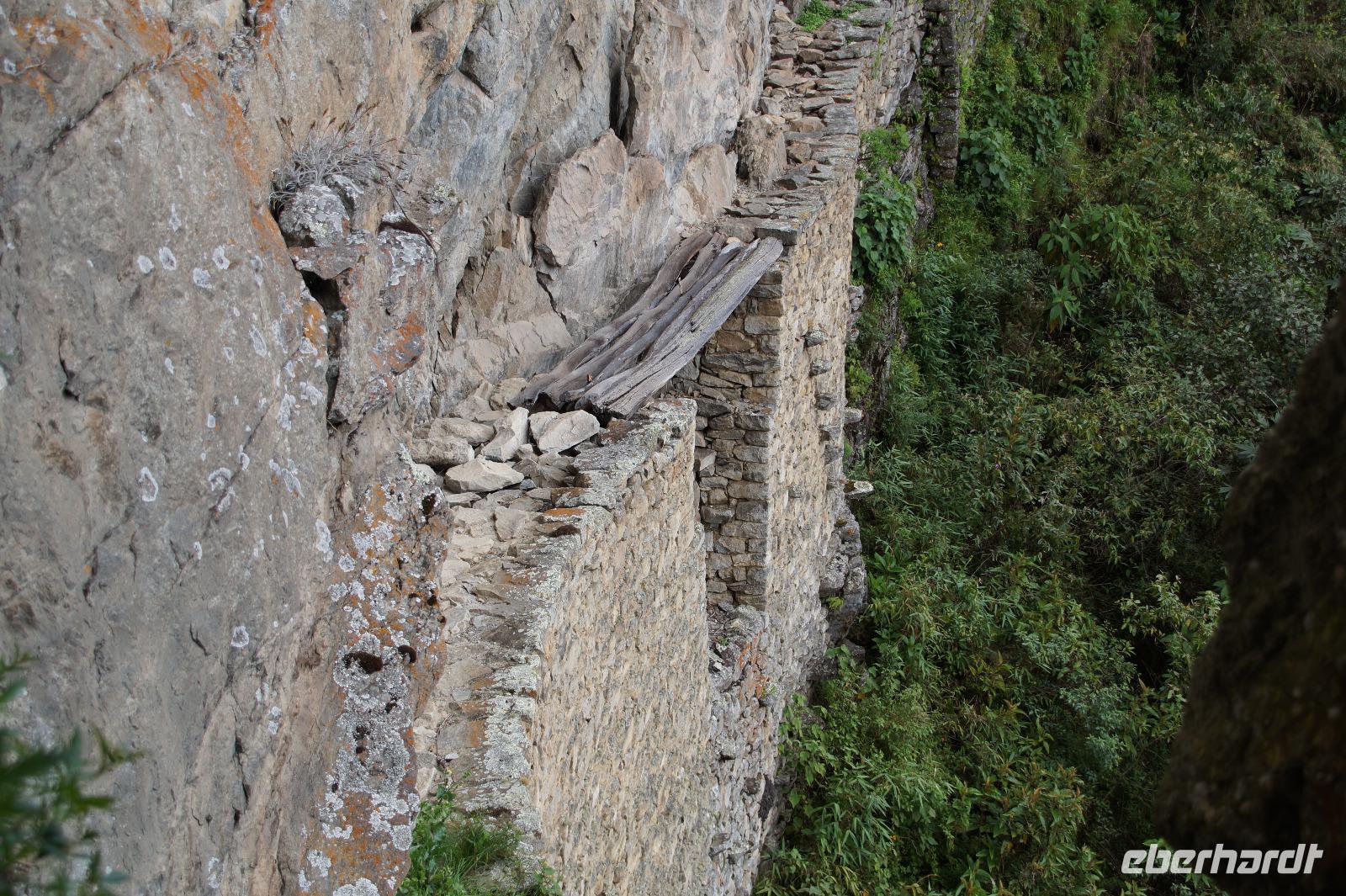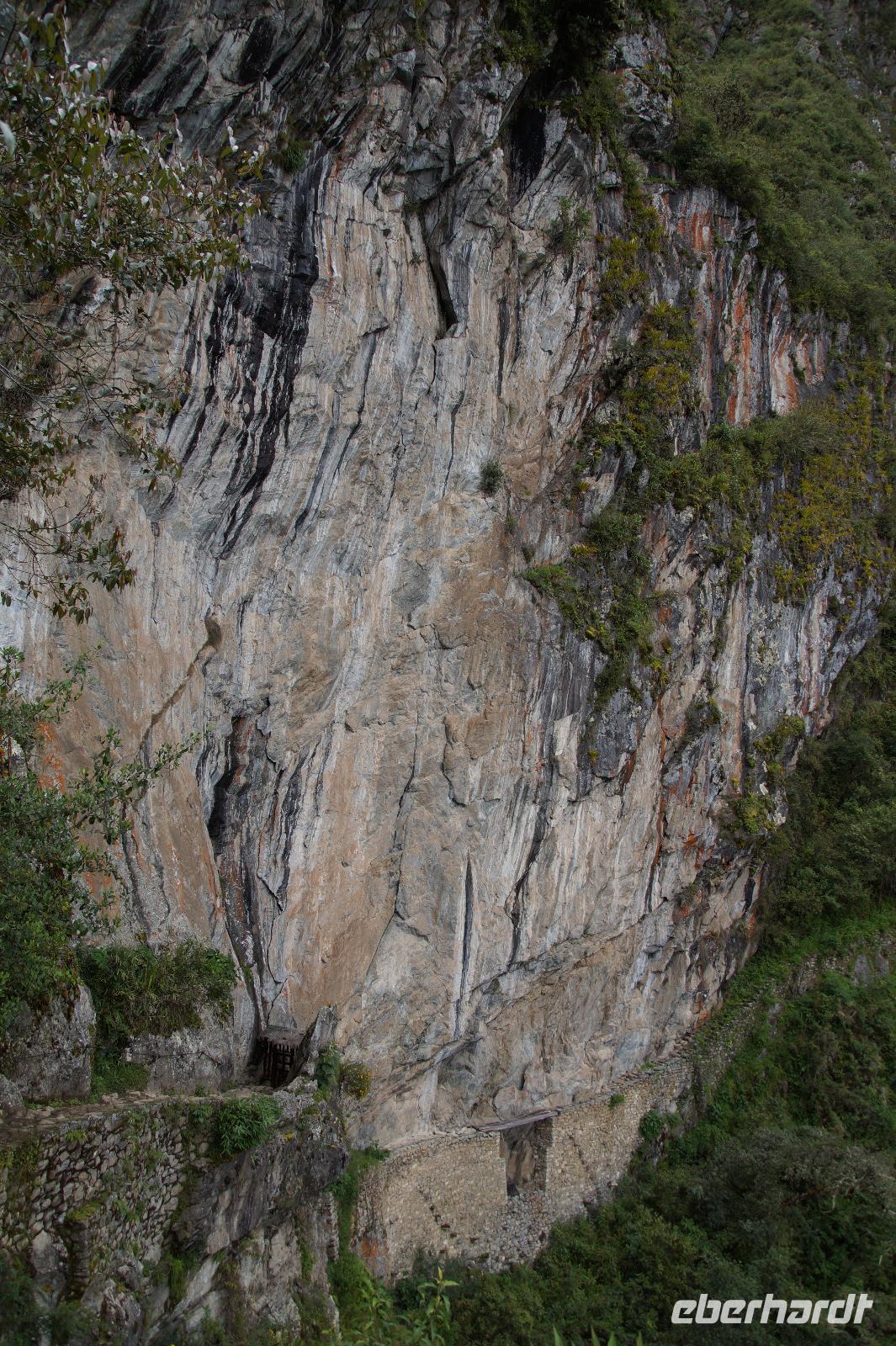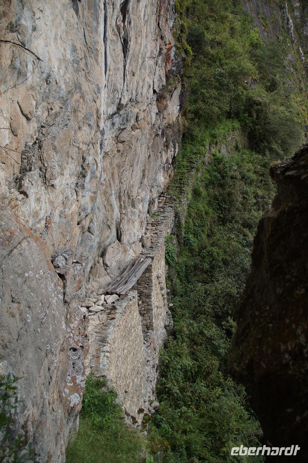 Wir erreichen schließlich die Inka-Brücke, doch der Weg geht hier nicht weiter, ein Tor versperrt die Trasse. Wir wären eh nicht weitergegangen, denn der Weg wird immer schmaler. Die Brücke ist so angelegt, dass einige Holzbretter auf Steinen liegen, sie ist sehr schmal. Für uns, die wir die letzten Meter des Weges bis zur Brücke uns an einer in den Berg getriebenen Kette festhalten, ist es nur schwer vorstellbar, wie vor 600 Jahren Untertanen der Inka mit Lasten, ggf. auch Lamas diesen Weg nutzten. Die Brücke ist jedenfalls so eingerichtet, dass, nimmt man die Bretter weg, der Weg nach Macu Picchu erst mal versperrt ist. Flieht man aus Macu Picchu vor einem Eroberer, kann man die Bretter ebenfalls entfernen und so Zeit gewinnen, bis die Verfolger neue Bohlen zugeschnitten haben.