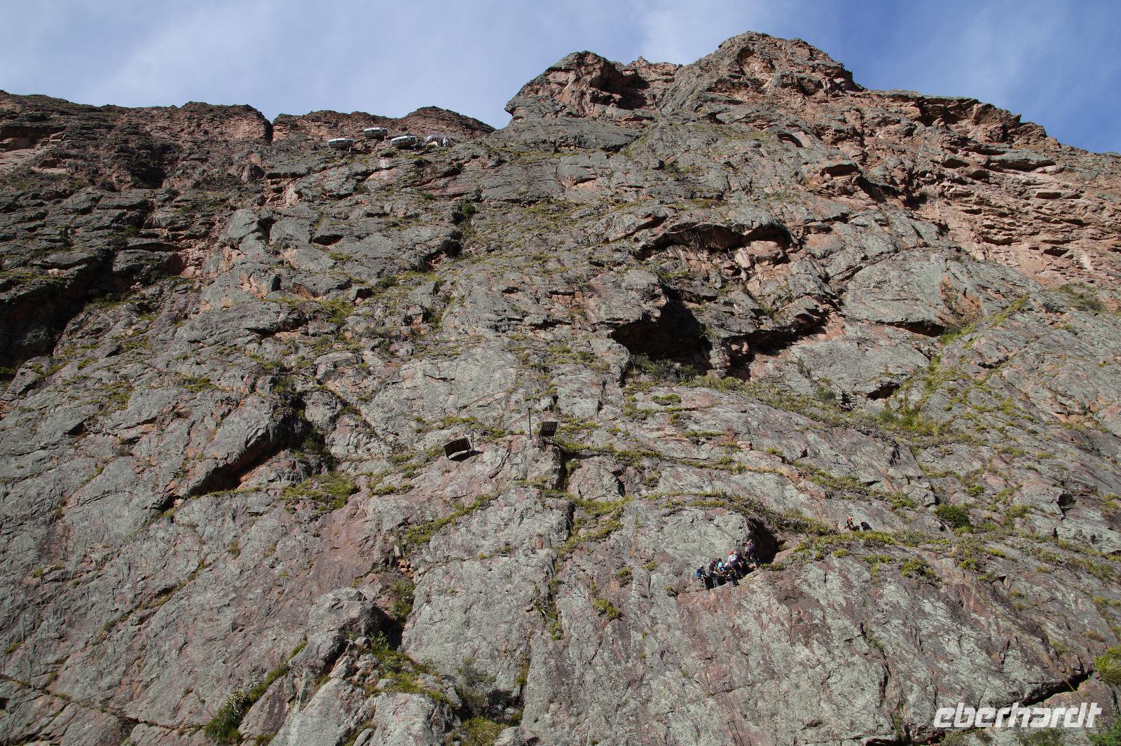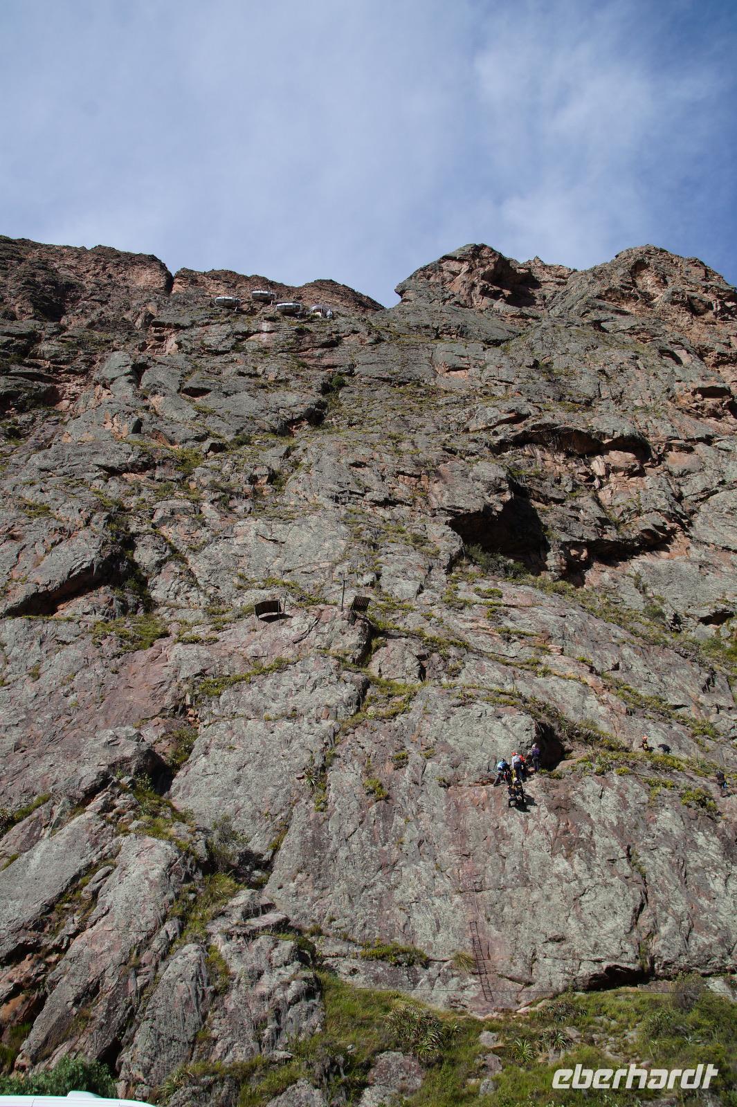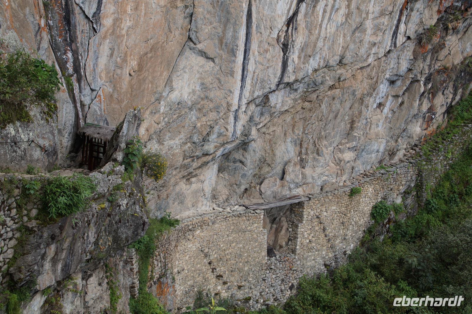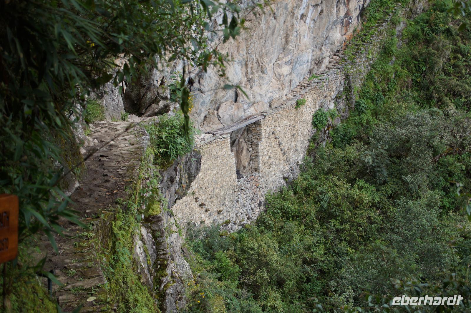 Wir erreichen schließlich die Inka-Brücke, doch der Weg geht hier nicht weiter, ein Tor versperrt die Trasse. Wir wären eh nicht weitergegangen, denn der Weg wird immer schmaler. Die Brücke ist so angelegt, dass einige Holzbretter auf Steinen liegen, sie ist sehr schmal. Für uns, die wir die letzten Meter des Weges bis zur Brücke uns an einer in den Berg getriebenen Kette festhalten, ist es nur schwer vorstellbar, wie vor 600 Jahren Untertanen der Inka mit Lasten, ggf. auch Lamas diesen Weg nutzten. Die Brücke ist jedenfalls so eingerichtet, dass, nimmt man die Bretter weg, der Weg nach Macu Picchu erst mal versperrt ist. Flieht man aus Macu Picchu vor einem Eroberer, kann man die Bretter ebenfalls entfernen und so Zeit gewinnen, bis die Verfolger neue Bohlen zugeschnitten haben.