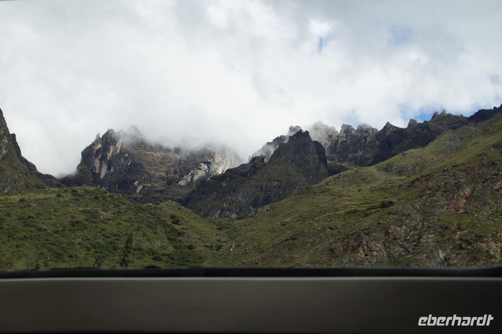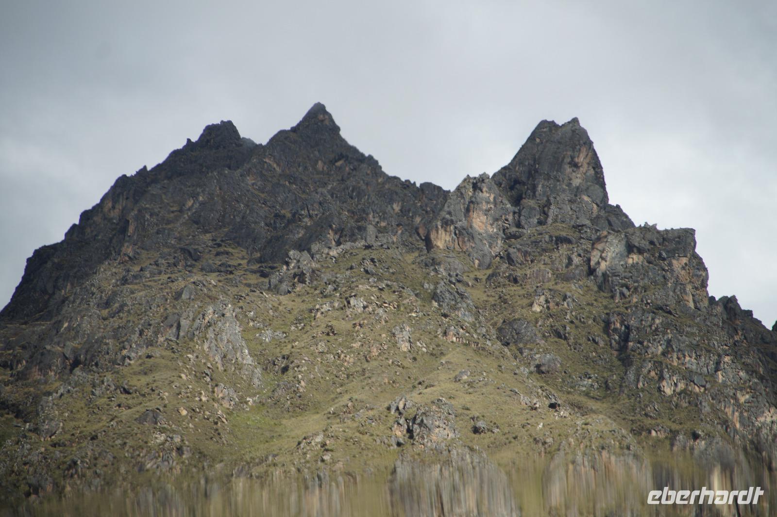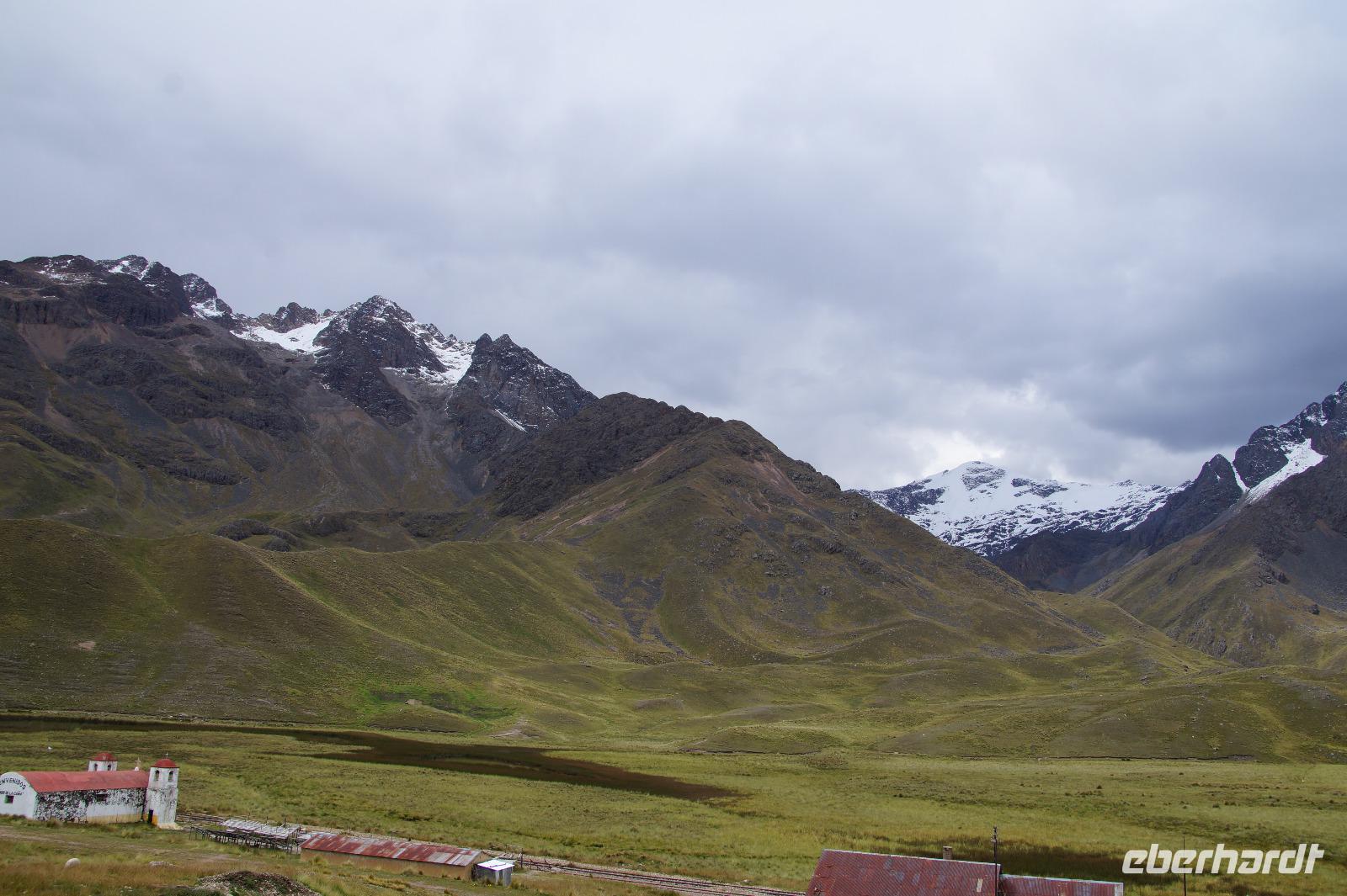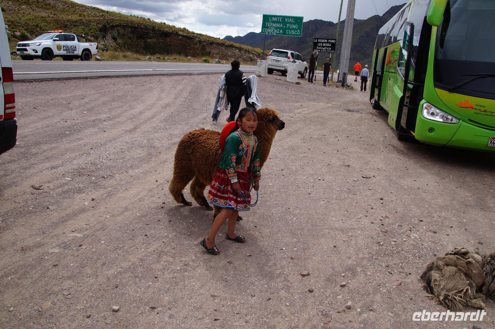 Unser nächstes Ziel ist auch gleichzeitig der höchste Punkt, den wir auf dieser Reise erreichen - wenn man mal von Höhenmetern im Flugzeug absieht. Es ist der La Raya-Pass, der auf 4.335 m NN liegt. In den Schmelzwassern der Gletscher der umliegenden Berge werden die Flüsse geboren, die entweder westwärts zum Pazifik fließen oder sich ostwärts mit vielen anderen Flüssen zum riesigen Netzwerk des Amazonas verbinden. Der Urubamba, den wir bei Machu Picchu als wilden kochenden Strom erlebt haben, beginnt hier als eiskaltes, ruhig dahinfließendes Rinnsal, das hier noch Vilcanota heißt.