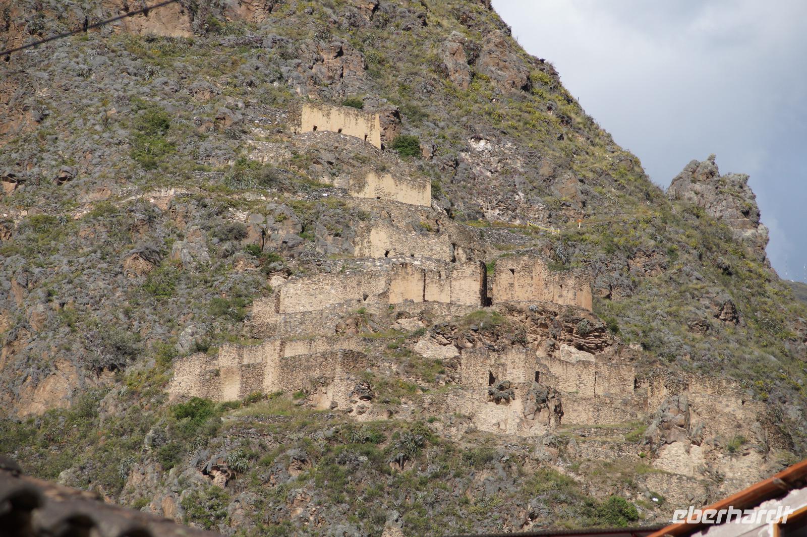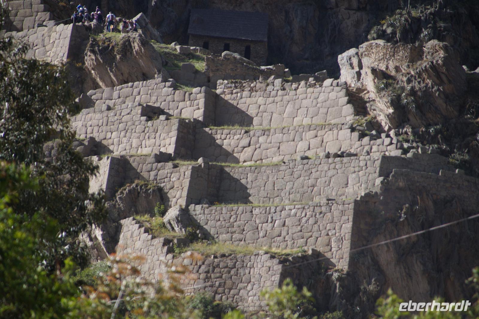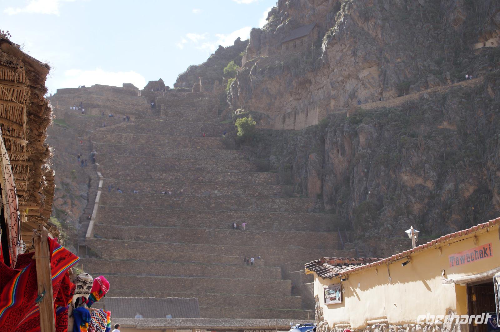Der folgende Morgen führt uns mit reduziertem Gepäck nach Ollantaytambo. Der Ortsname Ollantaytambo ist nicht abschließend geklärt, man weiß soviel, dass der hintere Part -tambo (vom Quechua -tampu) so etwas wie Vorratslager heißt. Ollantay wird auf ein Aymara-Wort zurückgeführt, eine Sprache, die bereits von einer Vorinkakultur aus dem Heiligen Tal verdrängt wurde, und der wir am Titicacasee noch begegnen werden. Ollantay soll Aussichtsposten bedeuten. Der Hybrid bedeutete also gewissermaßen "Aussichtspostenlager". Natürlich, so wie für einen Deutsch- oder Spanischsprecher Ollantaytambo nur ein Ortsname ohne erkennbaren Bedeutungsinhalt ist, so bedeutete der vordere Teil den Quechua ungefähr so viel wie "Lager 'Ollantay'". Obwohl Ollantaytambo ebenfalls über eine beeindruckende Anlage inkaischer (und wohl auch bereits früherer) Herkunft verfügt, ist es für die meisten Passanten - so auch uns - in erster Linie eine Station auf dem Weg nach Machu Picchu. Denn nach Machu Picchu kommt man auf zwei Wegen: Mehrtägiger Fußmarsch mit vereinzelten Gipfelstürmereien über den Inka-Trail (auch dies ist immer mal wieder im Reiseprogramm von Eberhardt Travel enthalten) oder - die meisten Touristen erreichen die lange unentdeckt gebliebene Stadt so - per Zug.