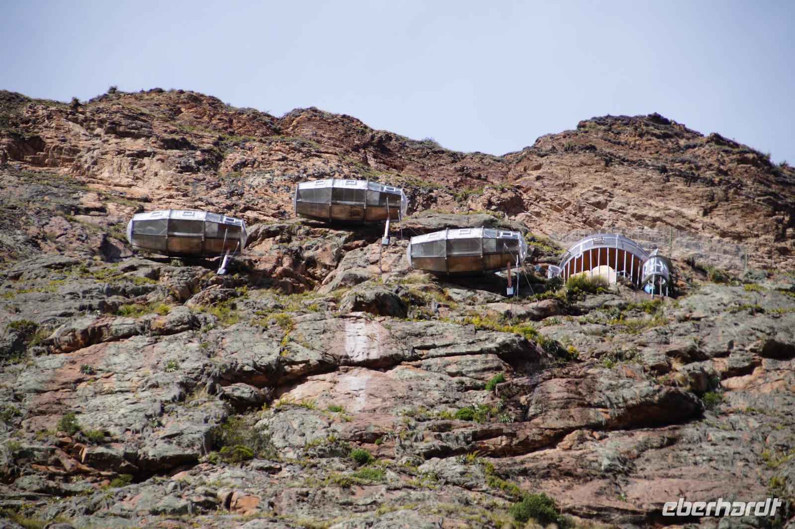 Wir verlassen Ollantaytambo also und fahren in Richtung der Cervecería del Valle Sagrado, der Brauerei des Heiligen Tals. Die liegt zwar nur knapp zehn Minuten Fahrzeit entfernt, aber trotzdem machen wir noch einen Zwischenstopp, nämlich unterhalb der Sky Lodge, eines sehr exklusiven Hotels außerhalb von Ollantaytambo. Eigentlich liegt die Brauerei auch schon direkt hinter der nächsten Kurve.