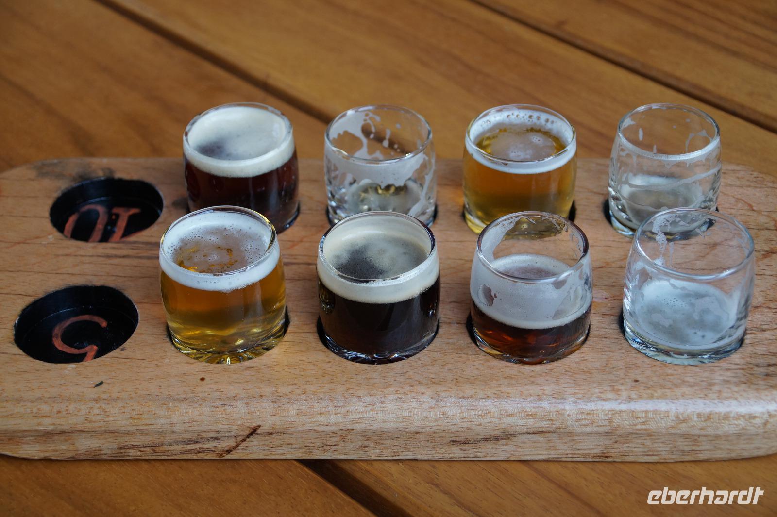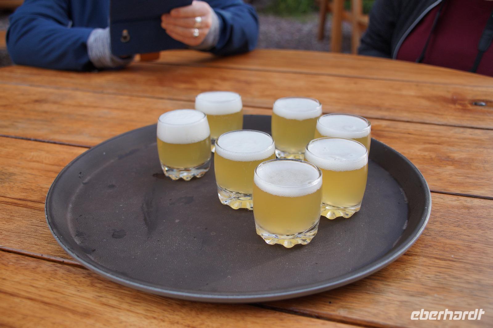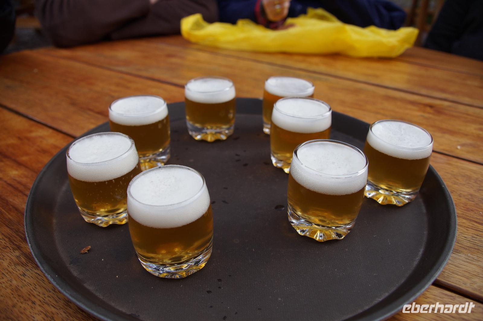 Wir bekommen nun jeder fünf Bier in Probegläsern gereicht, verschiedene Lagertypen, ein Porter, jedes mit einem höheren Alkoholgehalt, und dürfen uns am Ende unser Lieblingsbier aussuchen. Da gibt man uns ganz britisch dann noch ein Half Pint [ha:f paint] obenauf.