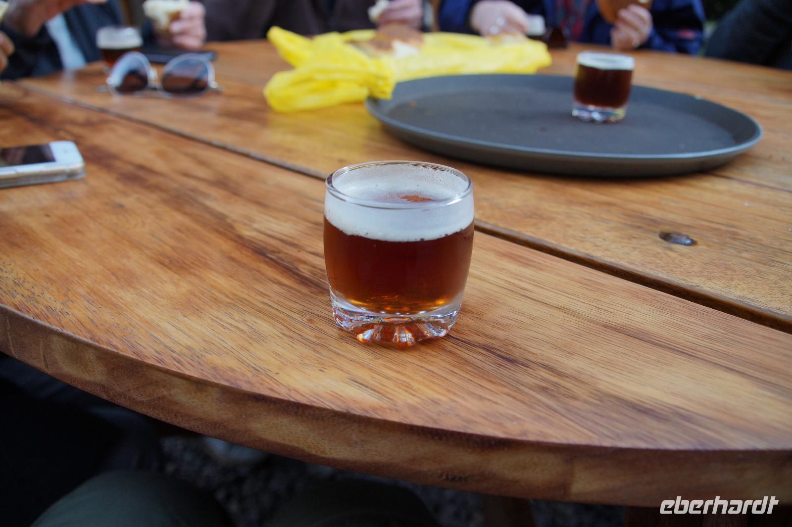 Neben der ökologischen probiert sich die Brauerei auch in sozialer Nachhaltigkeit, denn im Grunde ist die Brauerei das Ergebnis aus dem Umstand, dass ihre Gründer ihr Hobby ausleben, um Nonprofitprojekte zu unterstützen, etwa solche zur Gleichstellung peruanischer Mädchen oder zur Umwelterziehung. Der Gewinn, den die Bauerei abwirft, wird also in die Brauerei selbst oder in die Gesellschaft der direkten Umgebung reinvestiert. Wir bekommen nun jeder fünf Bier in Probegläsern gereicht, verschiedene Lagertypen, ein Porter, jedes mit einem höheren Alkoholgehalt, und dürfen uns am Ende unser Lieblingsbier aussuchen. da gibt man uns ganz britisch dann noch ein Half Pint [ha:f paint] obenauf.