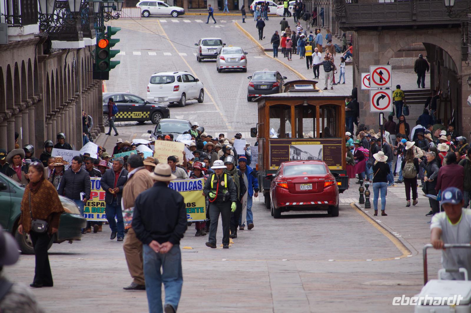 Wir fahren indes weiter und steigen beim Franziskanerkloster aus: Hier findet eine kleine Demo statt. Es sind die Pensionisten der Militärpolizei, die für eine Rentenerhöhung streiken.