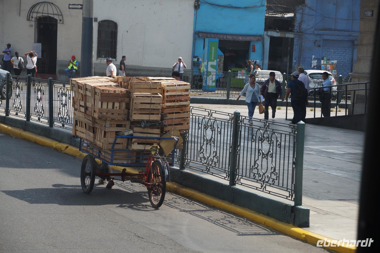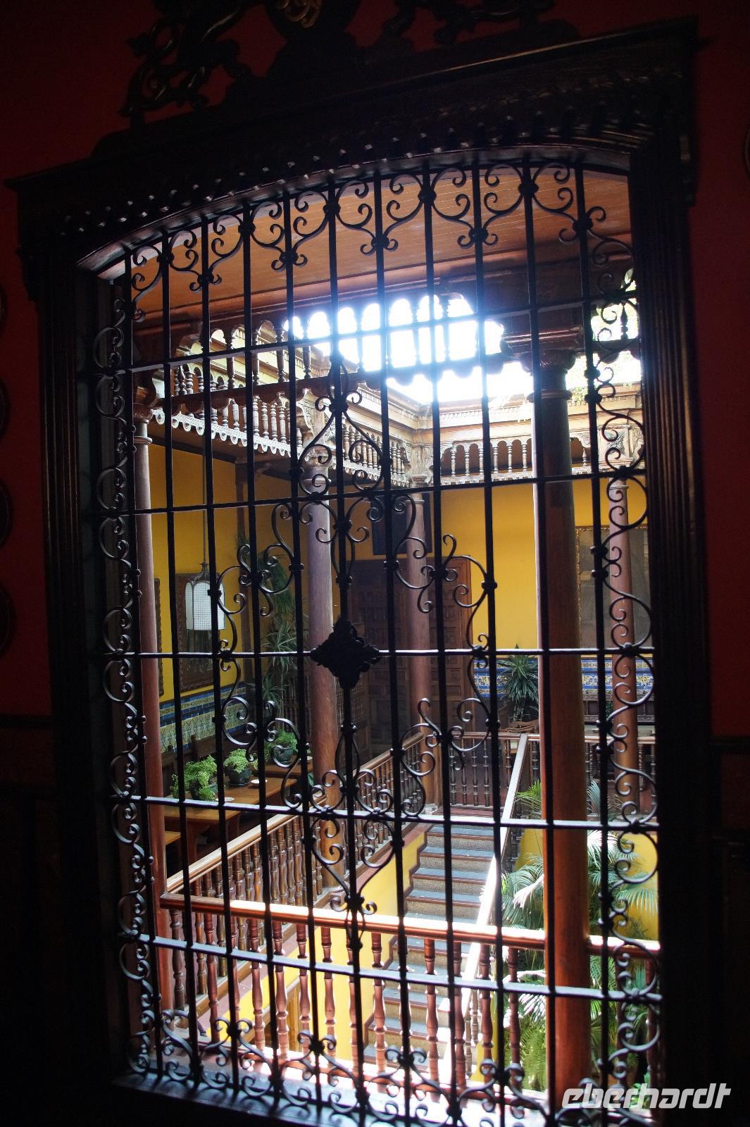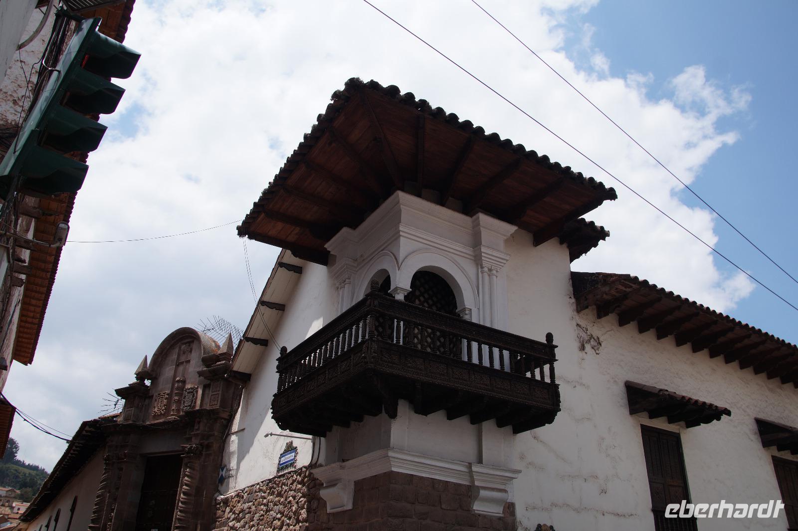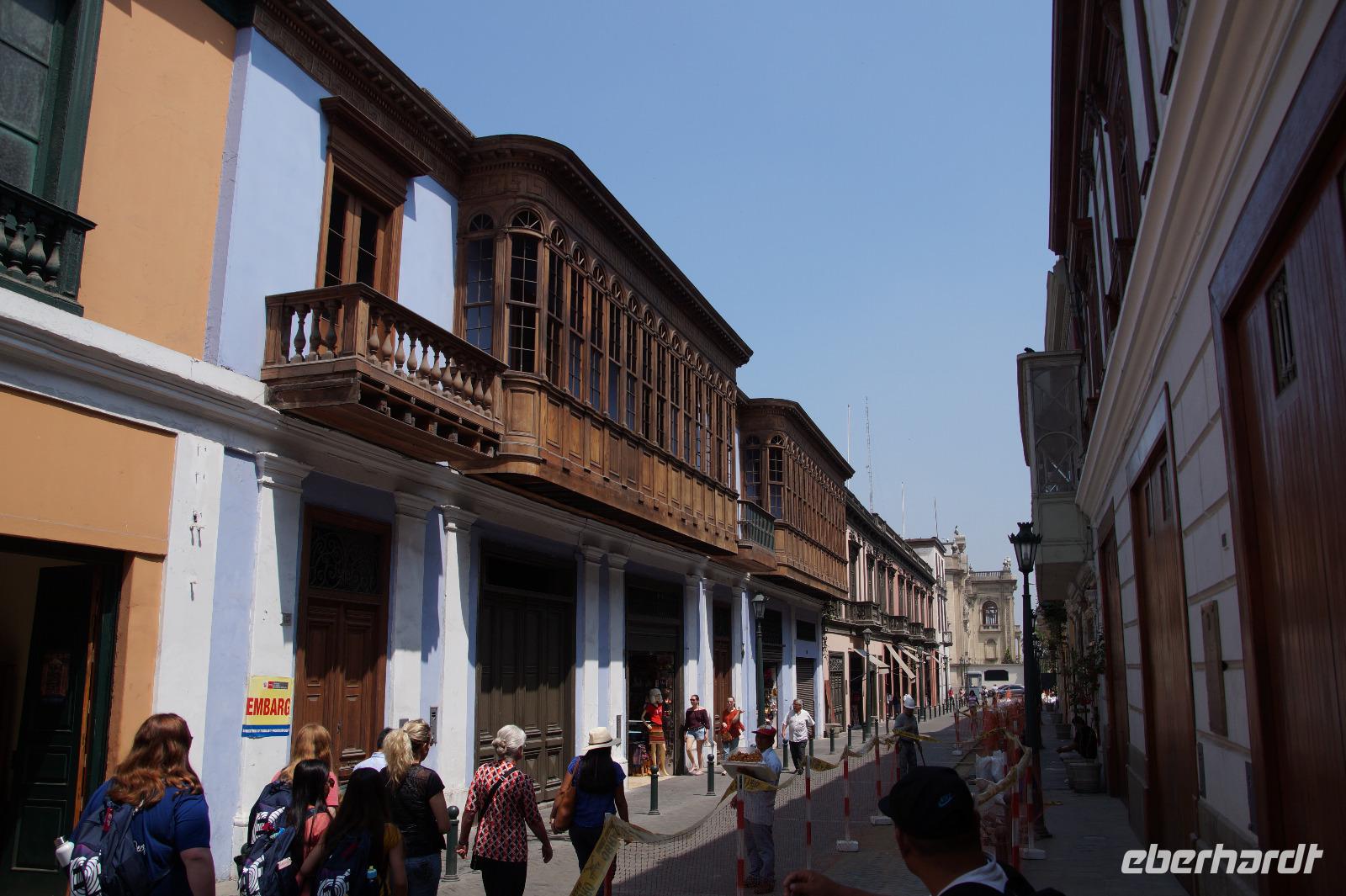 Bei den celosías handelt es sich um ein spanisches Erbe aus der Maurenzeit. Die Balkone sind geschlossene Kästen, nicht offen, wie wir sie kennen. Bei den celosías handelt es sich um Holzgitter, welche den Blick von der Straße auf den Balkon und das dahinterliegende Zimmer verhindern, aber dem- oder derjenigen, der oder die auf dem Balkon steht, erlauben, das Geschehen auf der Straße zu verfolgen. In al-Andalus waren sie ursprünglich in den oberen Etagen der Innenhöfe der Paläste angebracht, wo die andalusischen adeligen Damen auf diese Weise teil am Geschehen im Hof nehmen konnten, ohne ihrerseits gesehen zu werden. Hier in Perú befinden sie sich an der Außenseite der Häuser.