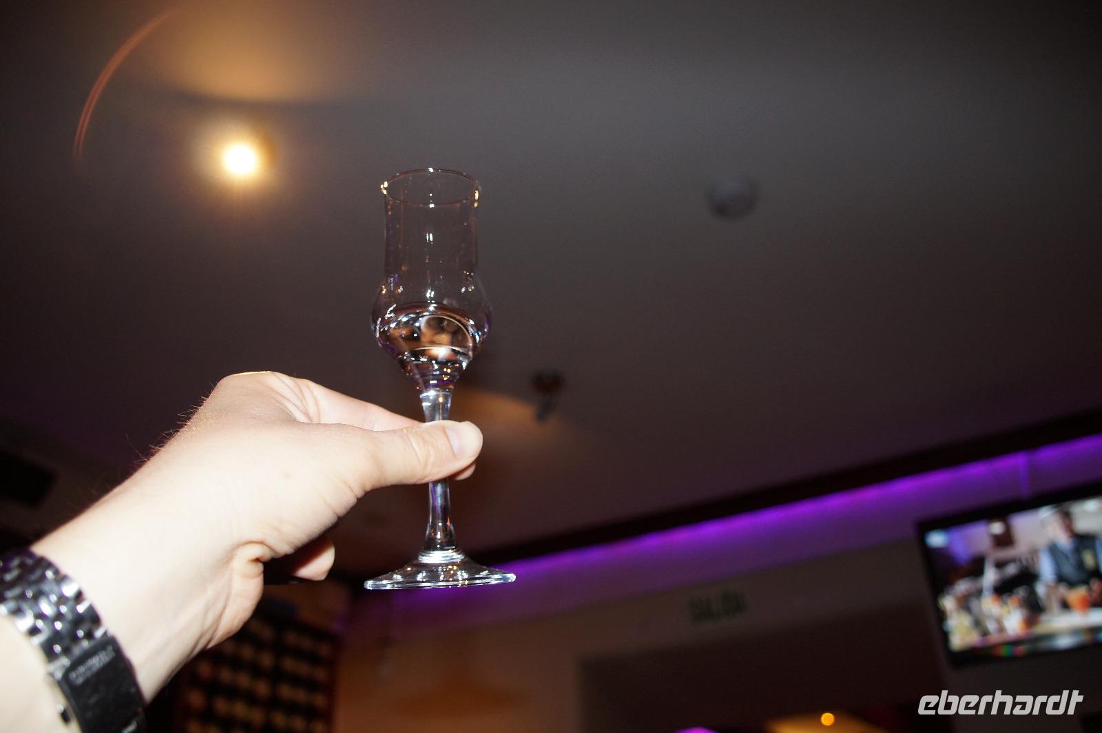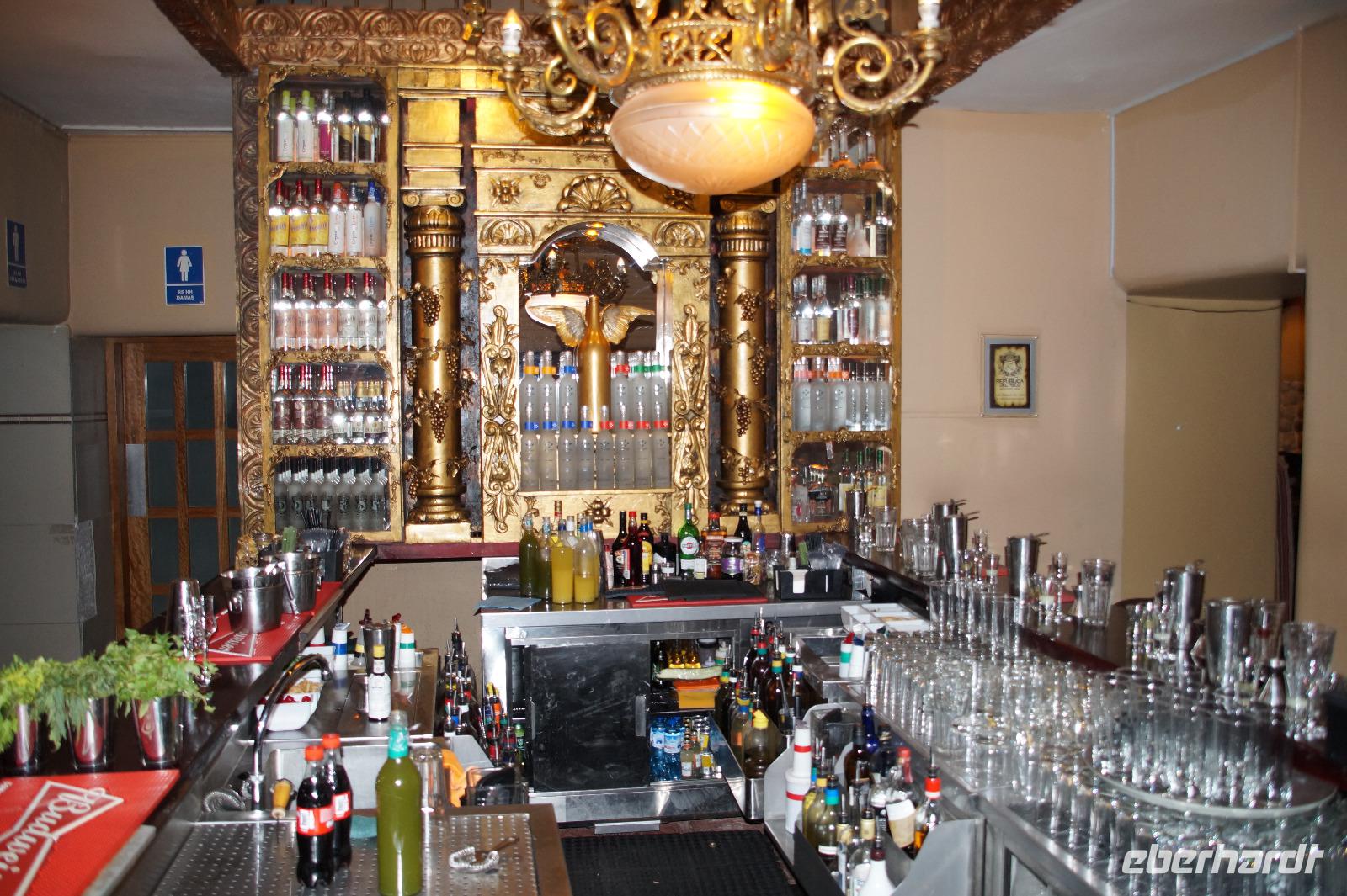 ... Falsch gedacht! Unsere Lehrerin reicht uns einen Eiswürfelbehälter und Zangen, wir sollen jetzt, damit sich das Eiklar nicht mit dem Rest verbindet, erst einmal sieben oder acht Eiswürfel in den Shaker geben. Die meisten nehmen acht Eiswürfel, ich nur sieben, man will sich seinen Pisco ja nicht verwässern. Jetzt geben wir die Unze Eiklar auf die Eiswürfel und bekommen ein Caipirinhaglas. Das sollen wir kopfüber auf den Cocktailshaker drücken und einmal kräftig auf den Glasboden schlagen. Nachdem wir das getan haben, prüfen wir, ob es dicht sitzt und keine Flüssigkeit zu den Rändern rauskommt, wenn man den Shaker kippt. Die Gläser sitzen dicht. Jetzt ist unsere Muskelkraft und Audauer gefragt, es geht ans shaken. Eine Hand an den Shaker, die zweite Hand ans Glas und kräftig geschüttelt. Wir schütteln so lange, bis durch das Caipirinhaglas zu sehen ist, dass der Getränkemix im Glas weiß ist. Fast fertig. Jetzt müssen wir den Pisco Sour ins Trinkglas umgießen. Nur - ¡verdammt! - das Caipirinhaglas sitzt fest im Cocktail Shaker. Ich glaube, ich sehe ein leicht diabolisches Grinsen unmerklich die Lippen unserer Lehrerin umspielen. Oder macht das nur das schummrige Licht der Bar? Sie nimmt einen unserer Shaker und schlägt mit dem Handballen vor die Stelle, wo das Caipi-Glas im Shaker klemmt. Man hört so etwas wie einen Schmatzer. Etwas skeptisch machen wir es ihr nach und nach ein bis drei Schlägen hat tatsächlich jeder das Caipi-Glas gelockert und kann es rausnehmen. Jetzt sollen wir mit zwei Fingern den Strainer - als den Abseiher - auf dem Shaker fixieren und seihen den Pisco in das bereit gestellte Trinkglas ab, so trennen sich am Ende Flüssigkeit und Eischnee wieder voneiander, der Eischnee kommt zuletzt als Schaumkrone oben auf den Pisco, wie es sich für einen Sour gehört. Jetzt bekommt jeder noch ein oder zwei Spritzer Angosturabitter auf seinen Pisco und wir gehen zurück zu Tisch.