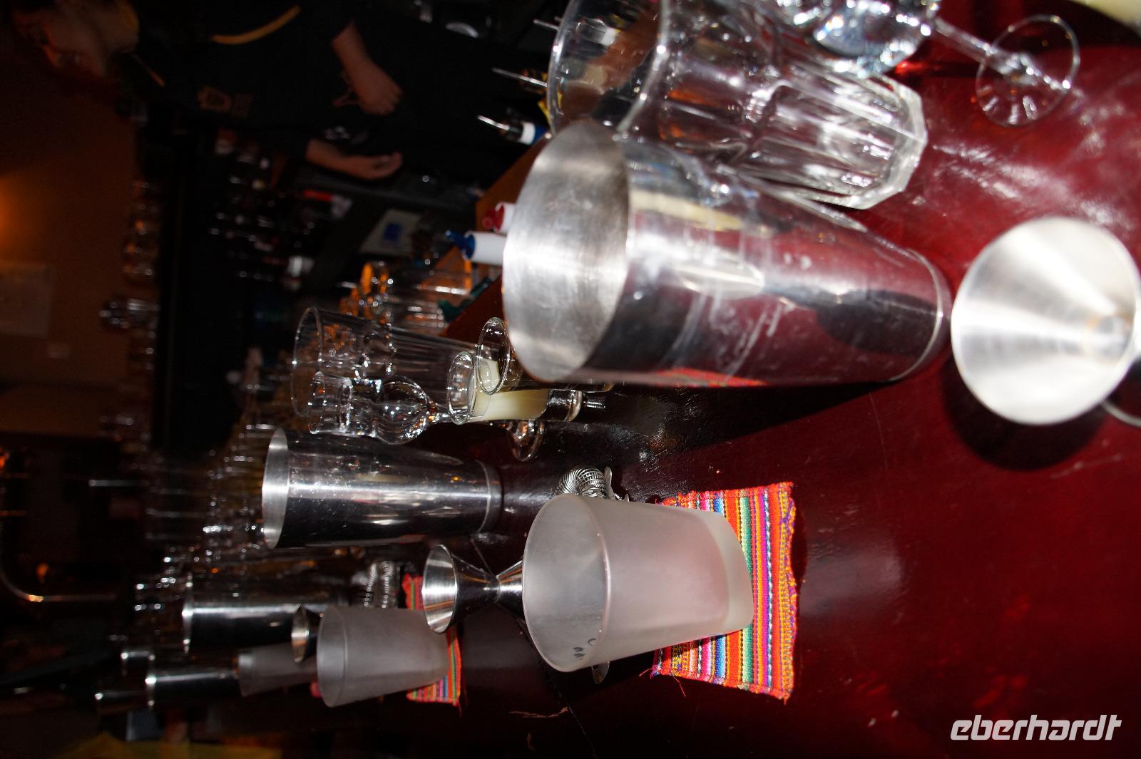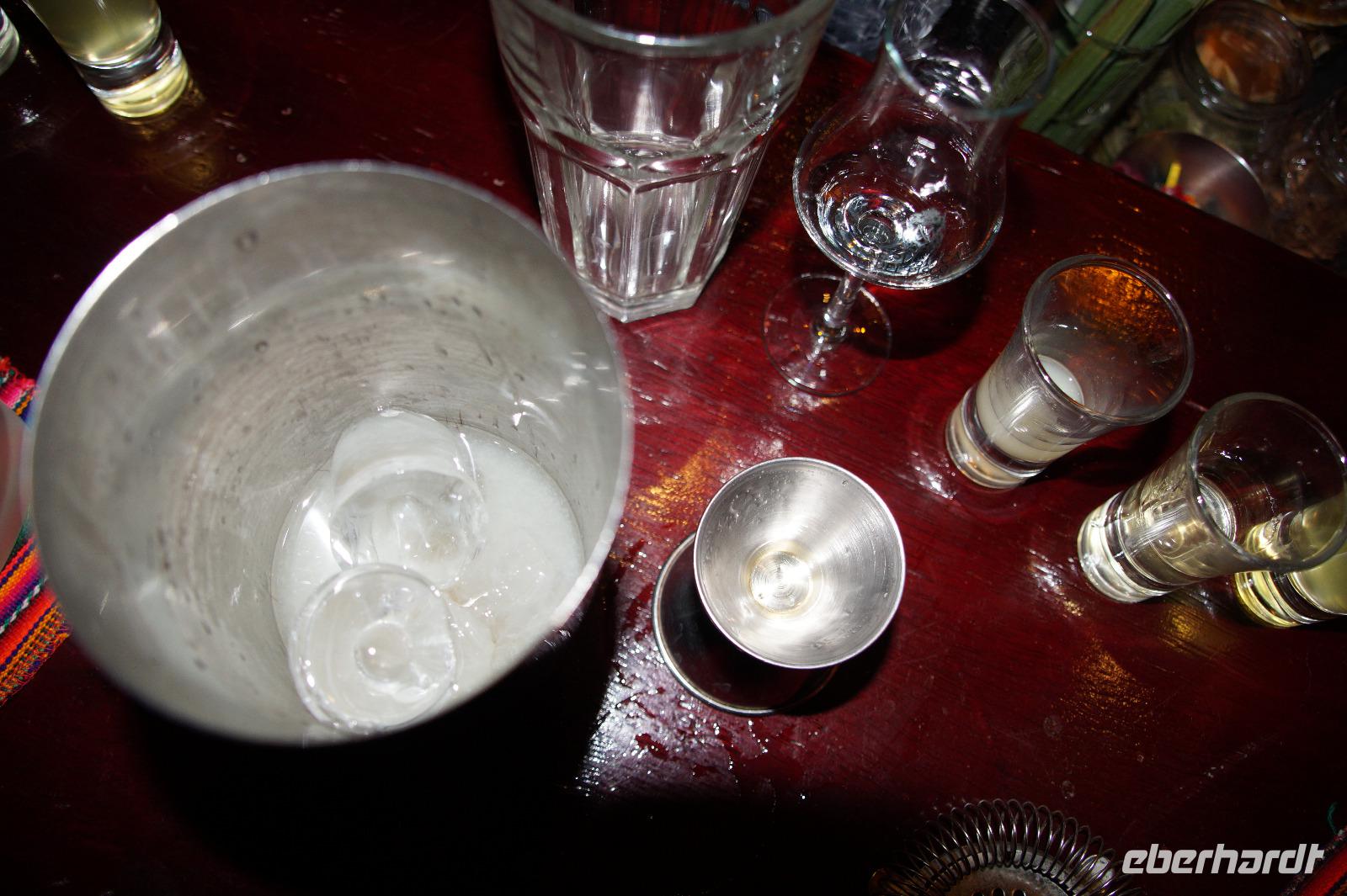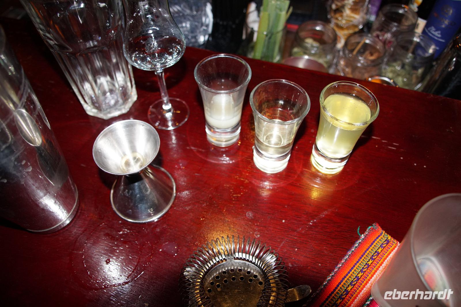 18:00 Uhr treffen wir uns also, um gemeinsam zur República del Pisco zu gehen, einem Restaurant und Bar. Zwei bleiben zurück, sie wollen an diesem Tag nicht mehr raus. Der Rest testet sich zunächst durch vier Sorten Pisco, einem Weinbrand aus fermentiertem Traubenmost, und schließlich mixen wir unter Anleitung der Barfrau unseren eigenen Pisco Sour. Vor uns haben wir einen Cocktail Shaker stehen, ein Glas, ein kegelförmiger Messbecher, das auf der einen Seite eine Unze auf der anderen Seite zwei Unzen umfasste sowie einen Strainer ("Abseiher"). Zudem haben wir vor uns stehen: Pisco, Zuckersirup, Limettensaft und Eiklar.