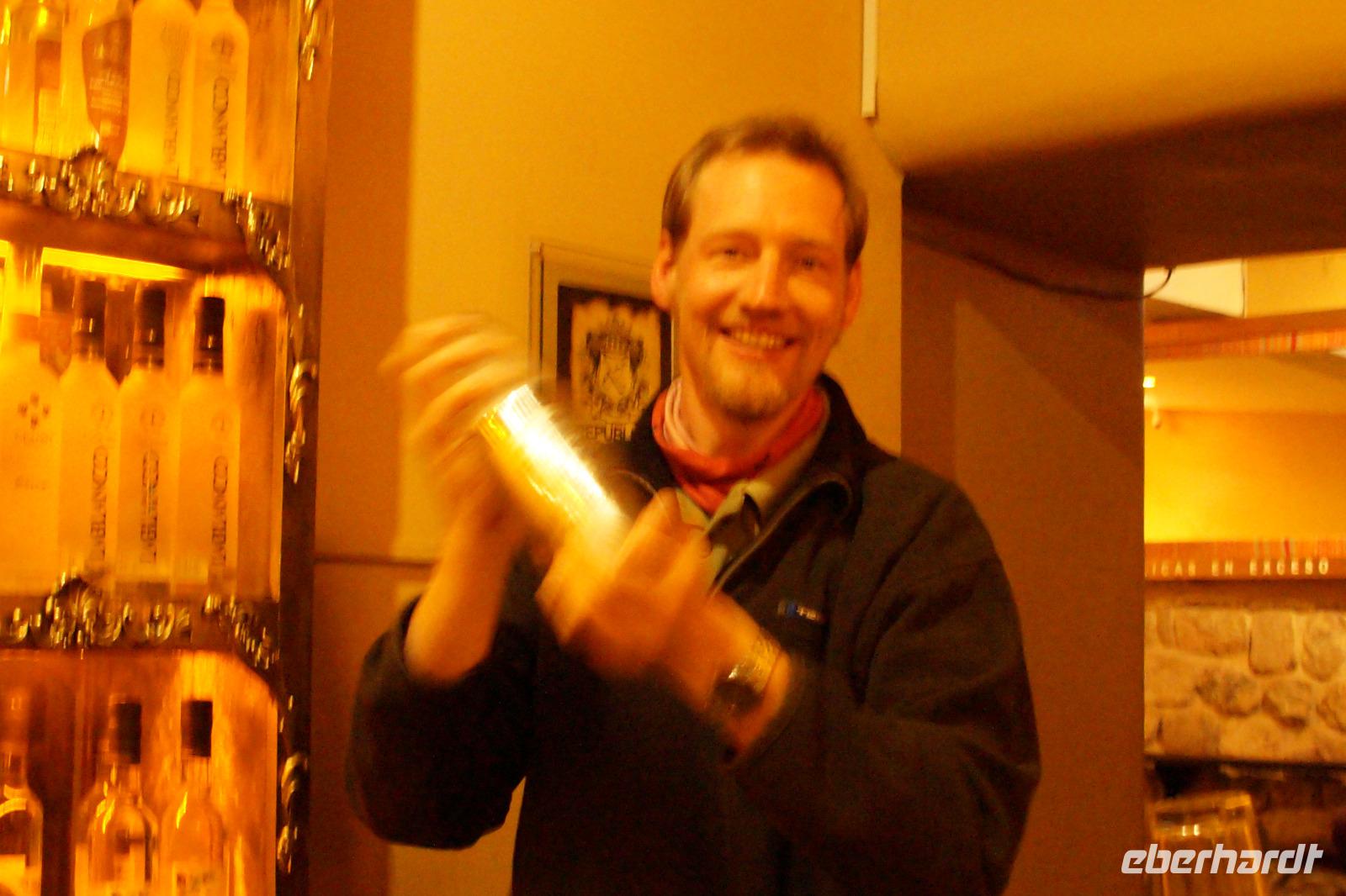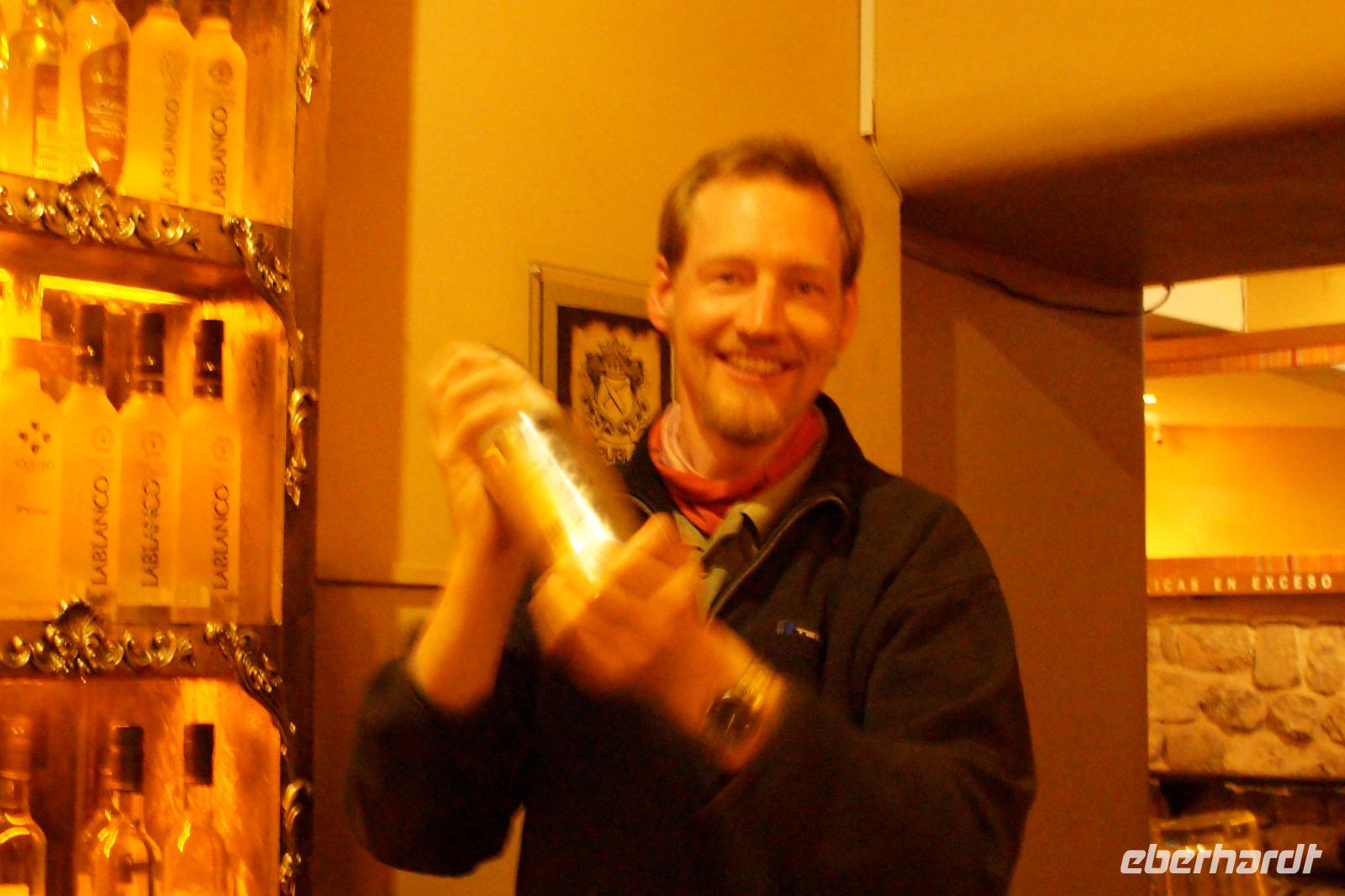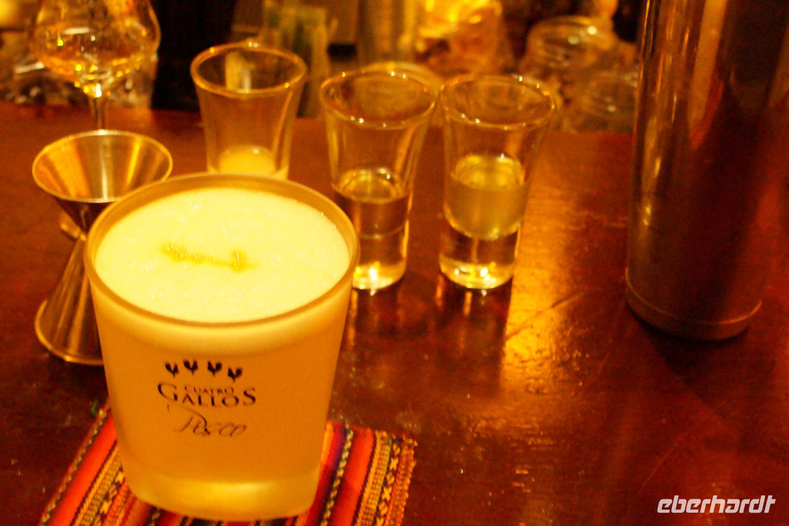 18:00 Uhr treffen wir uns also, um gemeinsam zur República del Pisco zu gehen, einem Restaurant und Bar. Zwei bleiben zurück, sie wollen an diesem Tag nicht mehr raus. Der Rest testet sich zunächst durch vier Sorten Pisco, einem Weinbrand aus fermentiertem Traubenmost, und schließlich mixen wir unter Anleitung der Barfrau unseren eigenen Pisco Sour.
