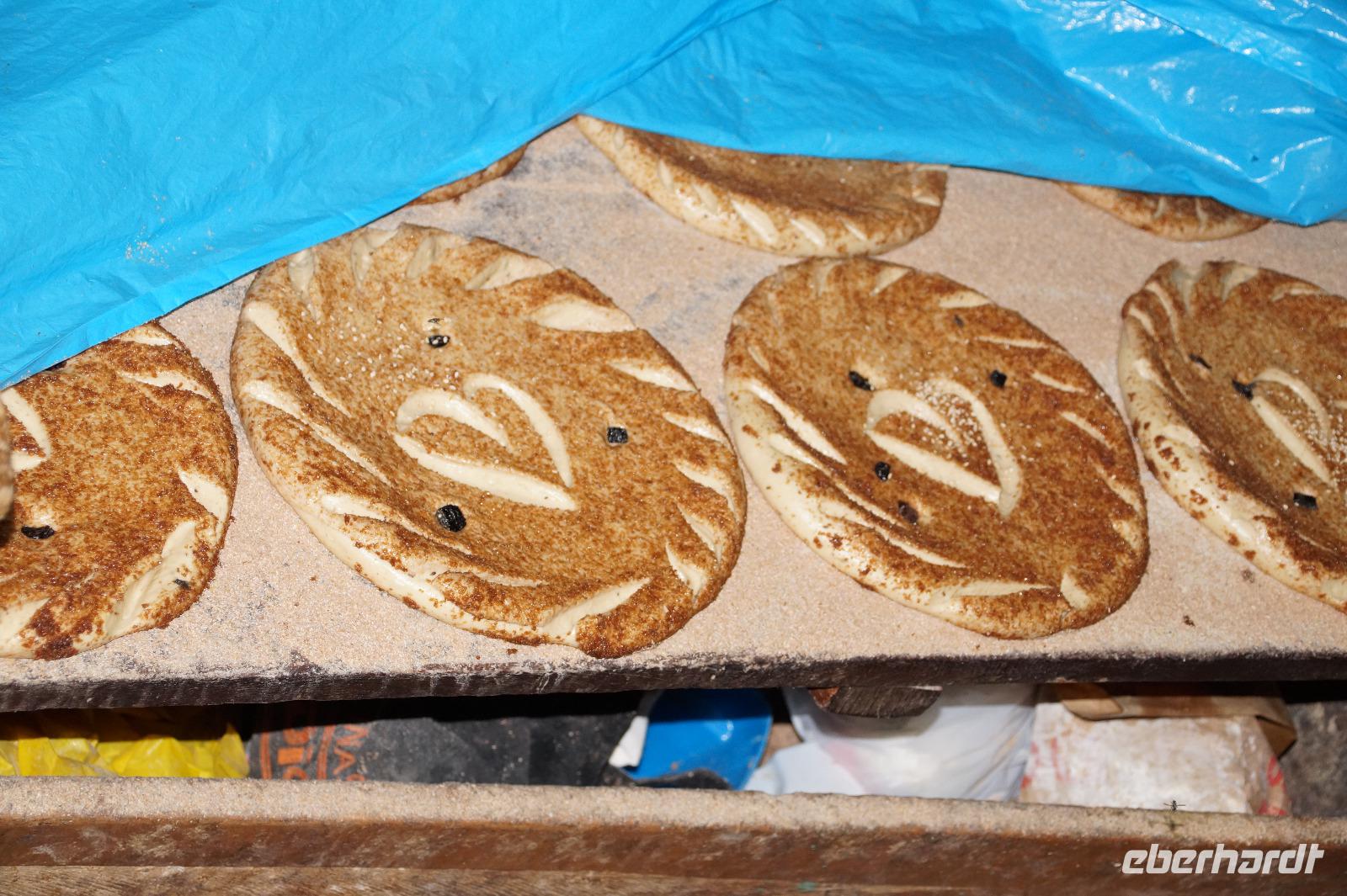 Mijaíl, die gelernte Journalistin ist, stellt den Bäckerinnen einige Fragen, welche diese beantworten. Wir erfahren, dass sie ihr Tagwerk jetzt vollbracht haben und mit der Arbeit (fast) fertig sind (ein bisschen Teig geht noch, mindestens eine Fuhre muss also noch in den Ofen). Allerdings müssen sie jetzt noch die Hausarbeit machen. Gerade die junge Frau - sie gibt ihr Alter mit 30 an, ob die ältere ihre Mutter oder Schwiegermutter ist, erfahren wir nicht - hat mehrere Kinder und muss sich kümmern. Sie gingen gegen 22:00 Uhr ins Bett. Und um 2:00 stehen sie morgen wieder in der Backstube. Sie seien daran gewöhnt, erwidern sie unser Erstaunen. Als Gegenleistung dafür, dass sie uns einen Einblick nicht nur in ihren Arbeitsalltag, sondern ein wenig auch in ihr Privatleben gegeben haben, erzählt Mijaíl ihnen ein wenig aus ihrem Leben, von ihren Töchtern etc. Damit sich die beiden Bäckersfrauen nicht so ausgefragt fühlen, erklärt sie mir.