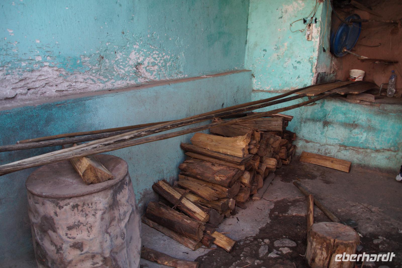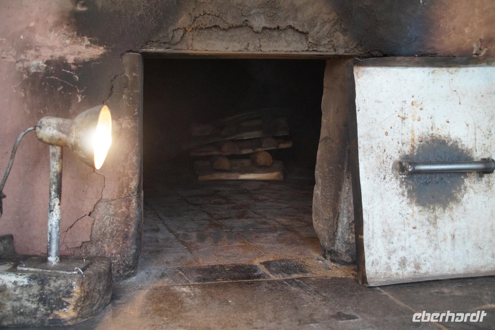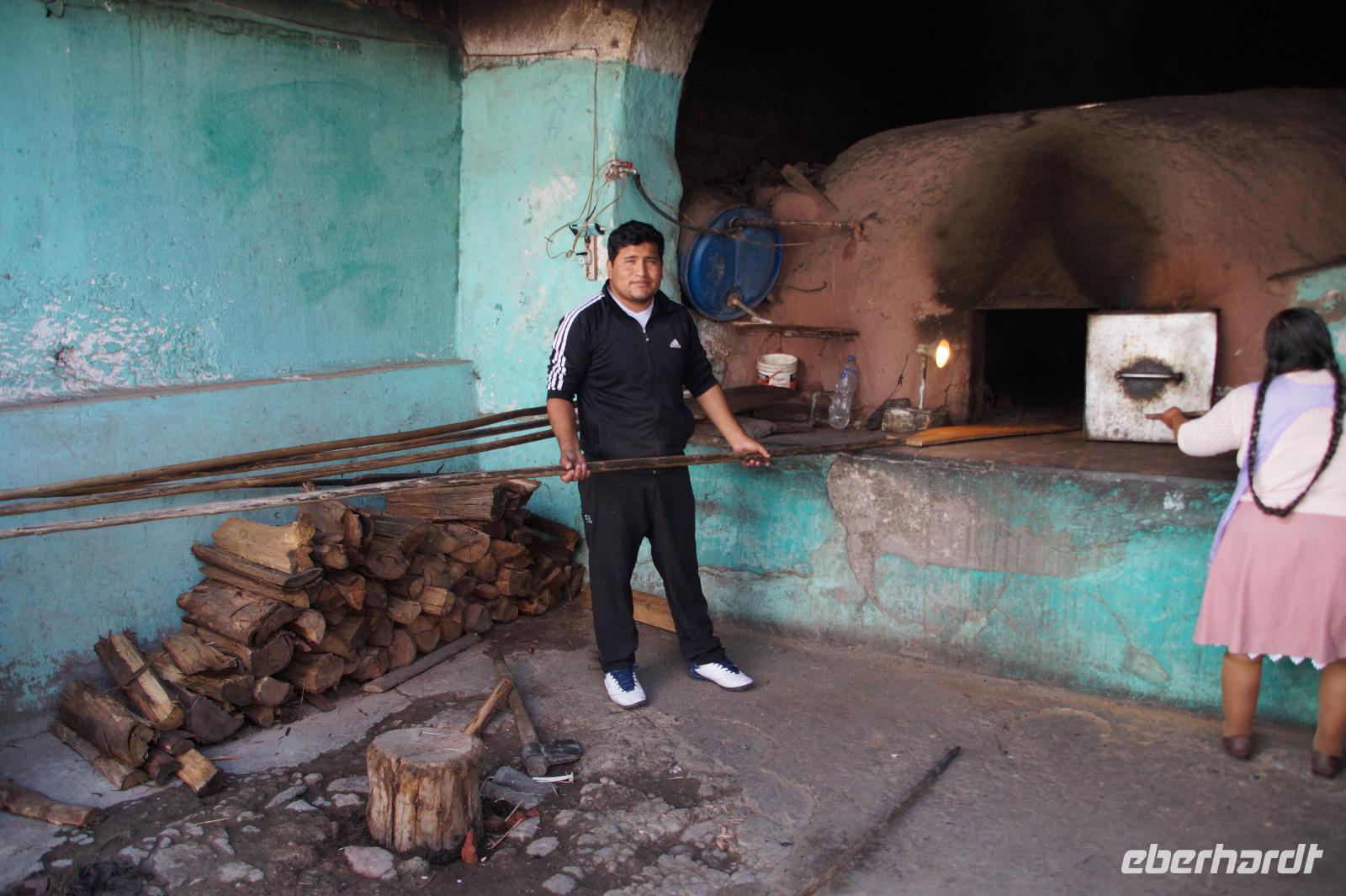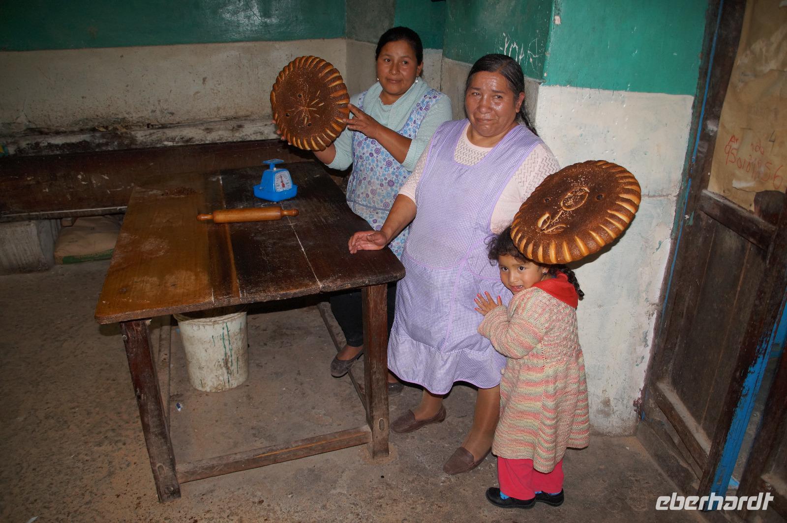Wir steuern also eine Bäckerei an, die Mijaíl kennt, die Panadería de San Francisco, um festzustellen, dass diese gar nicht mehr existiert. Zum Glück gibt es in der Hauptstadt des Brotes mehr als nur die eine Bäckerei und wir gehen weiter. In der nächsten Bäckerei schämt man sich, es sei nicht aufgeräumt, man gibt sich schüchtern will nicht, dass Leute aus einem fremden Land die Bäckerei so fotografieren. Im übernächsten Haus befindet sich bereits die nächste Bäckerei, hier bekommen wir Zutritt. Man merkt den Bäckern ihre Müdigkeit an, es ist gegen 10:00 Uhr morgens und sie sind bereits seit 2:00 in der Bäckerei. Lediglich die fünfjährige Tochter eines der Bäcker ist fit. Wir werden in die Backstube geschickt, begleitet von der Fünfjährigen. Die Arbeit ist aufgeteilt, die Frauen kümmern sich um das Kneten des Teigs und das Formen der Brote, die Männer um das Befeuern des Ofens und das Backen.