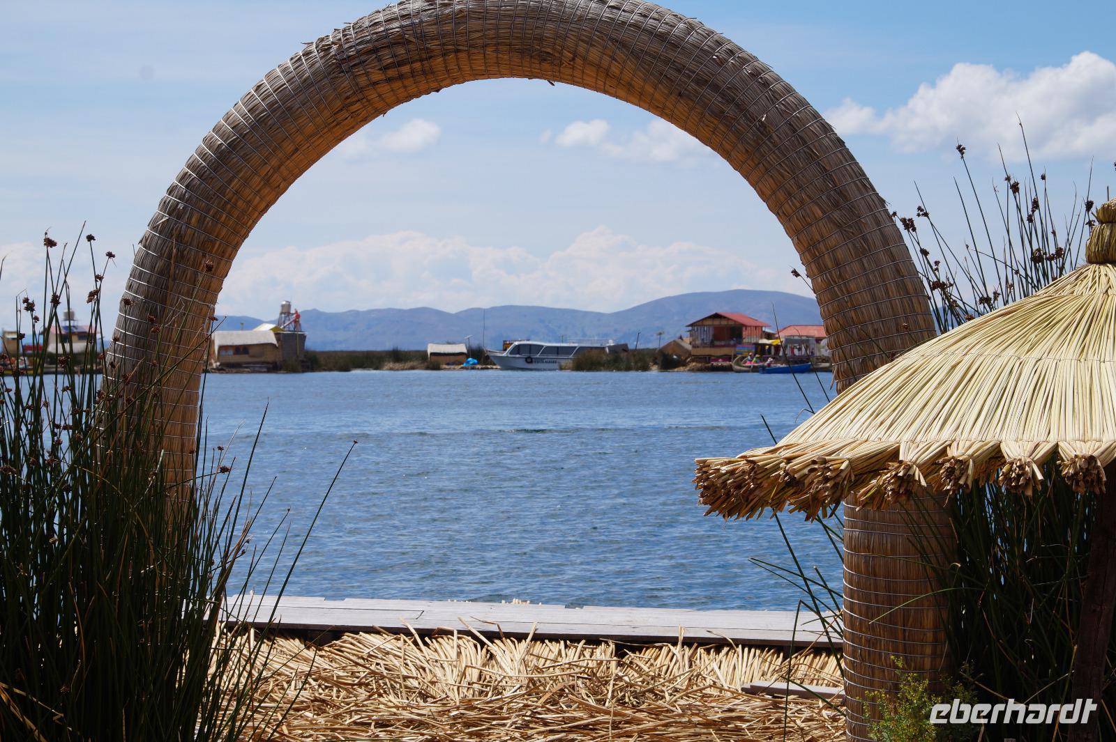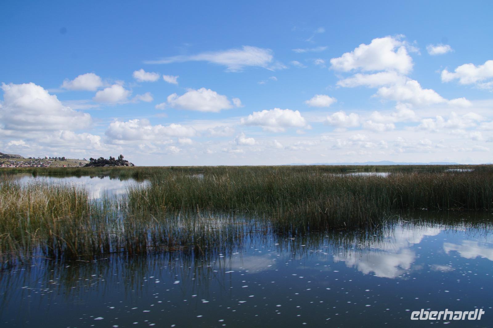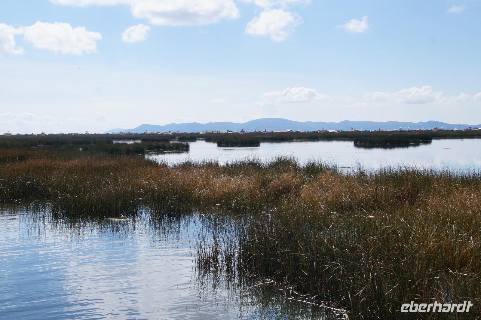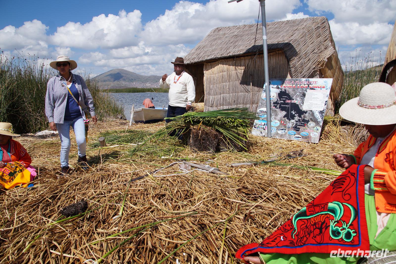 Zunächst besuchen wir die Uros. Die Uros sind ein Volk, welches Ayamara spricht. Sie leben auf und mit dem See, auf schwimmenden Inseln, die sie aus den Wurzeln und Halmen eds Totora-Schilfs binden. Sie sollen zu dieser Lebensweise gekommen sein, als sie, damals noch als Fischer am Ufer lebend, vor der Eroberung der Region durch die Quechua sprechenden Inkas erst in ihren Booten auf den See geflohen sind und dann begannen sich dort im wahrsten Sinne des Wortes häuslich einzurichten.