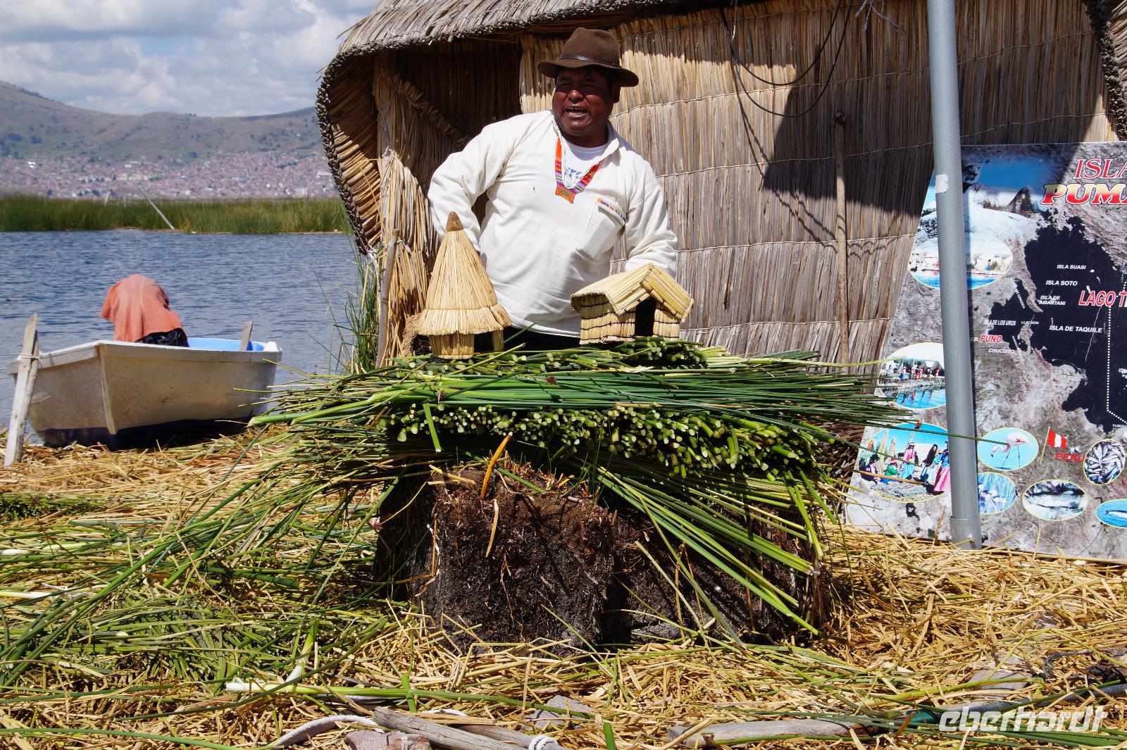 Raúl erklärt uns, wie die Inseln gestochen werden. Man benötigt dazu die schwimmende Wurzel der Totora-Binsen. Die muss also vom Grund gelöst werden. Je 10*10 m Tororawurzel werden geschnitten und dann mehrere solcher Quadrate zusammengebunden. Wichtig dabei ist, dass die Wurzeln leben, denn wenn sie sterben, schwimmen sie nicht mehr und sinken allmählich ab. Kein Problem, der Prozess geht so langsam, dass man nicht plötzlich nasse Füße hat sondern Zeit genug, um sich eine neue Insel zu bauen oder einfach das Stück abgestorbenes Schilfwurzel zu ersetzen. Als Laufffläche werden mehrere Schichten Totorabinsen auf der Insel ausgestreut, so dass man die Insel beziehen kann, wenn man etwa einen Meter Wurzelschicht und einen Meter drauf liegende Binsen hat. Die Binsen müssen immer wieder erneuert werden und so kommt die Insel von Raúl jetzt etwa auf drei Meter Mächtigkeit.