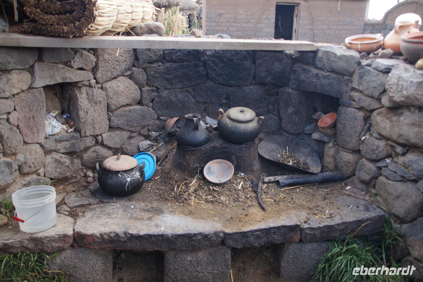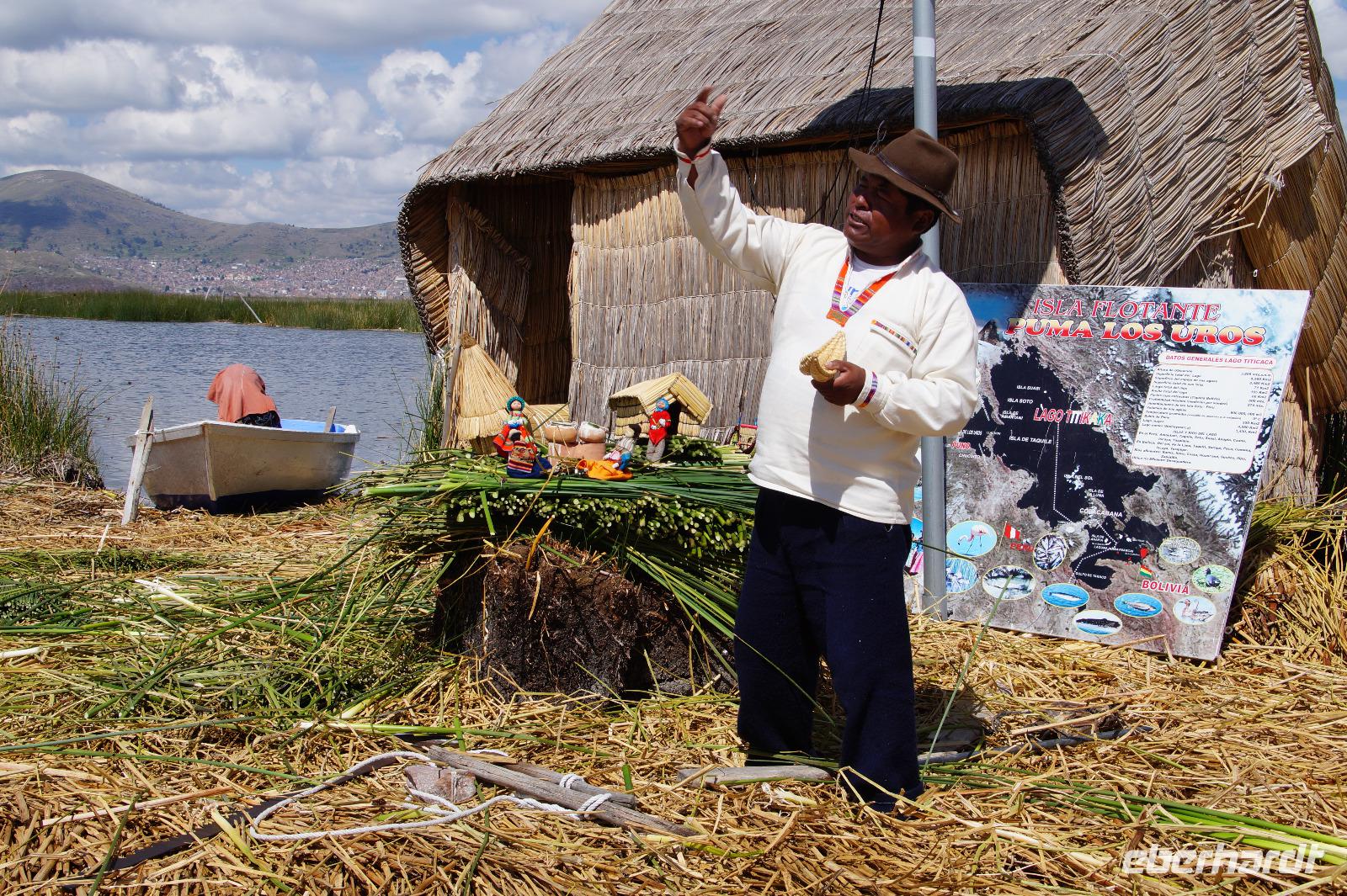 Raúl erklärt uns die Lebensweise, die Jagd, wie man auf den Inseln kocht und was passiert, wenn eine junge Frau einem jungen Mann in seinem Boot mit ihren Zöpfen winkt. Dann dürfen wir uns die Insel an-, auch gerne in die Hütten hineinschauen. Ich stehe etwas dumm in der Gegend herum - es ist mir unangenehm, in fremde Hütten zu spähen - da kommt Raúl zu mir, der plötzlich sehr gut Spanisch sprechen kann. Ich frage ihn, da viele Inseln beieinander liegen und nur wenige abseits des Uro-Dorfes, ob der Tourismus der Grund sei, warum sie so nahe beieinander lebten. Er antwortet mir, dass der Tourismus der Grund sei, warum die Uros alle auf getrennten Inseln und nicht alle auf einer gemeinsamen großen Insel leben. Das sei schade, sage ich. Der Tourismus ist eben ein zweischneidiges Schwert: Er bringt den Uros Geld, aber er verändert ihr Leben nicht nur zum Guten. Aber vielleicht sichert er ihr kulturelles Überleben und die Ökologie des Titicacasees.