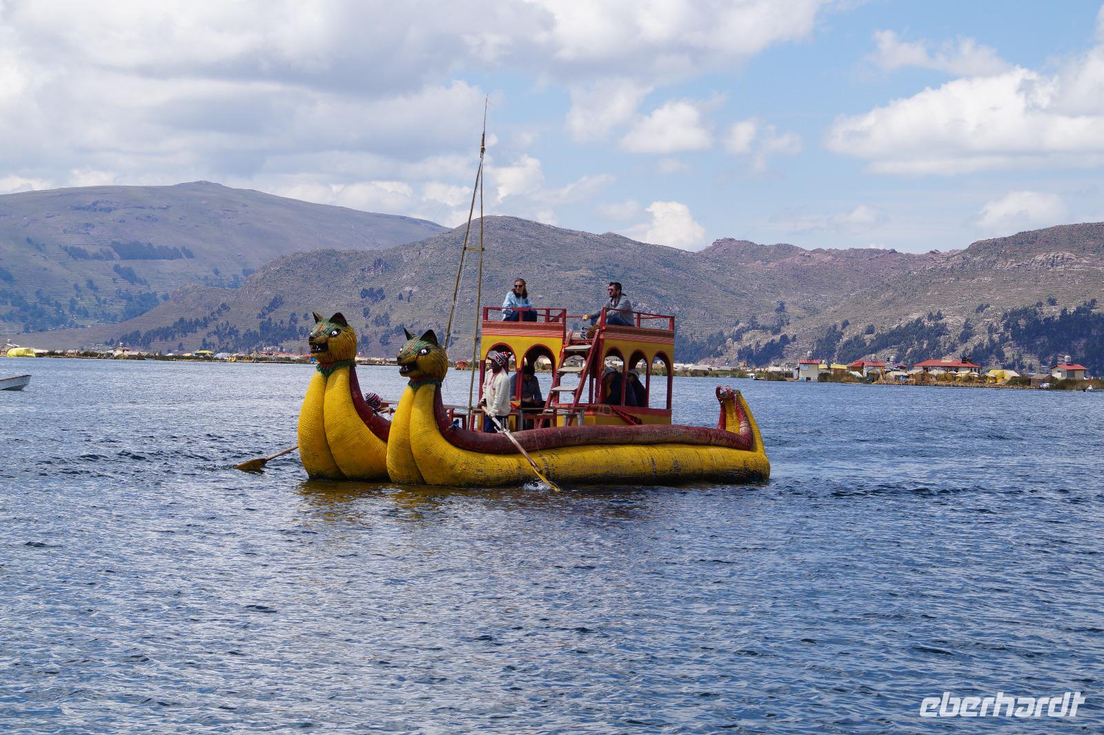 Unser erstes Ziel ist die Plaza de Armas von Puno, die wir aber nicht erreichen, denn heute findet hier ein Aufmarsch statt. Wir treffen unsere Rikschas daher eine Straße weiter und fahren dann, je zwei Personen auf einer Rikscha in einem Convoy von vier Rikschas durch Puno. Zum Glück geht es fast nur bergab, so dass die armen Rikschafahrer die mögliche Anstrengung vermeiden. Am Hafen treffen wir César (ja, gut aufgepasst, genauso wie der Busfahrer vom Vortag, aber nicht derselbe, es ist nicht das schlechte Gedächtnis des Verfassers sondern eine echte Namensgleichheit), der Kapitän unseres Bootes ist. Auf seinem Boot werden wir über den höchsten schiffbaren See der Welt fahren. Bzw.: einen sehr kleinen Teil davon, denn über die Bucht von Puno kommen wir nicht hinaus. Aber allein die ist mit 589 km² schon größer als der ganze Bodensee (536 km²). Zunächst besuchen wir die Uros. Die Uros sind ein Volk, welches Ayamara spricht. Sie leben auf und mit dem See, auf schwimmenden Inseln, die sie aus den Wurzeln und Halmen des Totora-Schilfs binden. Sie sollen zu dieser Lebensweise gekommen sein, als sie, damals noch als Fischer am Ufer lebend, vor der Eroberung der Region durch die Quechua sprechenden Inkas erst in ihren Booten auf den See geflohen sind und dann begannen, sich dort im wahrsten Sinne des Wortes häuslich einzurichten.