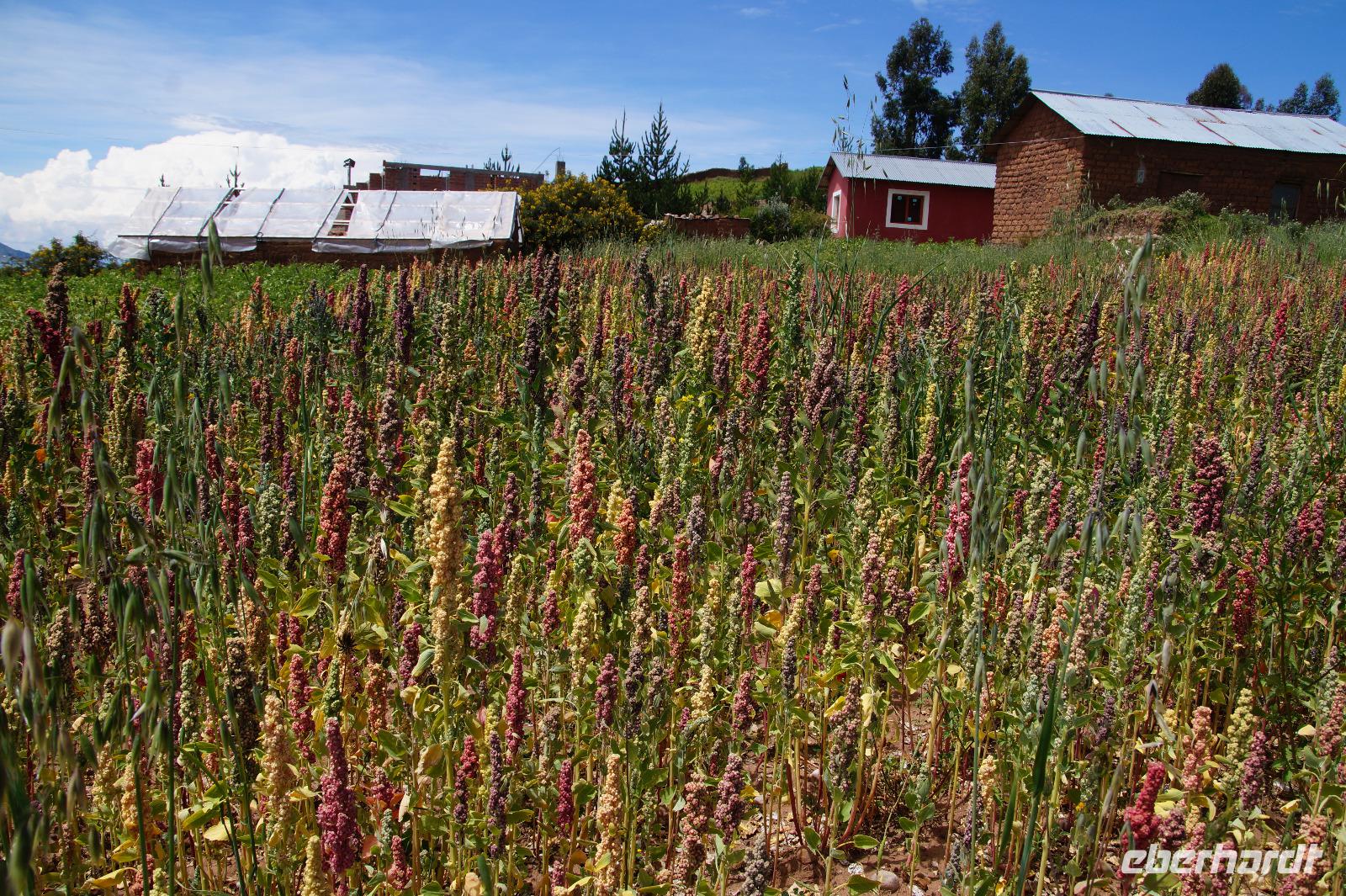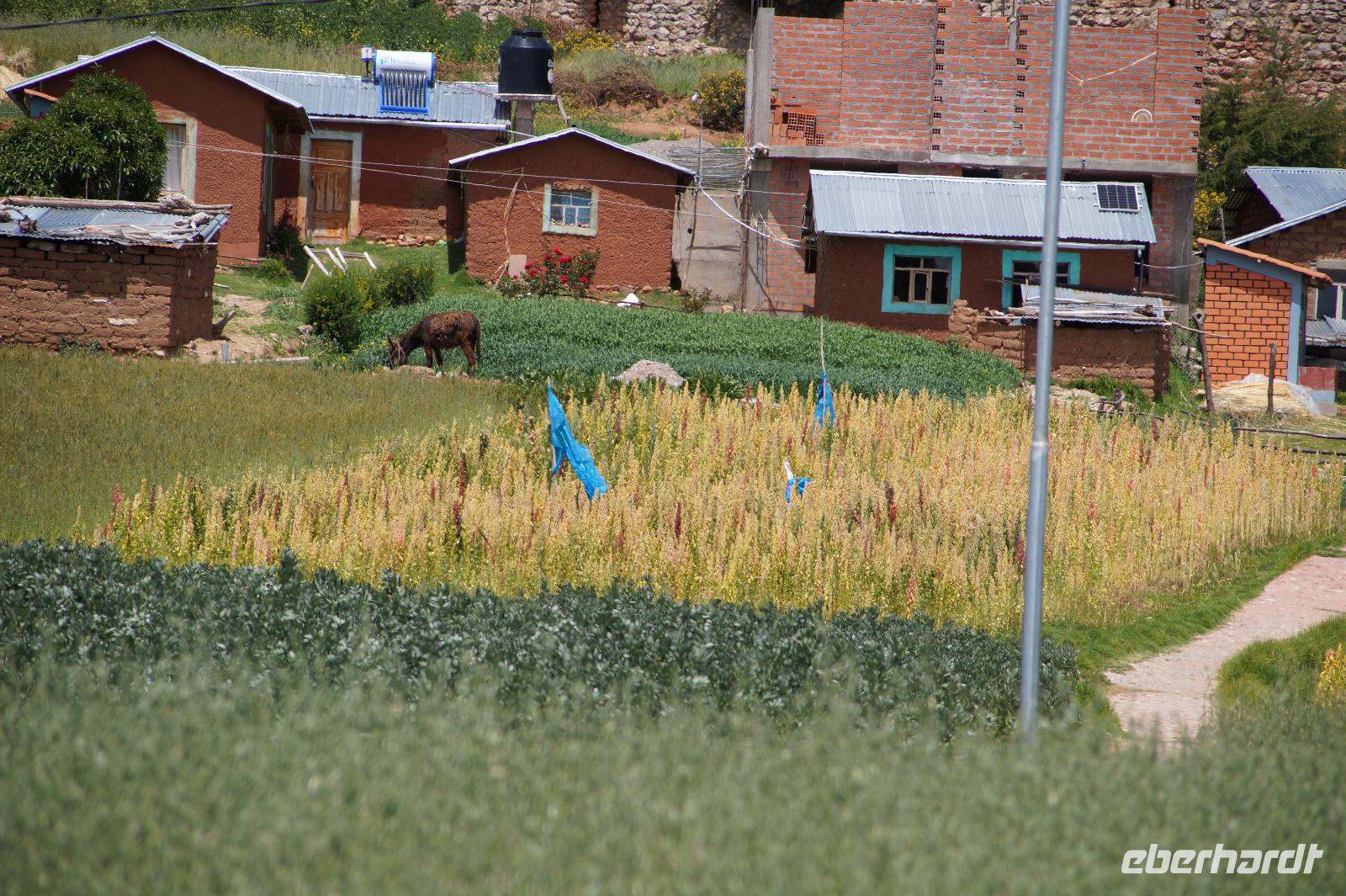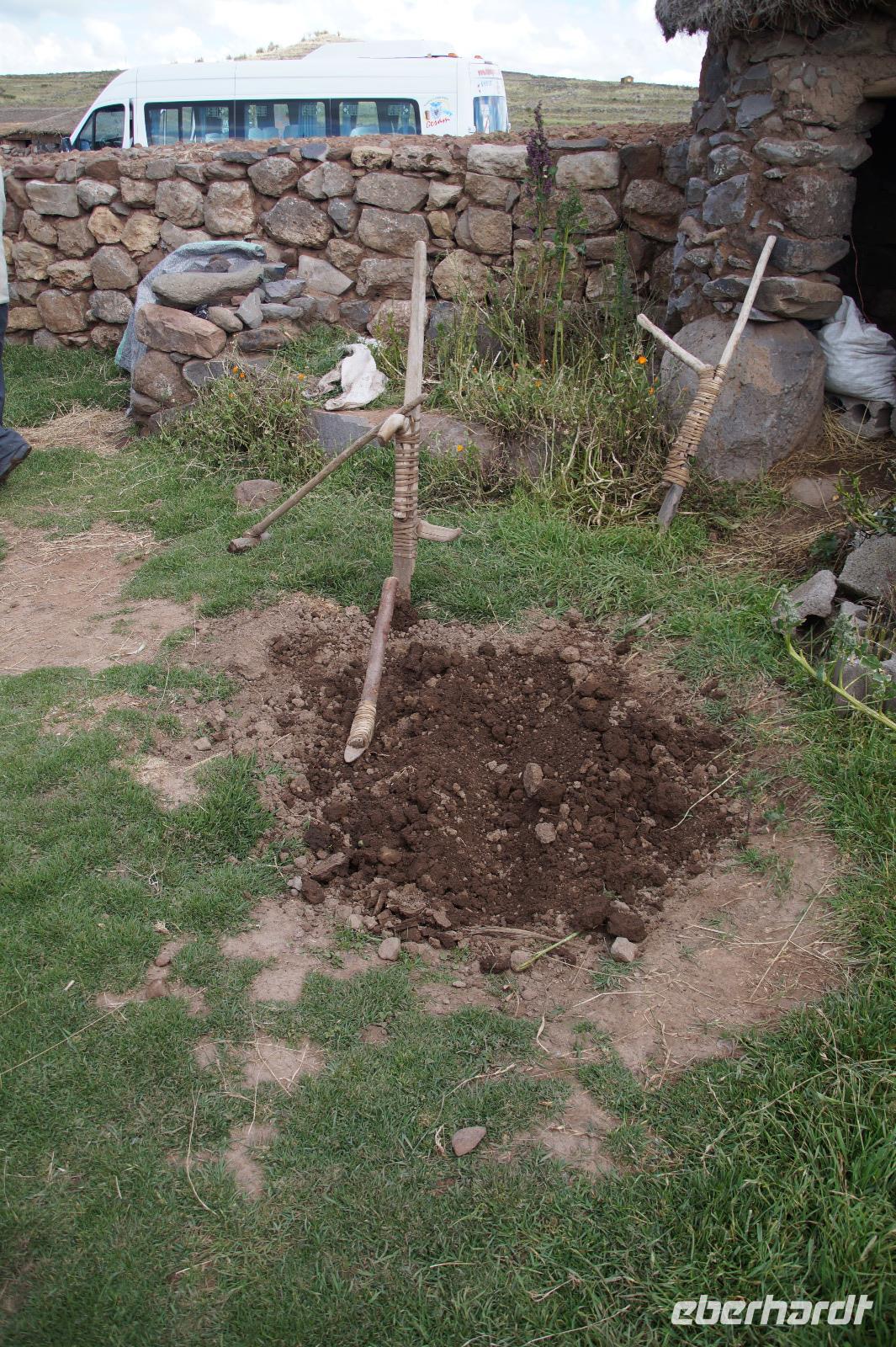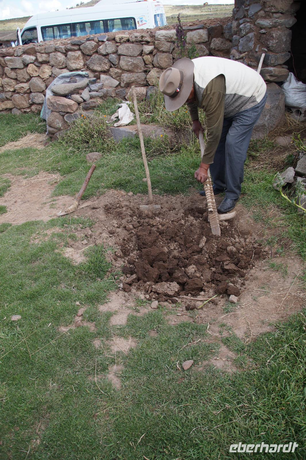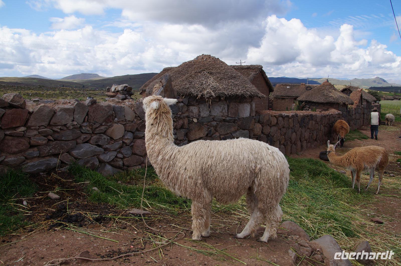 Zunächst halten wir bei einer Bauernfamilie bei Hatuncolla (Groß-Colla, der Hauptstadt der Colla-Kultur, der Kultur, welche die Grabtürme von Sillustaní errichtete und die hier bis zur Eroberung durch die Inka ihren Hauptort hatte). Wir bekommen Käse zu essen, sehen eine Schlangenapotheke gegen Rückenschmerzen, essen frisch gegarte Kartoffeln und Nelly ist eine Kartoffel, die man roh wie einen Apfel essen kann. Celestino führt uns die traditionellen Ackertätigkeiten vor und natürlich sehen wir seine Lamas und Alpacas sowie sein Guanaco. Eines seiner Alpacas ist ein Suri, Suris sind Alpacas mit "Dreadlocks".