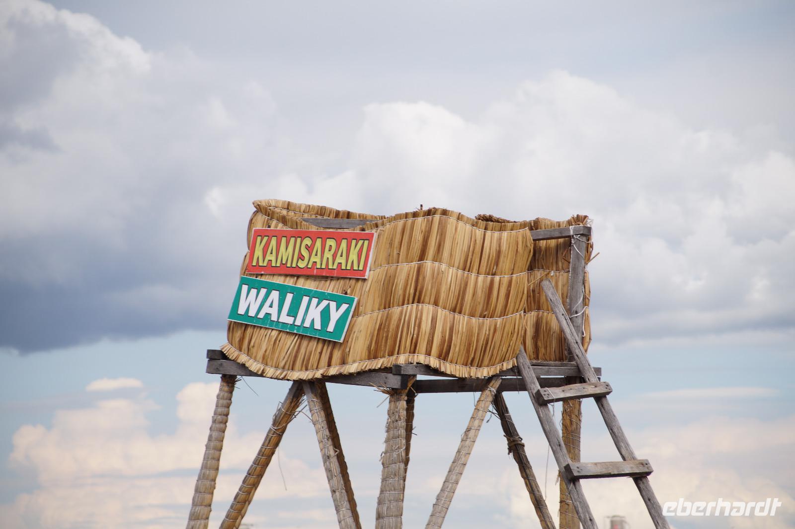 Das erste was mir auffällt, ist eine kleinere Veränderung, seitdem ich im vergangenen Oktober bei den Uros war: jede Insel verfügt jetzt über eine schwimmende Toilette. Bisher pinkelten die Uros einfach hinter einer der Hütten in den See und für's große Geschäft setzten sie sich in ein Boot und begaben sich in die Binsen. Allerdings sind die neuen Toiletten wohl noch nicht gebrauchsfertig.