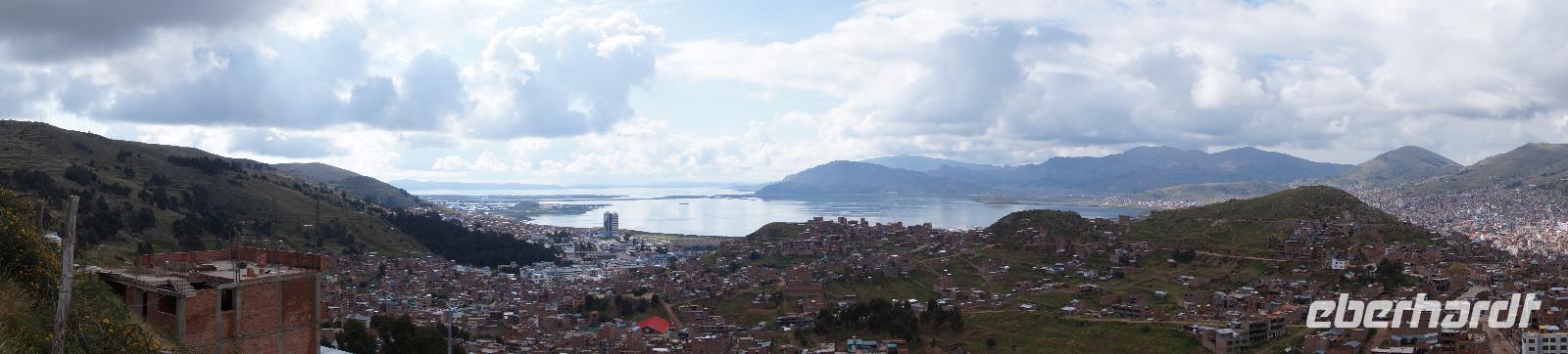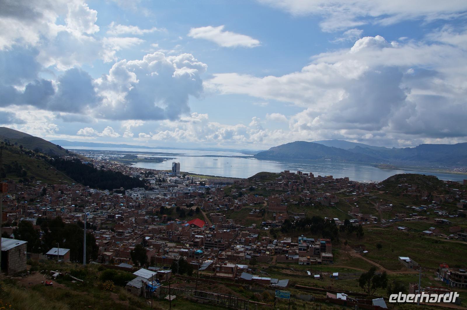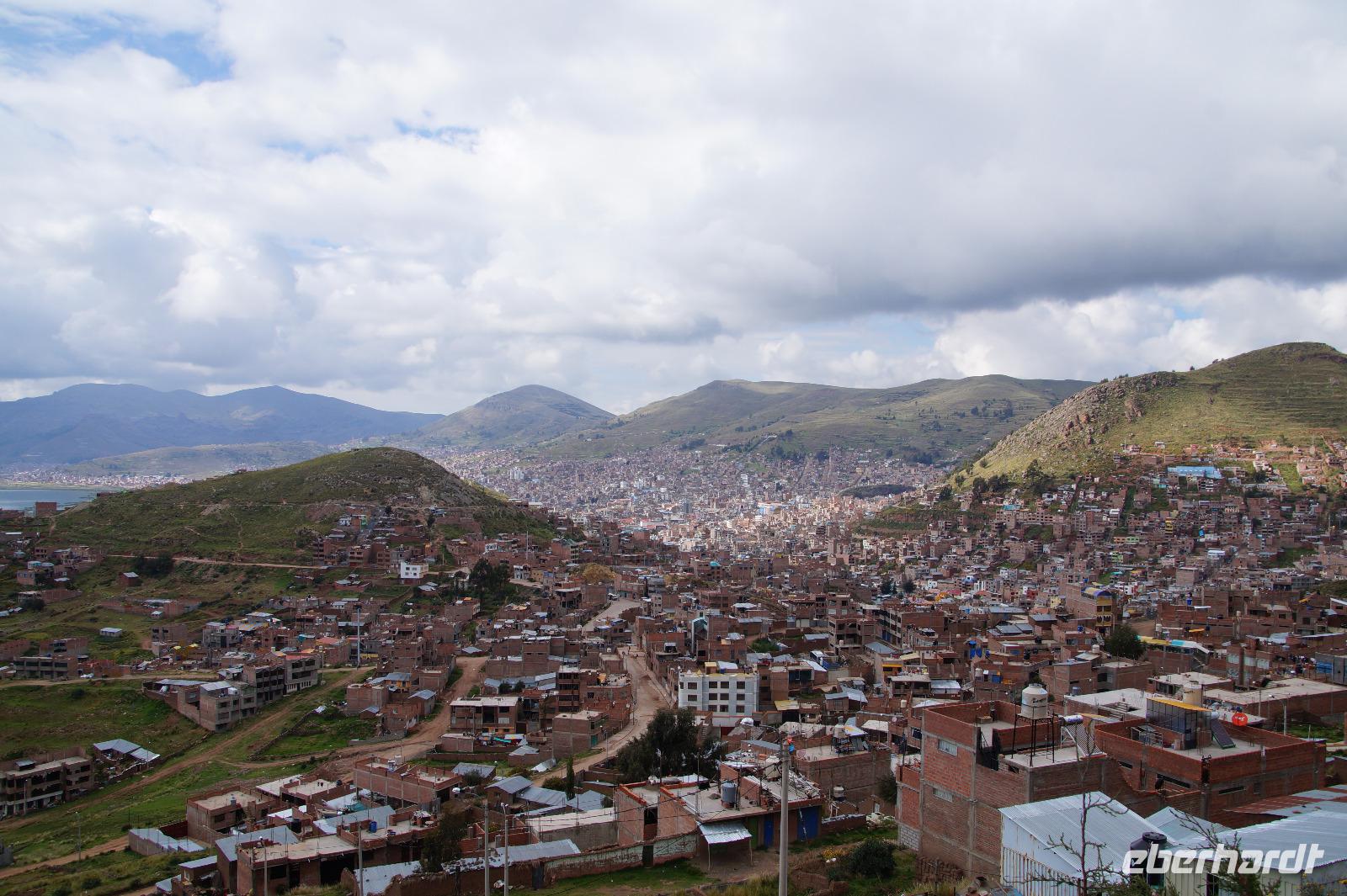 Wir halten noch einmal in Pucará, bevor wir durch das chaotische Juliaca ("Chuliacka") in Richtung des höchsten schiffbaren Sees der Welt fahren (3.801 m NN), in dessen 8288 Quadratkm der Bodensee fünfzehneinhalb mal hineinpassen würde. Am frühen Abend kommen wir in Puno an, César, unser Busfahrer, weiß noch eine Abkürzung und spart uns so sicher zehn Minuten.
