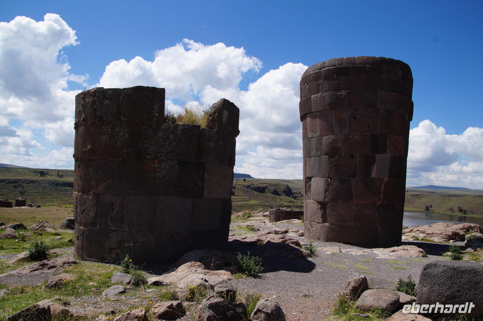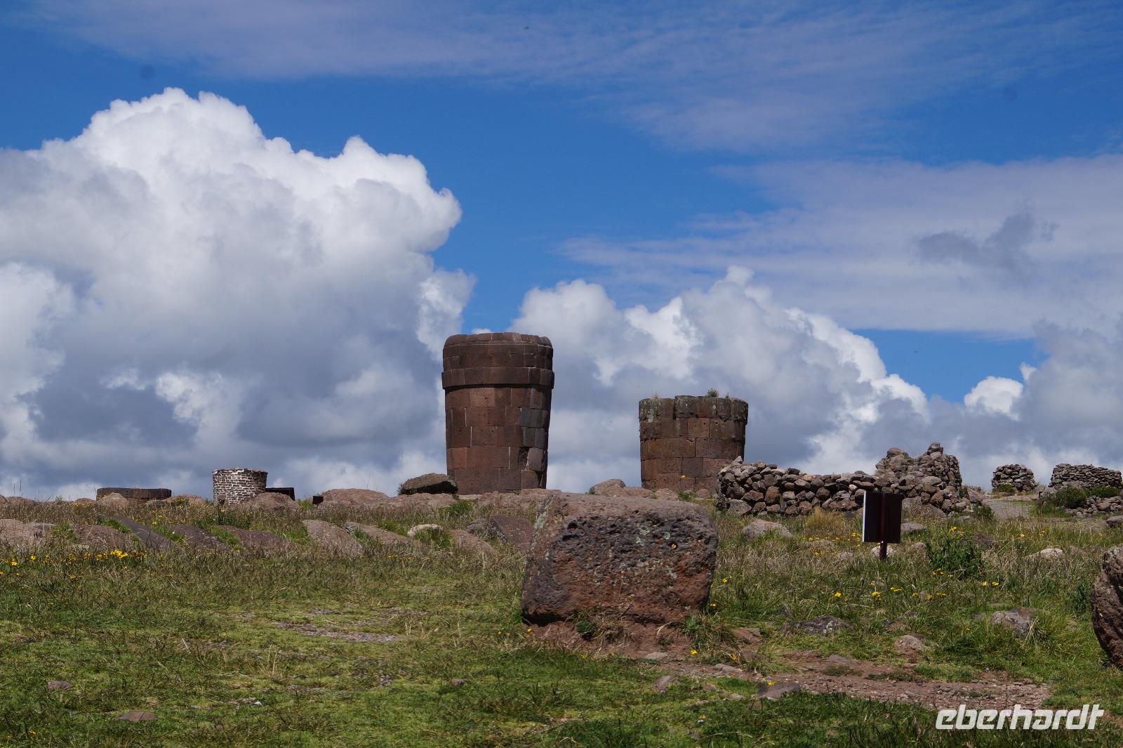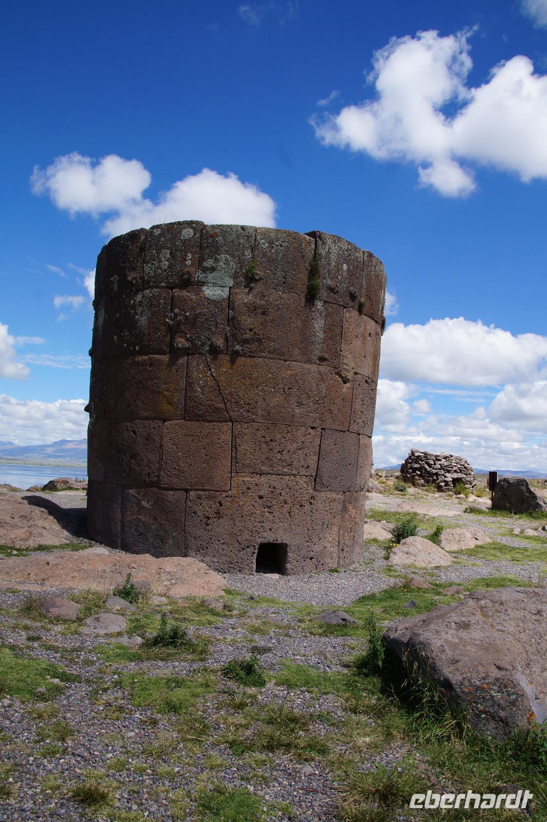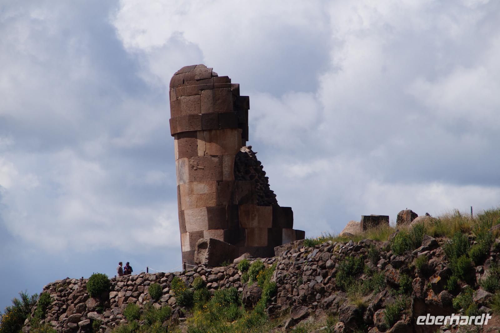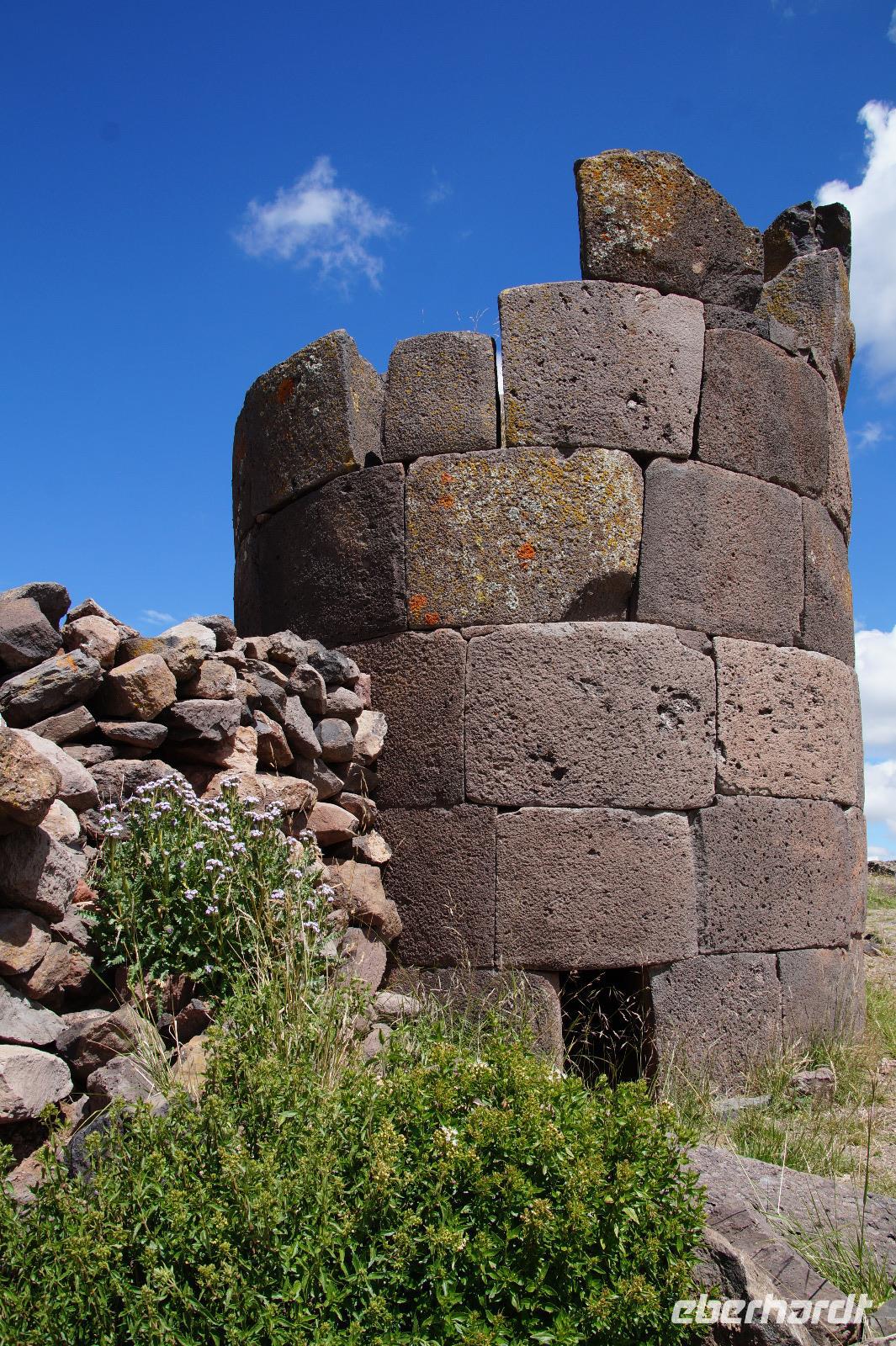 Nach kurzem Aufenthalt müssen wir weiter, um die Grabtürme zu besichtigen. Es handelt sich dabei um den Friedhof der Adeligen der Colla-Kultur. Aufgrund der Perfektion mancher der Grabtürme hat man manche der Türme früher auf die Inka-Zeit datiert, inzwischen weiß man aber, dass auch die perfekt gebauten Grabtürme bereits prä-inka sind. Dementsprechend glauben manche, dass die perfekt polierten Mauern, wie wir sie von den Inka kennen, auf einer Technik basieren, welche die Colla entwickelt haben und welche die Inka ihnen abschauten.