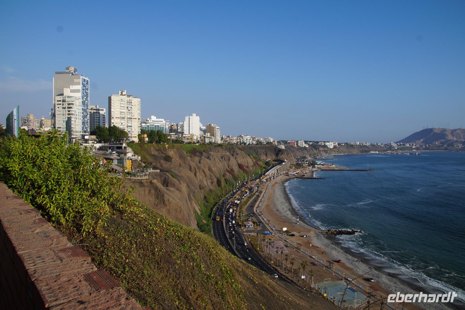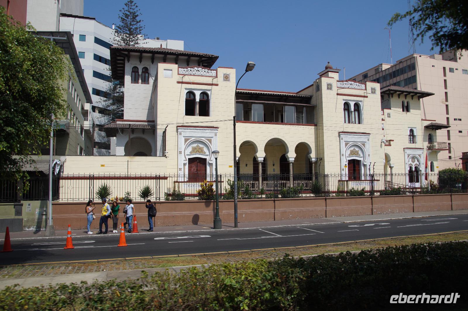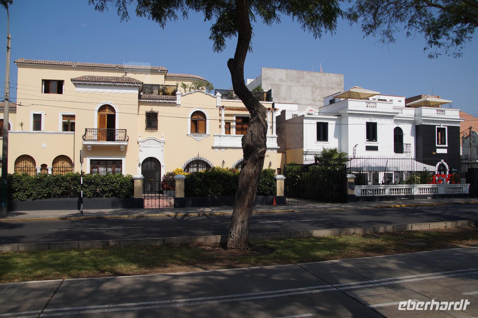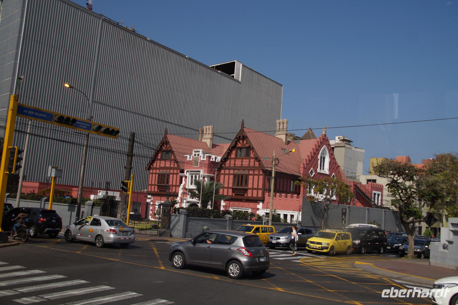 Unser letzter Tag ist angebrochen, zumindest in Perú. Nach dem Frühstück holt uns Franz zu einer Stadtrundfahrt ab. Zunächst ging es durch Miraflores, das Stadtviertel der Reichen und Schönen, welches ursprünglich mal als Ausflugsort für Sommerfrischler gegründet worden war. Damals lag Miraflores noch sieben Kilometer außerhalb von Lima. Etwas weniger reich und etwas weniger schön: San Isidro, nicht mehr direkt am Meer gelegen, aber zwischen Miraflores und Lima. Hier fanden sich viele Häuse im exotischen Stil, wobei das exotisch aus peruanischer Sicht zu bewerten ist: Also nicht spanischer Kolonialstil bzw. Neokolonialstil, sondern beispielsweise im britischen Tudor Style, also Fachwerk. Heute sind hier auch einige Banken und Botschaften untergebracht.