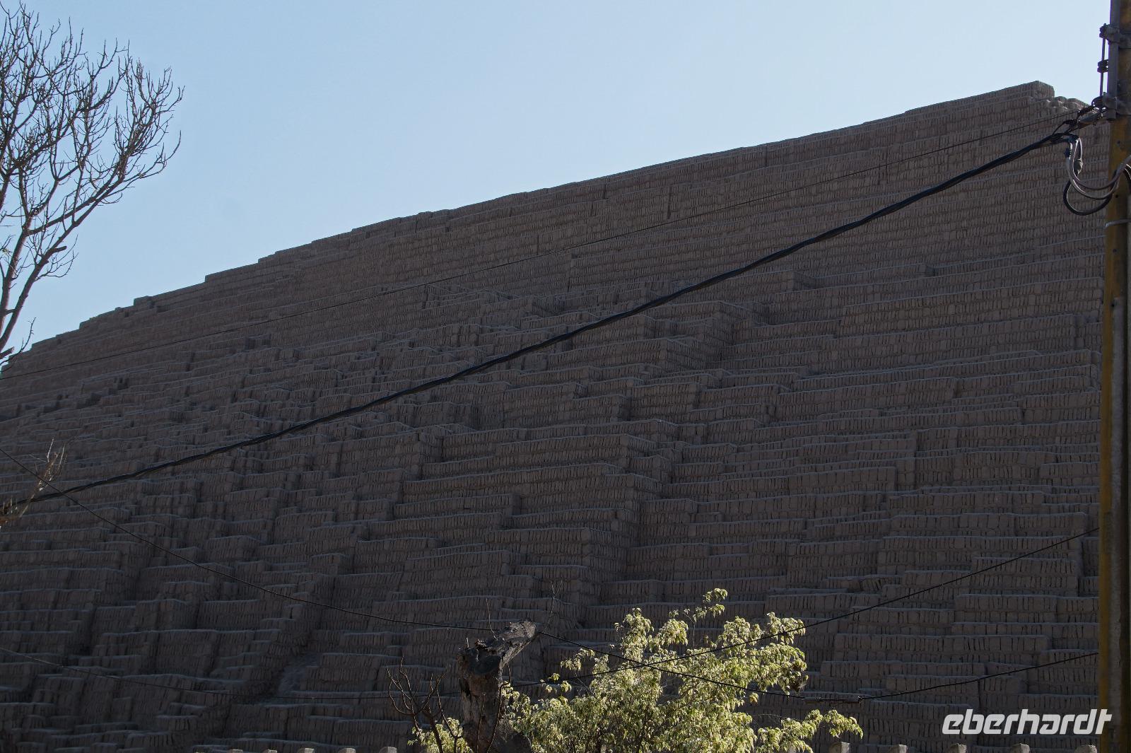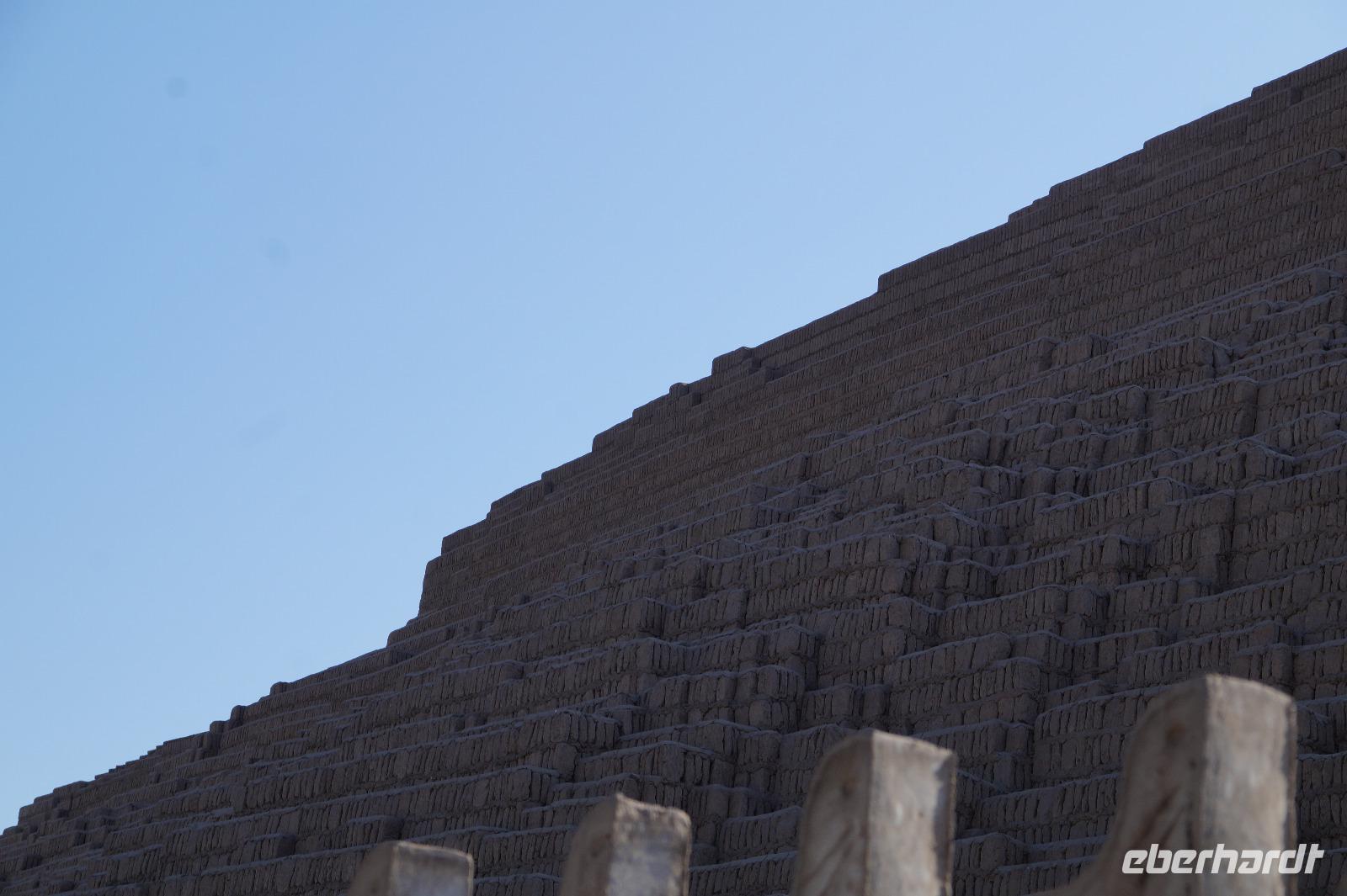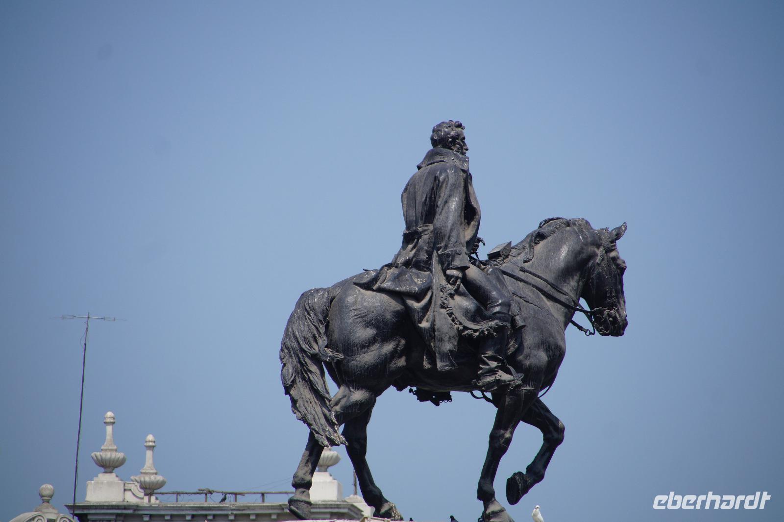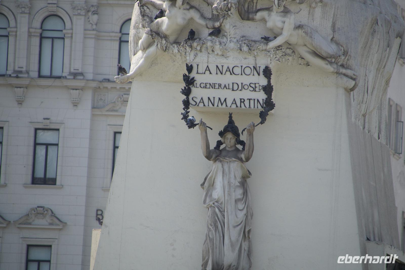 An der Huaca Puqllana vorbei, einer riesigen und dennoch unscheinbaren Stufen"pyramide" kamen wir zur Plaza de José de San Martín. Der Argentinier und Befreier Argentiniens und Chiles hatte auch die Unabhängigkeit Perús ausgerufen, welches allerdings erst durch Simón Bolivar tatsächlich befreit wurde. Unter der Reiterstatue steht die Verkörperung der Nation, die auf ihrem Helm ein Lama trägt. Es wird kolportiert, dass anstelle eine Lamas (span. Llama) dort eigentlich eine Flamme (span. Llama) angebracht werden sollte, eben die Flamme der Freiheit, der spanische Bildhauer habe sich vertan. Blogger wiederum verwerfen dies als Legende und weisen auf das Staatswappen Perus hin, welches im Feld rechts oben (Wappen werden immer aus der Sicht des (unterstellten) Trägers beschrieben, rechts oben ist als aus Betrachtersicht links oben) ein Lama zeigt. Das Tier sei einfach das peruanische Wappentier und es sei keine Verwechslung von Lama (Llama) und Flamme (Llama).
