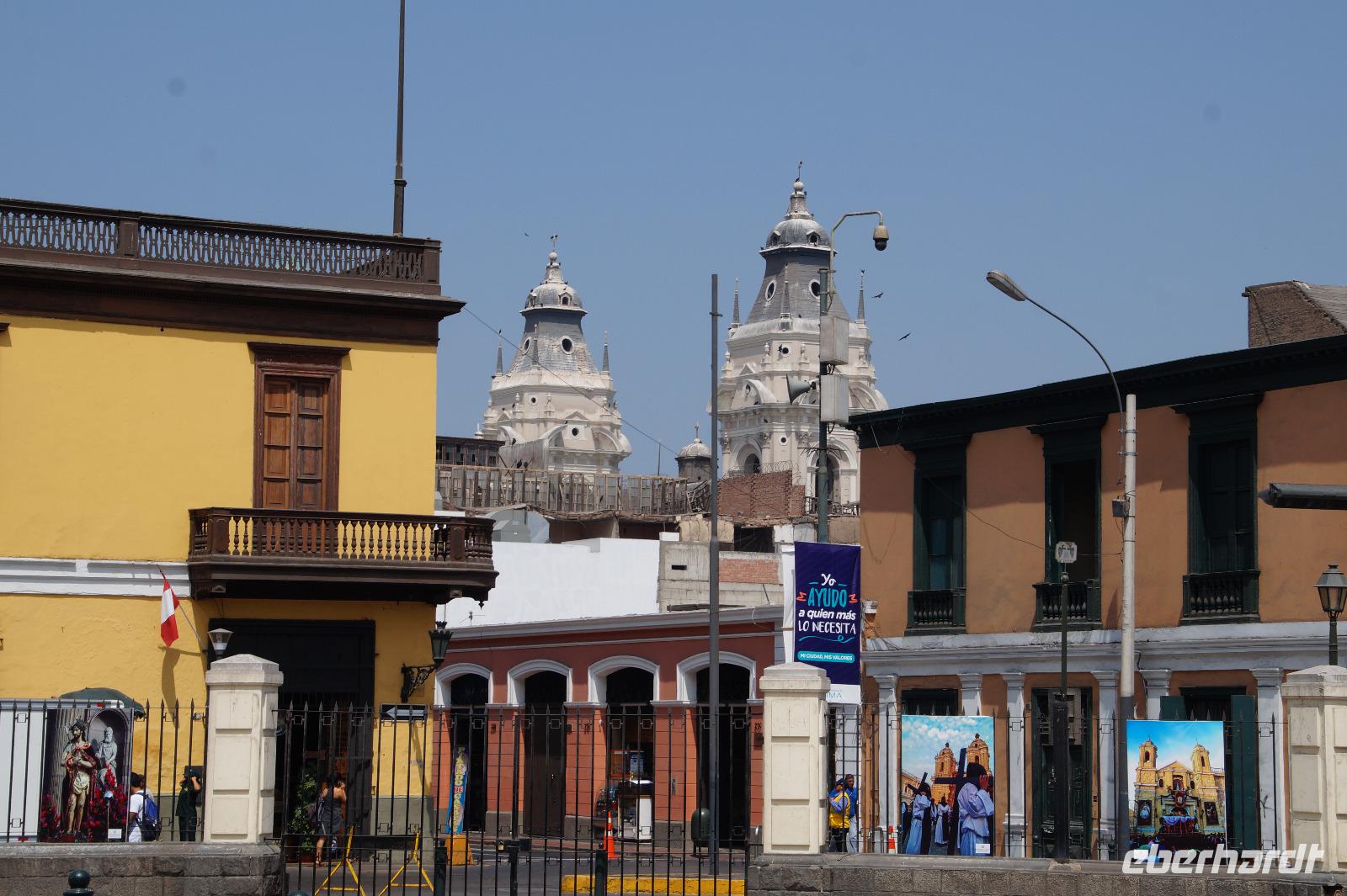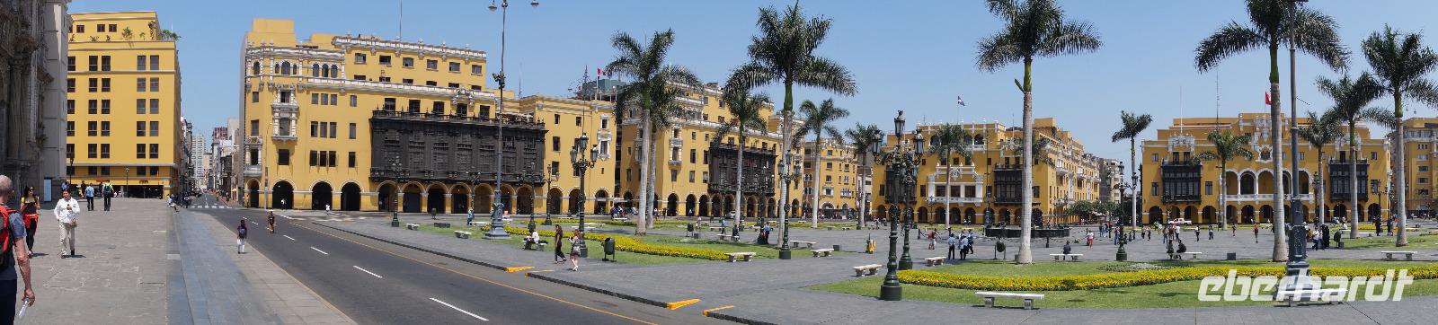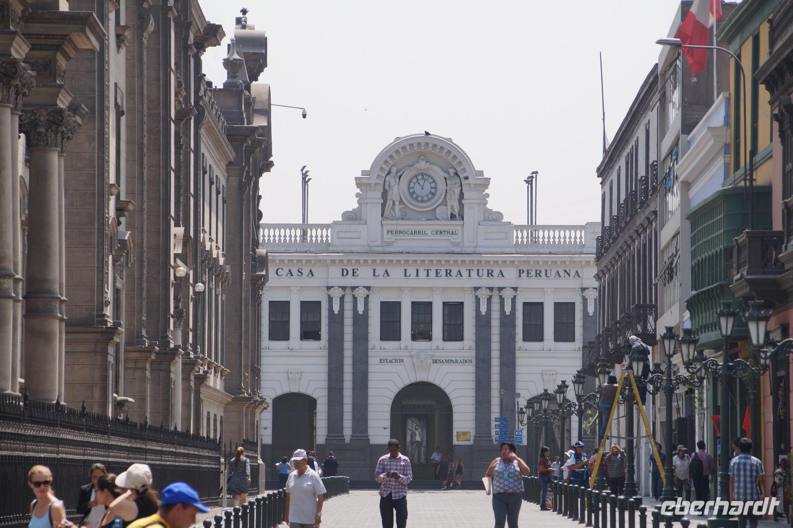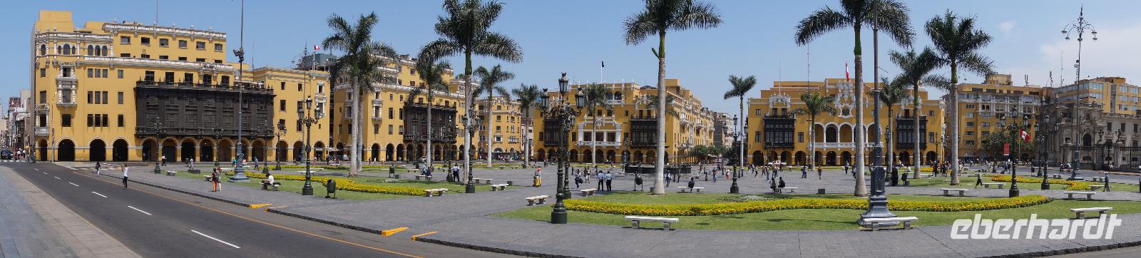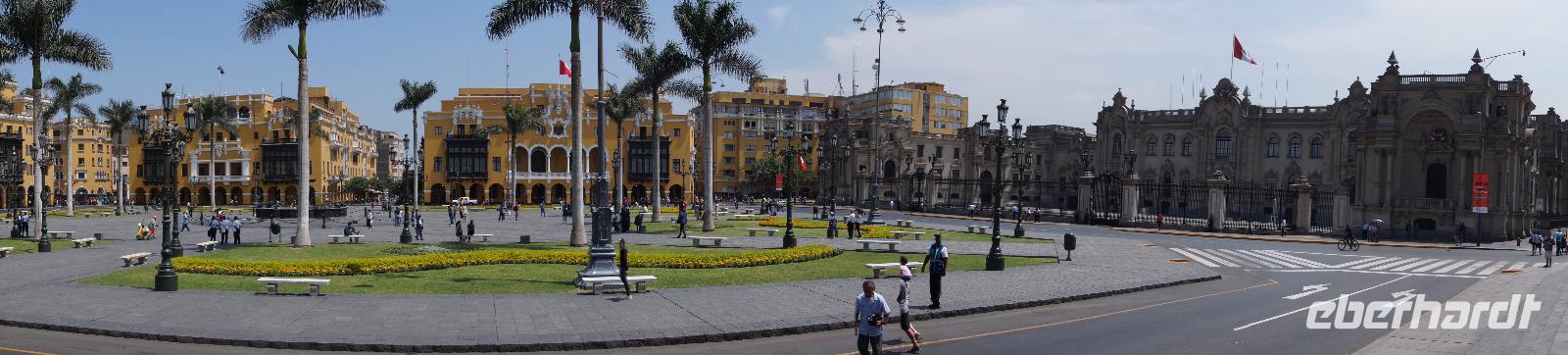 Vorbei am Desamparados-Bahnhof (so benannt nach einem früher hier stehenden Jesuitenkonvent Nuestra Señora de los Desamparados - Unsere Frau der Schutzlosen), heute Herberge des Hauses der peruanischen Literatur, und an der ältesten existierenden Bar Limas gehen wir zur Plaza de Armas, dem 'Waffenplatz', dem Ort, wo sich früher, im Falle eines Angriffs, die wehrfähige Bevölkerung mit all den Utensilien traf, die sich als Waffe eigneten. Hier befinden sich das Rathaus von Lima, der peruanischen Präsidentenpalast, die Kathedrale und der Bischofssitz - der ebenfalls mit Balkonen mit celosías versehen ist.