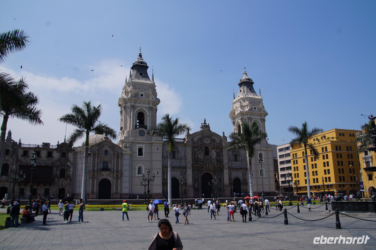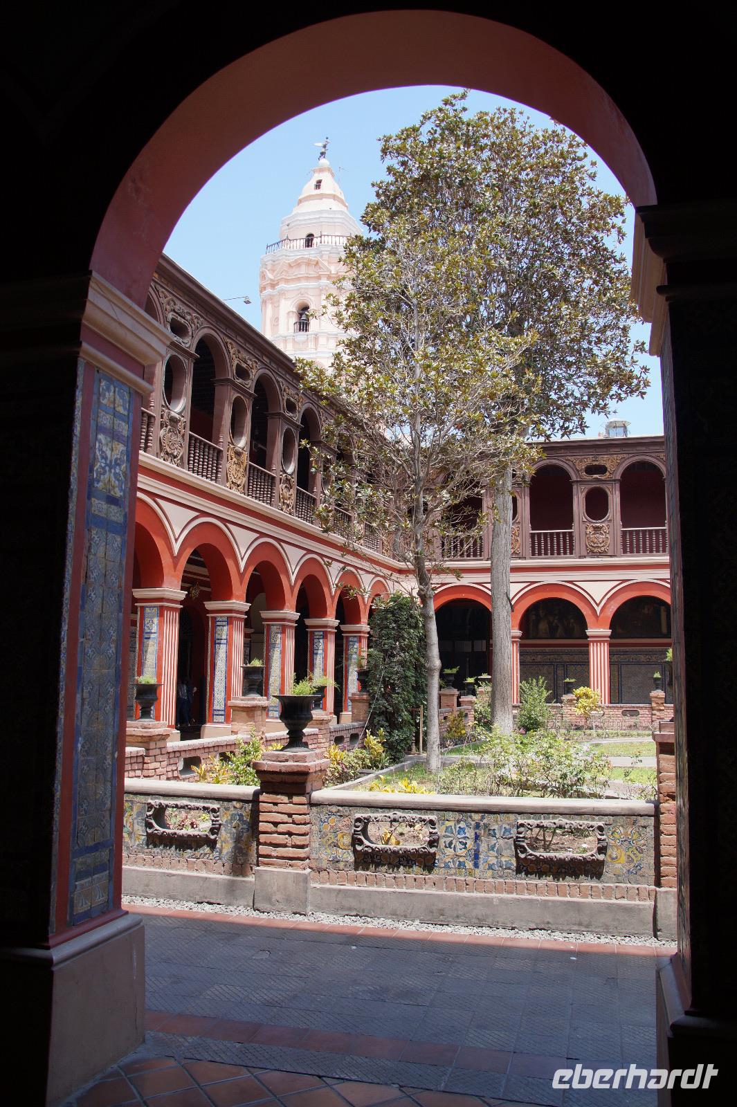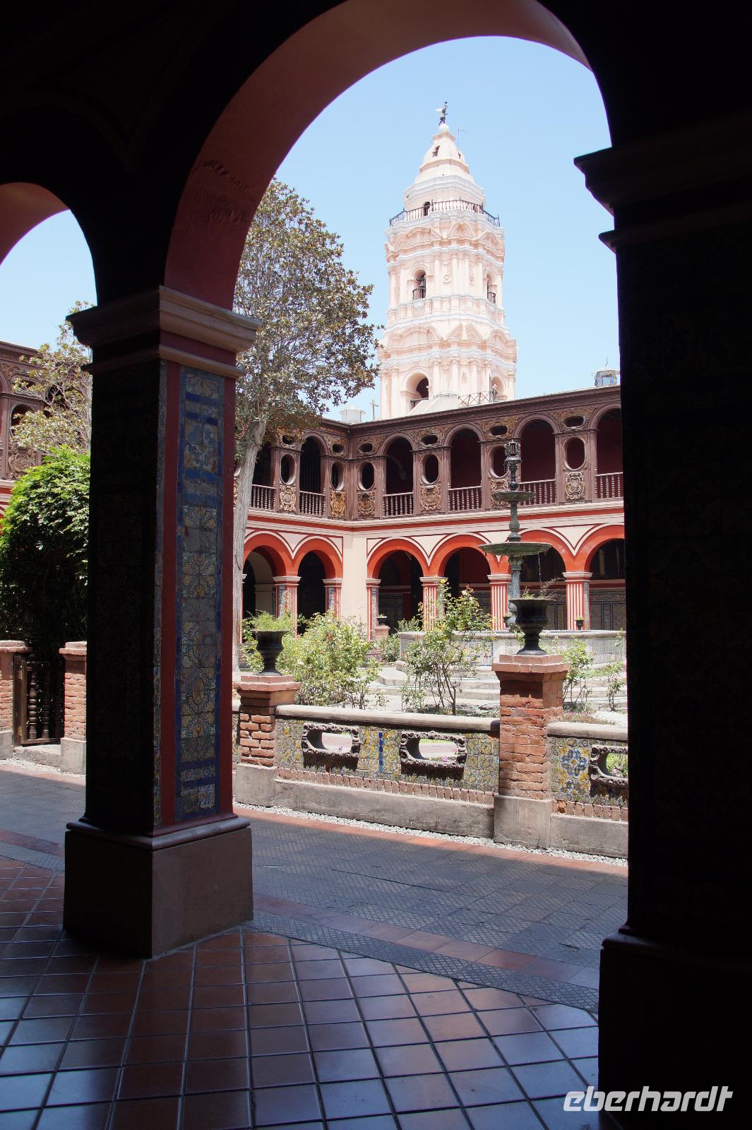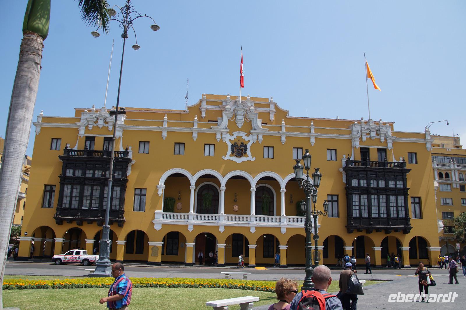 Vorbei am Desamparados-Bahnhof (so benannt nach einem früher hier stehenden Jesuitenkonvent Nuestra Señora de los Desamparados - Unsere Frau der Schutzlosen), heute Herberge des Hauses der peruanischen Literatur, und an der ältesten existierenden Bar Limas gehen wir zur Plaza de Armas, dem 'Waffenplatz', dem Ort, wo sich früher, im Falle eines Angriffs, die wehrfähige Bevölkerung mit all den Utensilien traf, die sich als Waffe eigneten. Hier befinden sich das Rathaus von Lima, der peruanischen Präsidentenpalast, die Kathedrale und der Bischofssitz - der ebenfalls mit Balkonen mit celosías versehen ist.