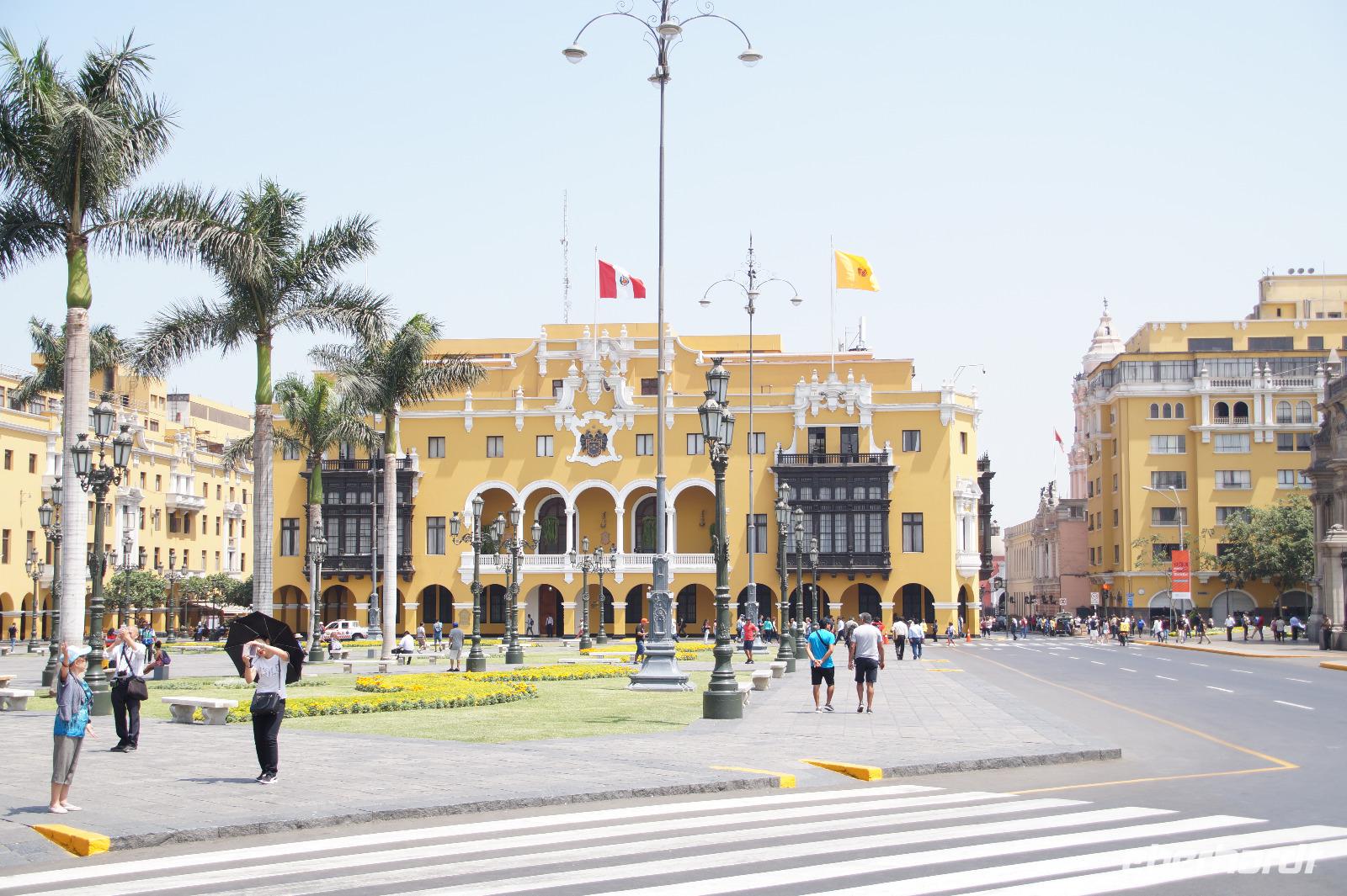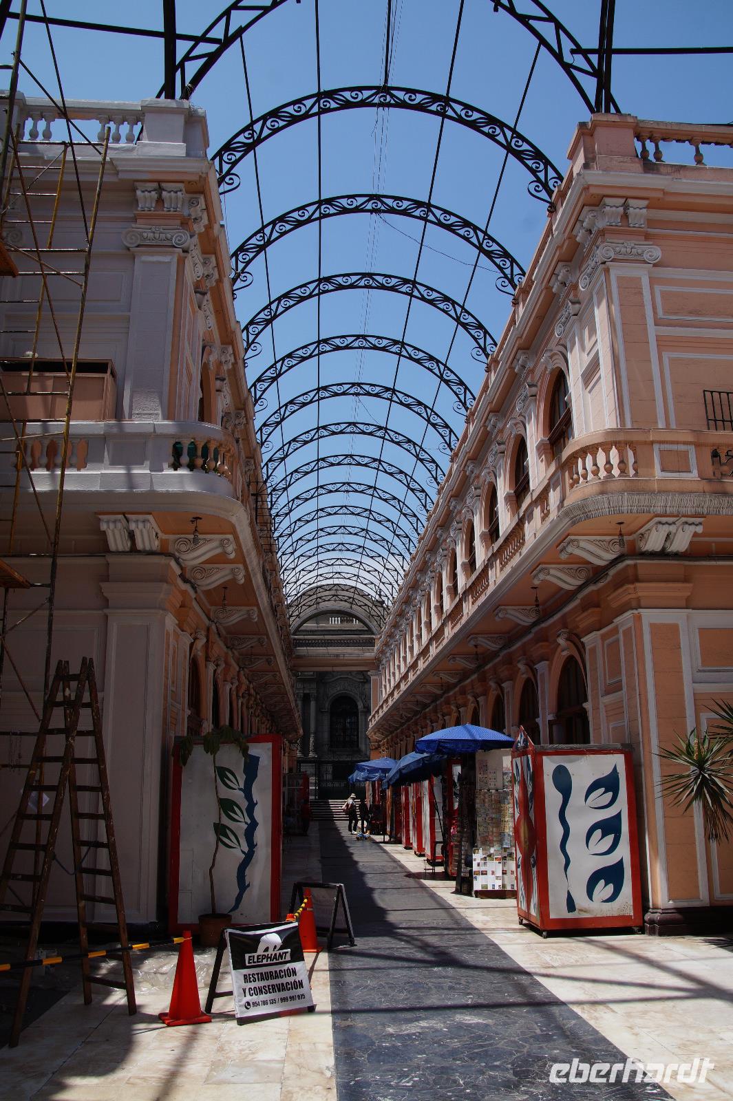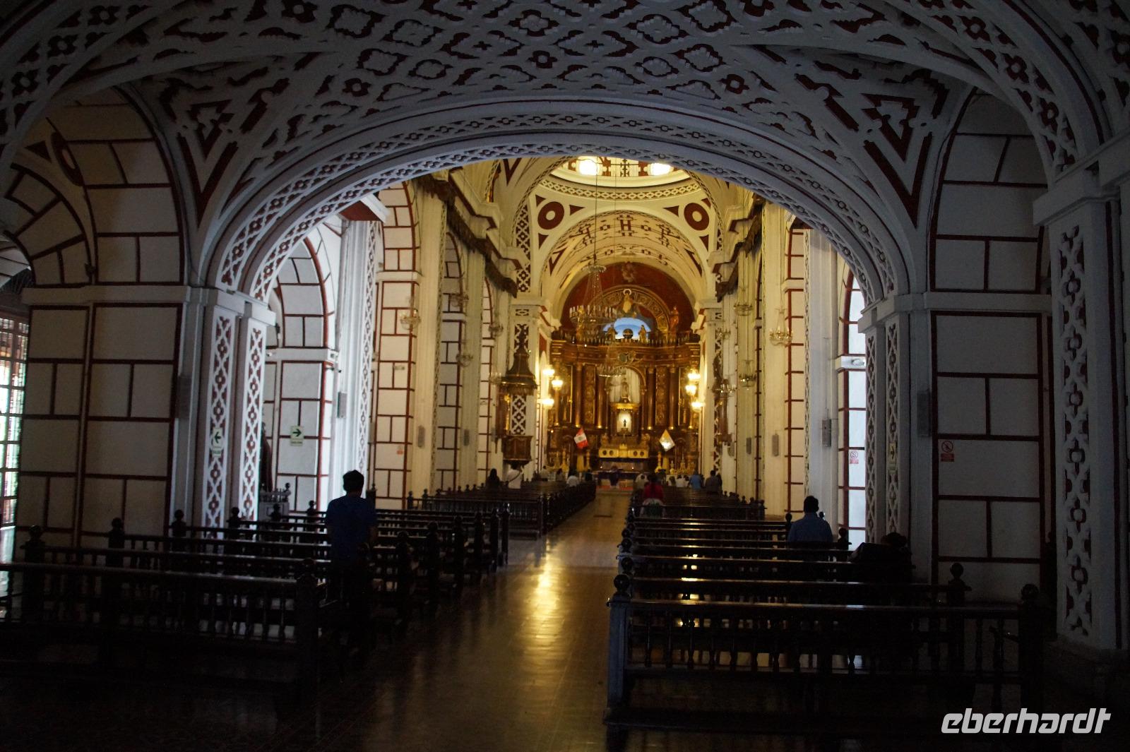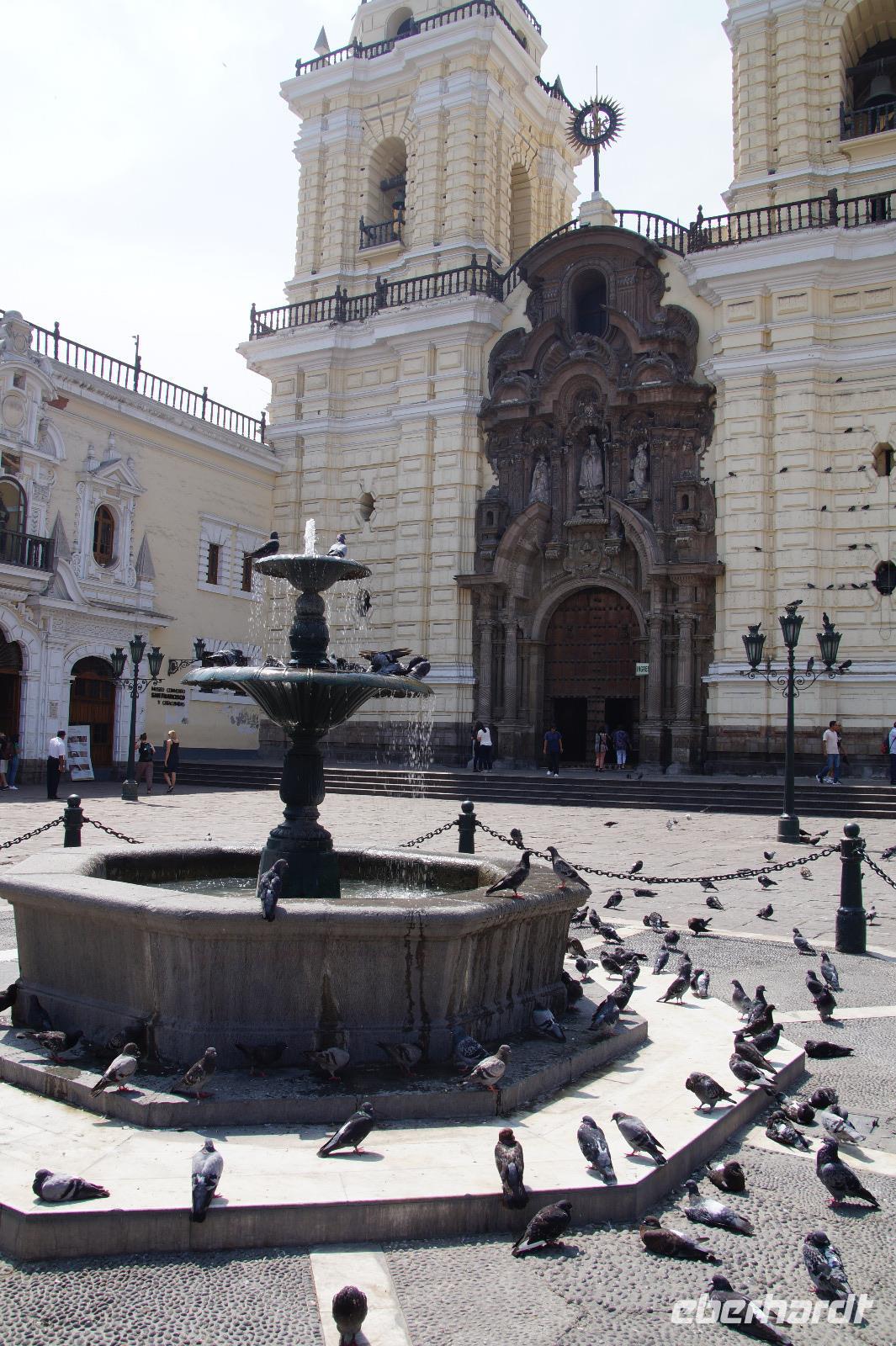 Vorbei am Desamparados-Bahnhof (so benannt nach einem früher hier stehenden Jesuitenkonvent Nuestra Señora de los Desamparados - Unsere Frau der Schutzlosen), heute Herberge des Hauses der peruanischen Literatur, und an der ältesten existierenden Bar Limas gehen wir zur Plaza de Armas, dem 'Waffenplatz', dem Ort, wo sich früher, im Falle eines Angriffs, die wehrfähige Bevölkerung mit all den Utensilien traf, die sich als Waffe eigneten. Hier befinden sich das Rathaus von Lima, der peruanischen Präsidentenpalast, die Kathedrale und der Bischofssitz - der ebenfalls mit Balkonen mit celosías versehen ist.