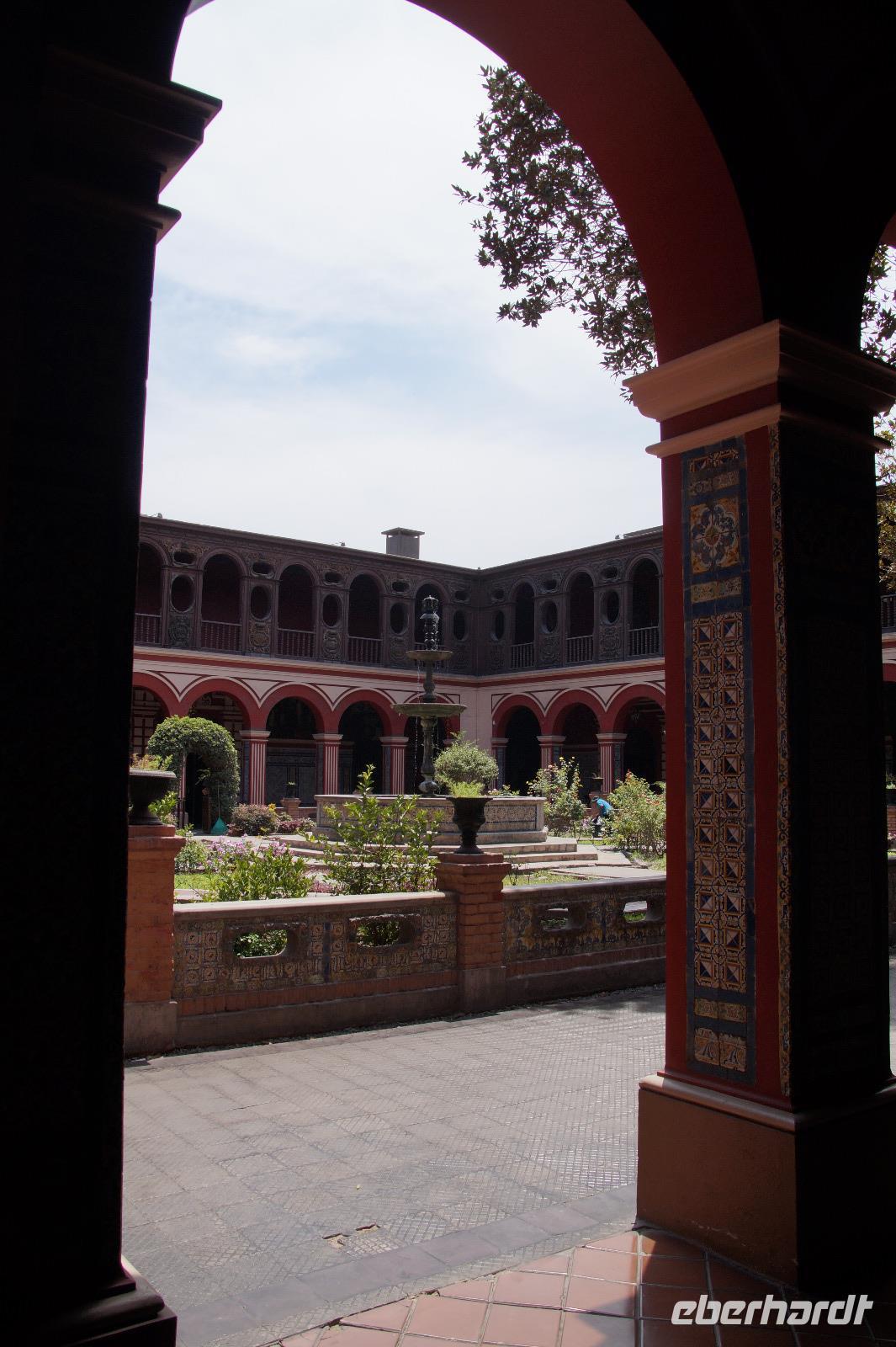 Franz wartet auf uns an der Ecke zwischen Rathaus und Präsidentenpalast, denn unser jetziges Ziel ist die Casa de Aliaga, in die man nur mit vorheriger Anmeldung kommt. Familie Aliaga wohnt hier, seitdem Francisco de Pizarro, der Chef der Conquista Perús, seinem Freund Jerónimo de Aliaga hier, ganze nahe seiner eigenen Residenz, die heute vom Präsidentenpalast überbaut ist, 1535 ein Haus bzw. eine Parzelle zugewiesen hat, heute in der 17. Generation. Und obwohl die Familie hier noch wohnt, ist das Haus zu gewissen Zeiten und nach vorheriger Anmeldung für den Besucherverkehr geöffnet. In seiner grundsätzlichen Architektur ist das Haus, das - wie auch die Kathedrale - auf einer alten Pyramide steht, noch dasselbe, wie im 16. Jhdt., auch wenn man das auf den ersten Blick natürlich nicht sieht. Hervorstechend ist vor allem das Mobiliar und die Wandverkleidungen aus dem 19. oder 20. Jahrhundert.