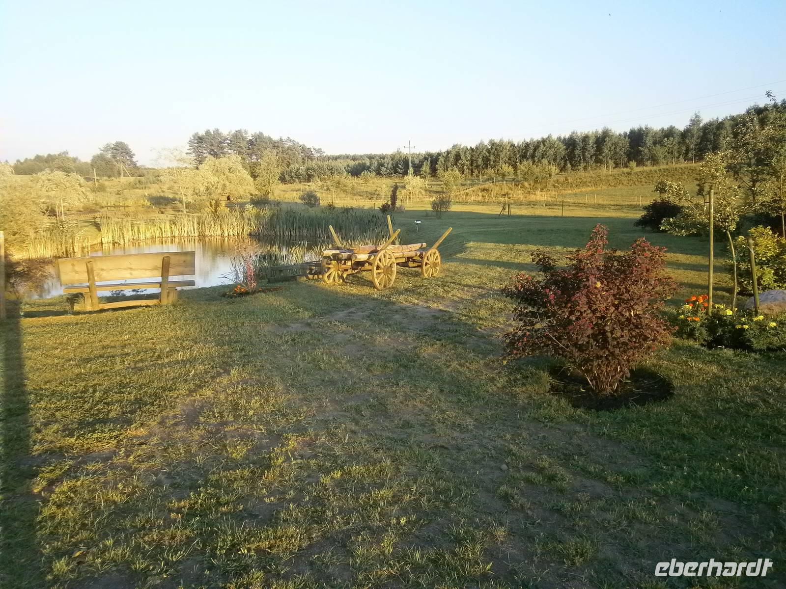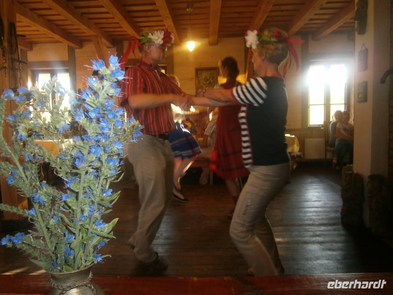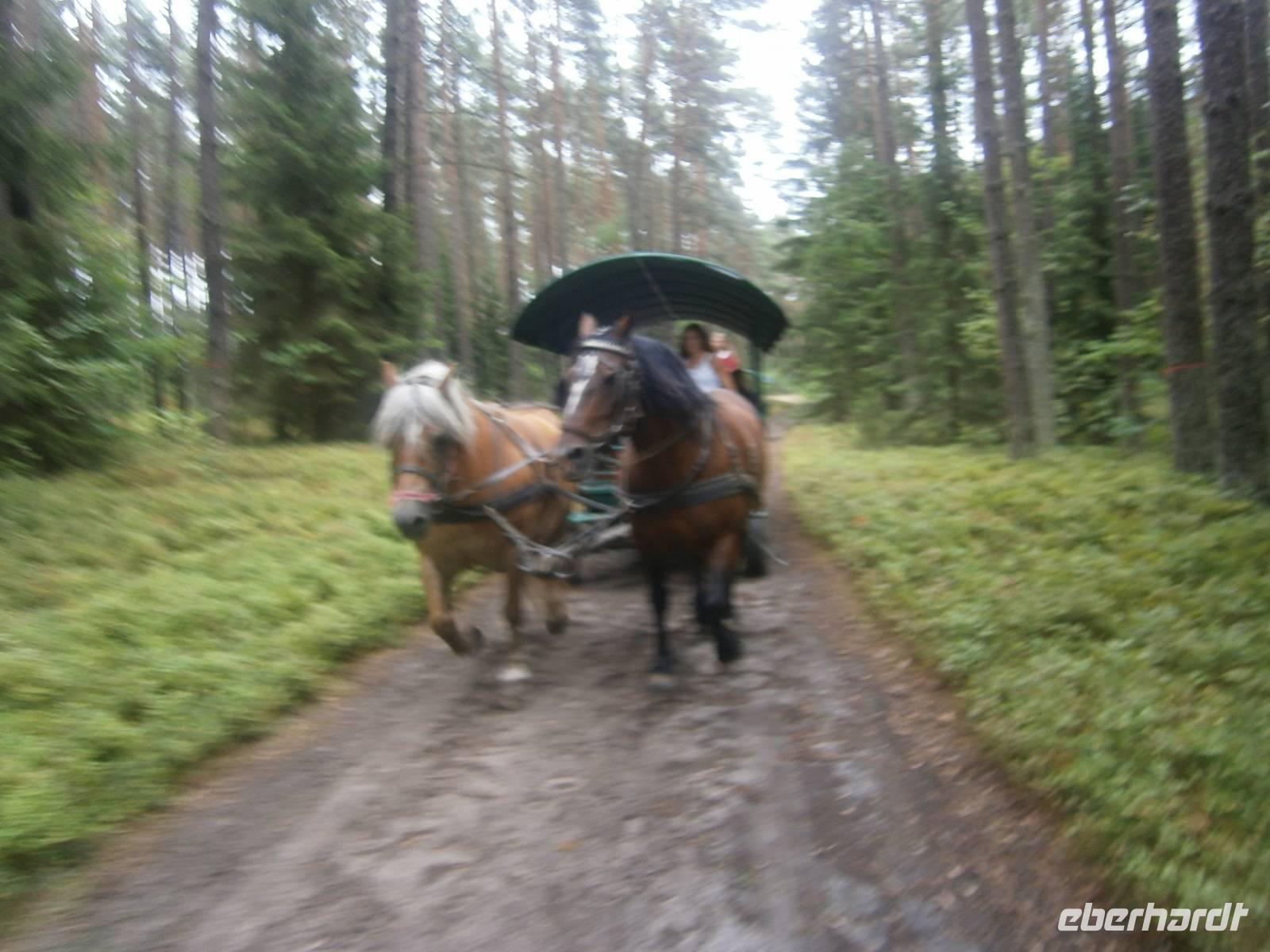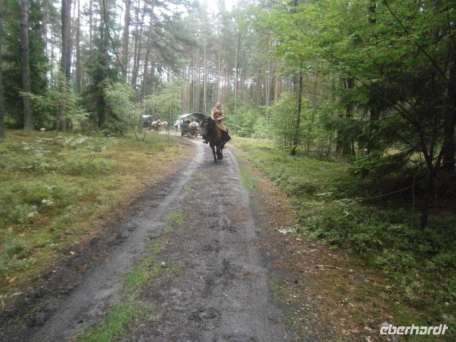 Danach brachte uns der Bus nach Krutynia, einen kleinen Ort am Flüßchen. Nach der Ankunft und bei trockenen Wetter erfolgte eine einstündige Staakenbootsfahrt auf dem insgesamt 99 km langen Flüßchen Krutynnia. Zuerst ging es durch unberührte Natur flussaufwärts, anschließend mit der Strömung flussabwärts. Wir sahen Schwäne mit ihrem Nachwuchs, ebenso Enten mit ihren Jungen, Fische in großer Anzahl und die Hinterlassenschaften der Biber. Nach einer kurzen Freizeit begaben wir uns nach Babieta, wo Eulalia einem Bauernhof betreibt. Auf der Fahrt dorthin wurden wir auf einem Waldweg von einer schönen Reiterin auf einem feurigen Hengst und mehreren Pferdekutschen empfangen. Mit einer längeren Kutschfahrt begann die Bauernhochzeit, die mit Musik und Tanz, Folklore und reichlich Essen und Trinken aufwartete. Auch das Brautpaar und ein in kürzester Zeit entstandenes Baby standen im Mittelpunkt des Geschehens. Natürlich wurde auch die Reisegruppe aktiv einbezogen. Dabei hatten alle Beteiligten einen großen Spaß.