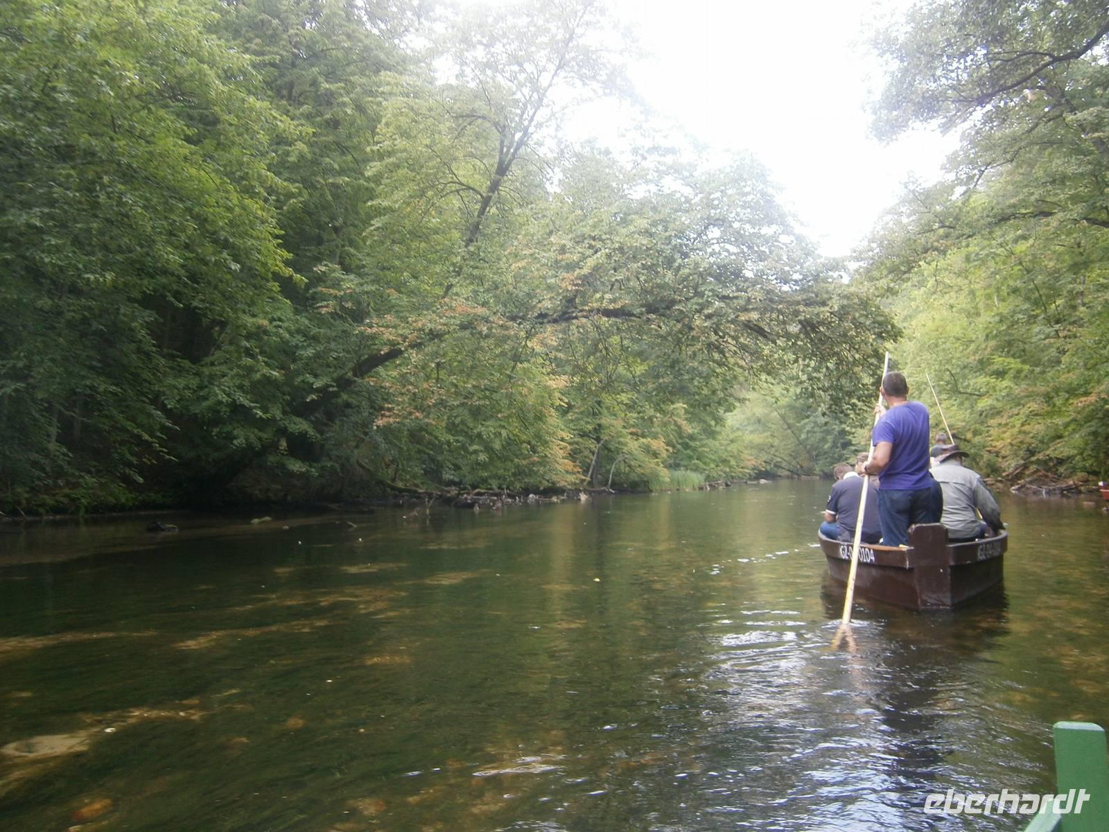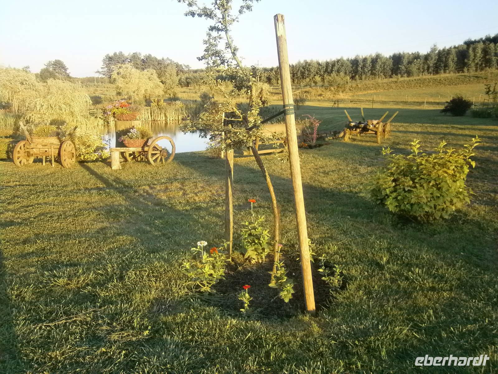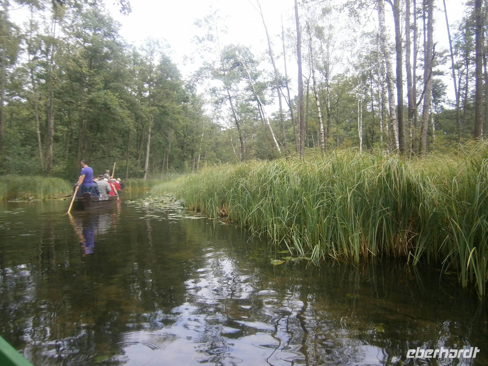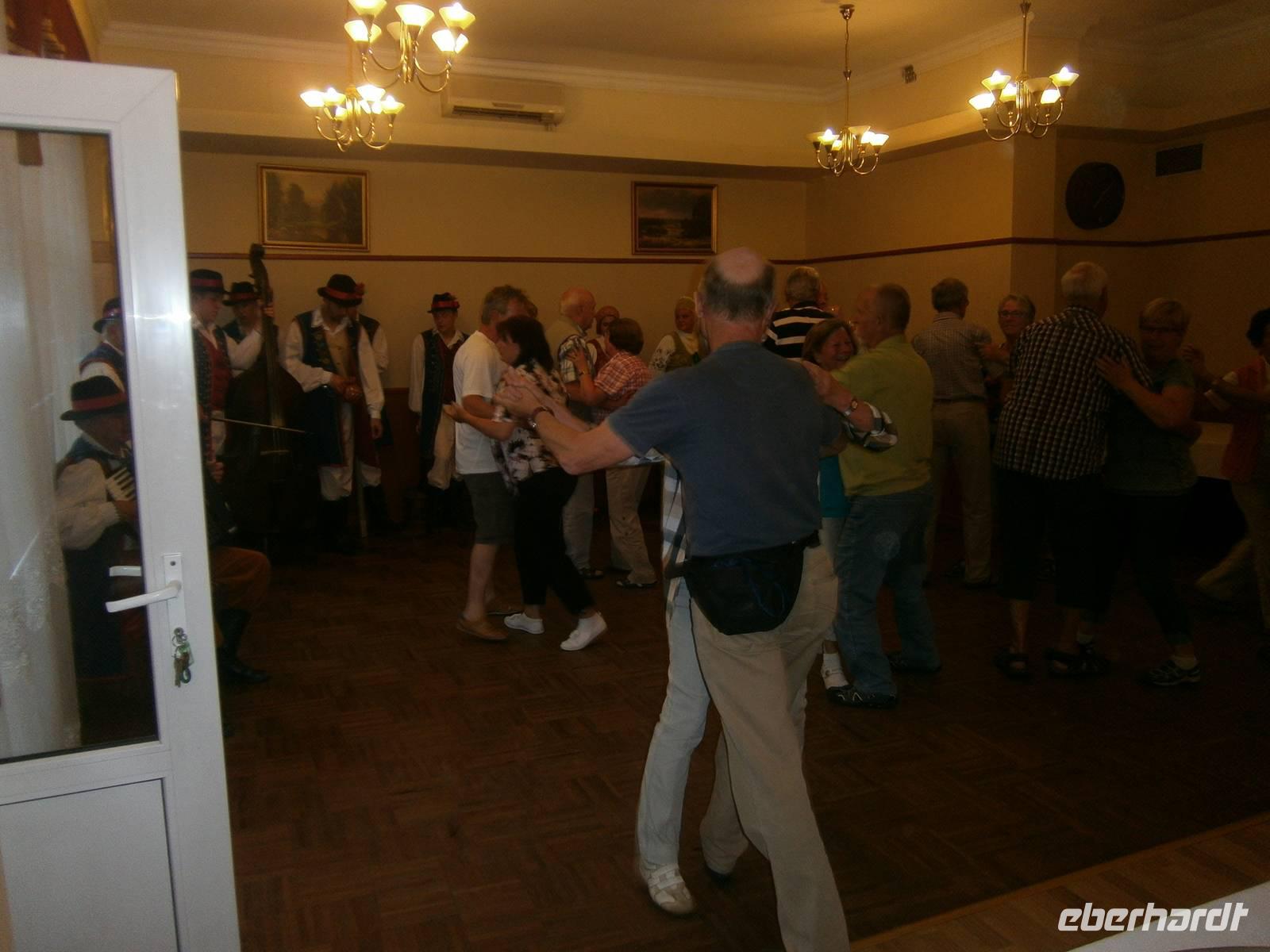 Danach brachte uns der Bus nach Krutynia, einen kleinen Ort am Flüßchen. Nach der Ankunft und bei trockenen Wetter erfolgte eine einstündige Staakenbootsfahrt auf dem insgesamt 99 km langen Flüßchen Krutynnia. Zuerst ging es durch unberührte Natur flussaufwärts, anschließend mit der Strömung flussabwärts. Wir sahen Schwäne mit ihrem Nachwuchs, ebenso Enten mit ihren Jungen, Fische in großer Anzahl und die Hinterlassenschaften der Biber. Nach einer kurzen Freizeit begaben wir uns nach Babieta, wo Eulalia einem Bauernhof betreibt. Auf der Fahrt dorthin wurden wir auf einem Waldweg von einer schönen Reiterin auf einem feurigen Hengst und mehreren Pferdekutschen empfangen. Mit einer längeren Kutschfahrt begann die Bauernhochzeit, die mit Musik und Tanz, Folklore und reichlich Essen und Trinken aufwartete. Auch das Brautpaar und ein in kürzester Zeit entstandenes Baby standen im Mittelpunkt des Geschehens. Natürlich wurde auch die Reisegruppe aktiv einbezogen. Dabei hatten alle Beteiligten einen großen Spaß.