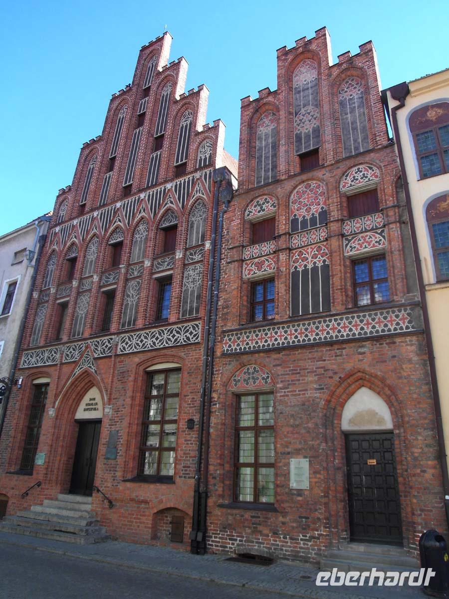 Wir reisen heute nach Südwesten. Unser Weg führt uns durchs Kulmer Land nach Westpreußen hinein. Die alte Hansestadt Thorn ist unser Ziel, die wir am frühen Nachmittag erreichen. Sie ist auch Geburtsort von Nikolaus Kopernikus, dem berühmten Astronomen. Bei einem Rundgang durch die Stadt sehen wir die Marien-, Hl. Geist-, und Johanneskirche, die stolzen Patrizierhäuser, sowie das mächtige Rathaus. Der 60 m hohe Turm wurde schon 1260 begonnen. Während die Bürger die Burg des deutschen Ordens im 15. Jh. komplett zerstörten, sind große Teile der Stadtmauer vor allem an der Weichsel noch gut erhalten. Viele mittelalterliche Speicher stehen direkt dahinter. Die viele Gotik in Thorns Strassen war ein Grund, die Altstadt 1997 auf die Welterbeliste der Unseco zu setzen. Uns jedoch zieht es in die vielen Cafes der jung wirkenden Universitätsstadt. Uns eines müssen wir auf jeden Fall kosten: Die berühmten Thorner Lebkuchen, die jenen aus Aachen oder Nürnberg in nichts nachstehen, und deren Rezepte bis ins 13. Jh. zurückreichen.
