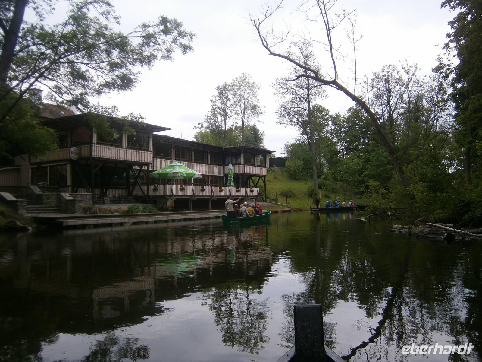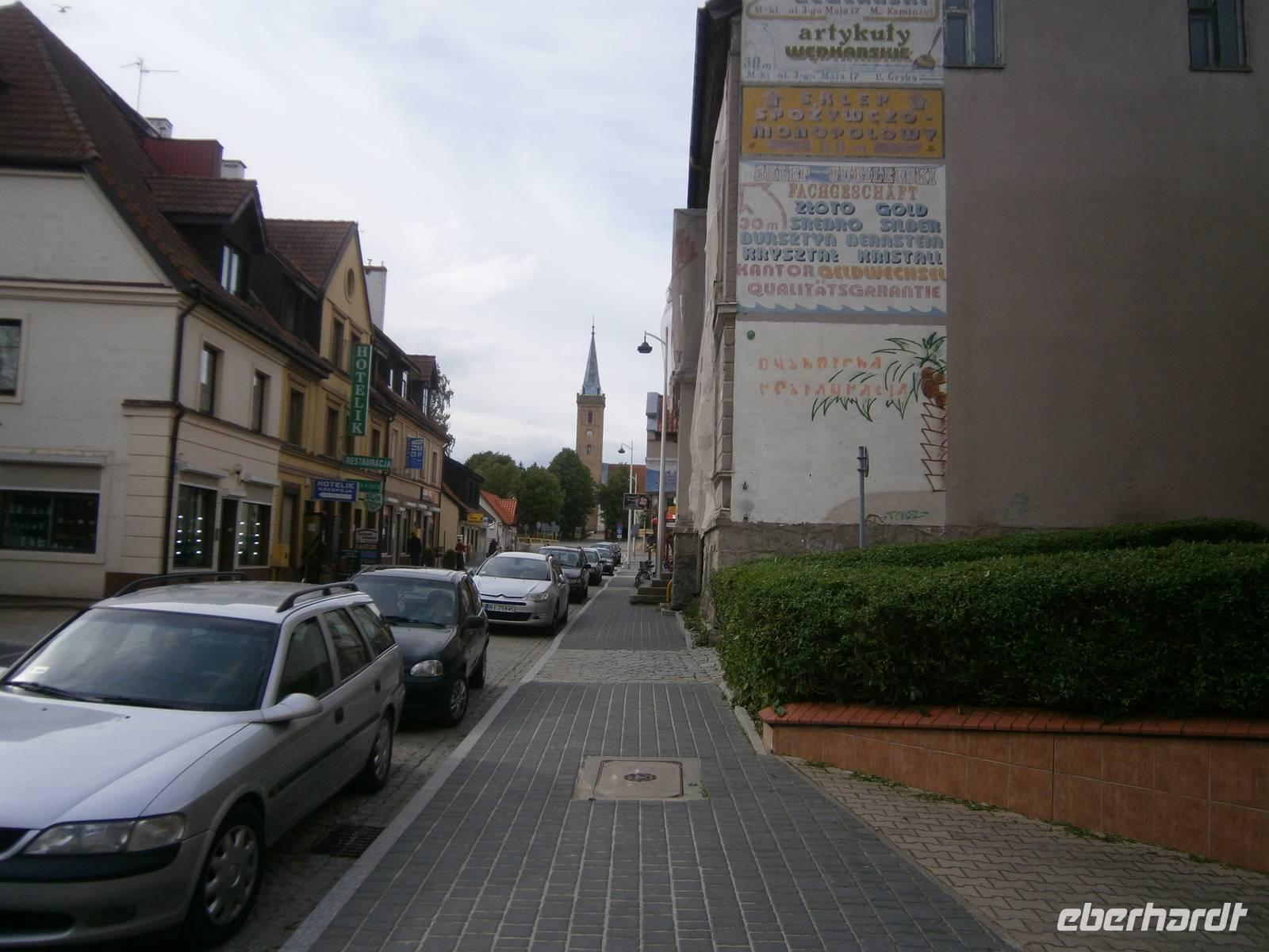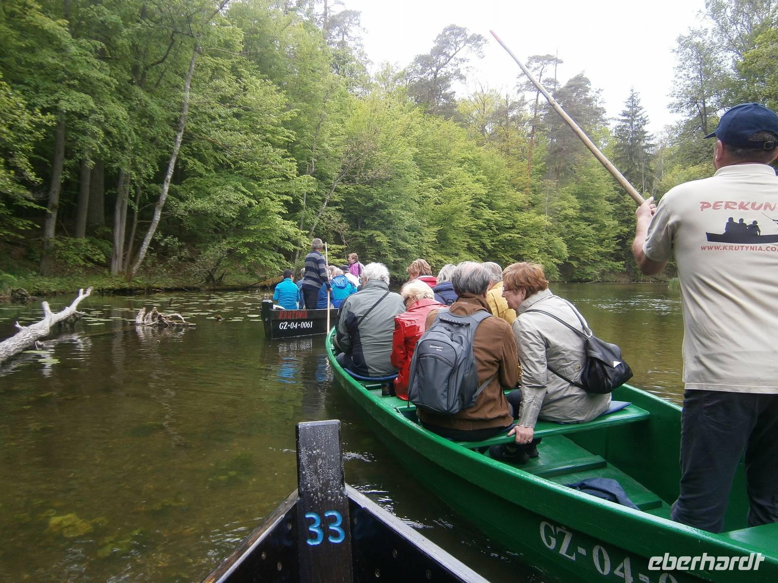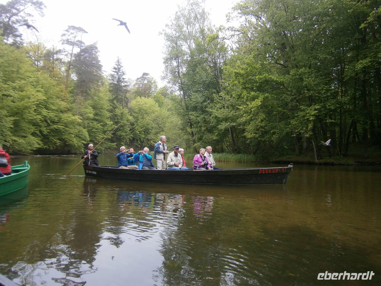 Der letzte Tag in dieser Region gehörte den südlichen Masuren. Zuerst besuchten wir in Kleinort das Geburtshaus des deutschen Schriftstellers Ernst Wiechert in der „Johannisburger Heide". Im Gedenkraum hörten wir mittels CD in deutscher Sprache Erklärungen zu seinem Leben und der Liebe zu seiner Heimat. Danach erreichten wir Krutynen, einen kleinen Ort an der Ktrutyna. Ein zünftiges Zanderessen in der Gaststätte „Mazuria" gehörte hier ebenso dazu, wie eine einstündige Staakenbootsfahrt auf dem 99 km langen Flüßchen Krutyna. Zuerst ging es durch unberührte Natur flußaufwärts anschließend mit der Strömung flussabwärts. Uns begegneten Kajakfahrer, Enten und ein Schwanenpaar mit sechs niedlichen Jungen. Im Wasser sahen wir zahlreiche Fische und „Blutsteine", zu denen uns Lukas die entsprechende Legende erzählte. Ein kleines Museum mit präparierten Tieren dieser Region und ein kleiner Markt rundeten den Besuch ab.