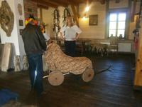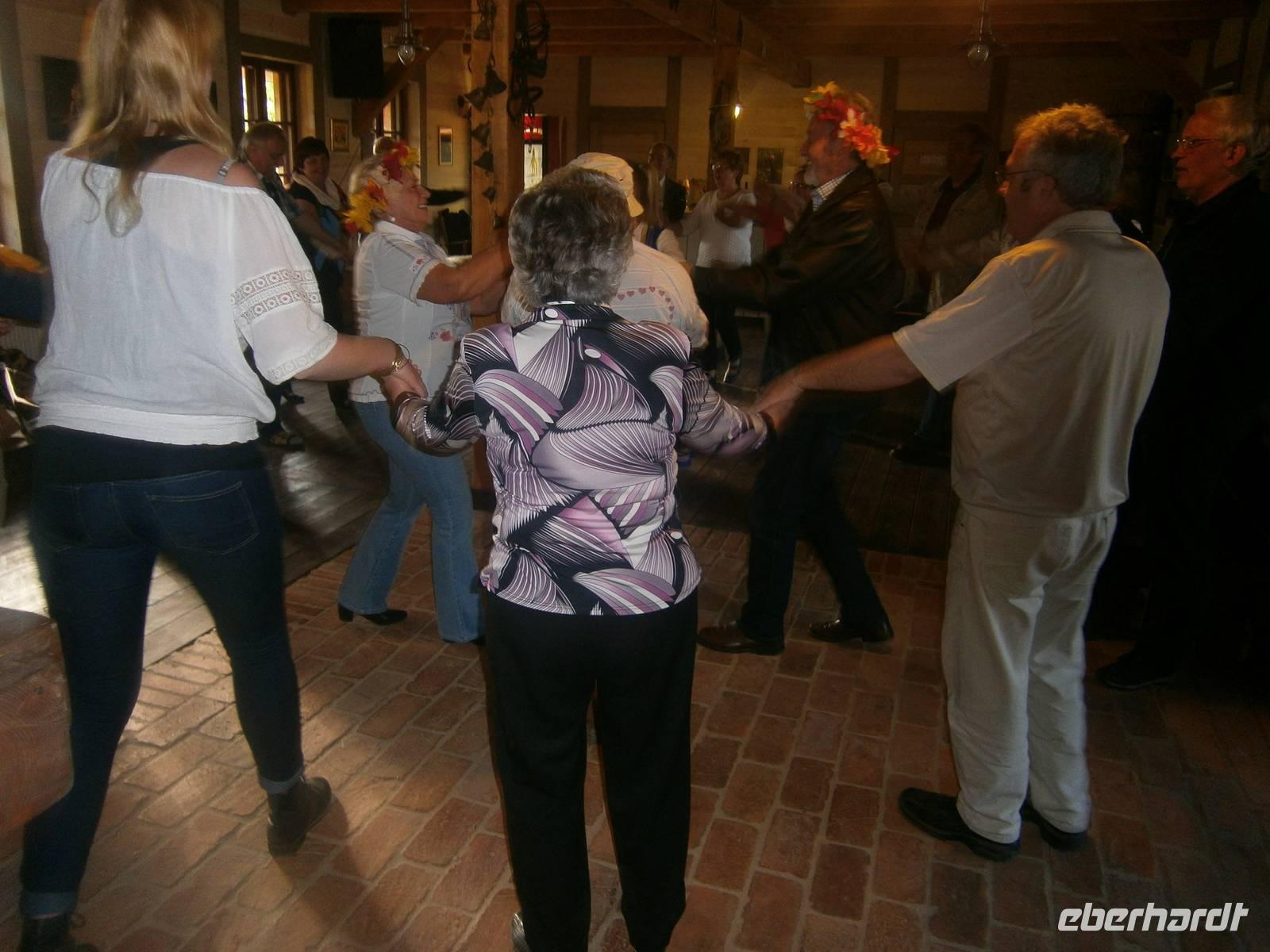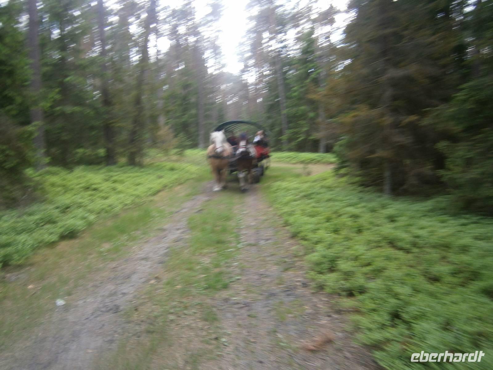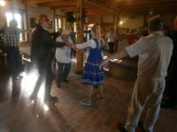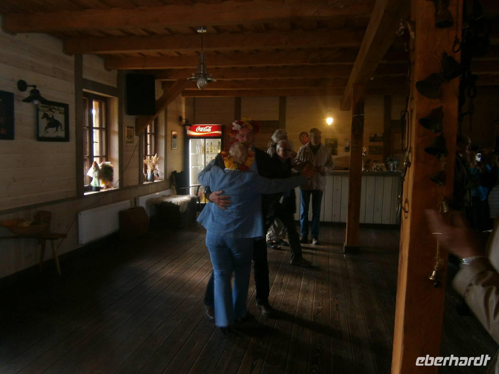 Die verbleibende Zeit bis zum Beginn der Bauernhochzeit nutzten wir, um in unser Hotel zurückzufahren und den Gästen die Gelegenheit zu geben sich etwas zu erholen. Danach fuhren wir zu Eulalia, die einen Bauernhof in der Nähe des Ortes Babieta betreibt. Auf dem Waldweg wurden wir von einer feurigen Reiterin empfangen. Unsere Gäste verließen den Bus und stiegen auf Pferdekutschen um. Dann ging es durch den Wald und idyllische Landschaft zum Bauernhof. Dort erwarteten uns ein Begrüßungsschnaps und polnische Leckereien. Bei Musik und Tanz verging die Zeit wie im Fluge. Auch „Brautpaar" und „Baby" wirkten mit und sorgten für den notwendigen Spaß und Humor.