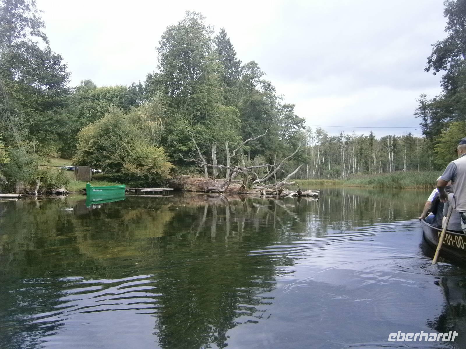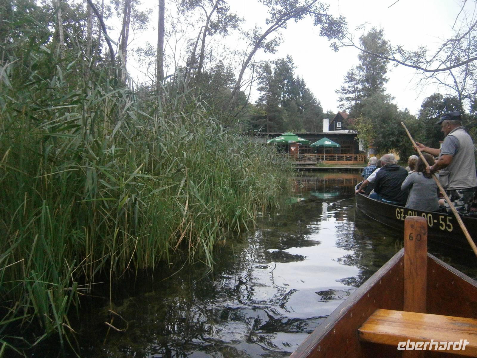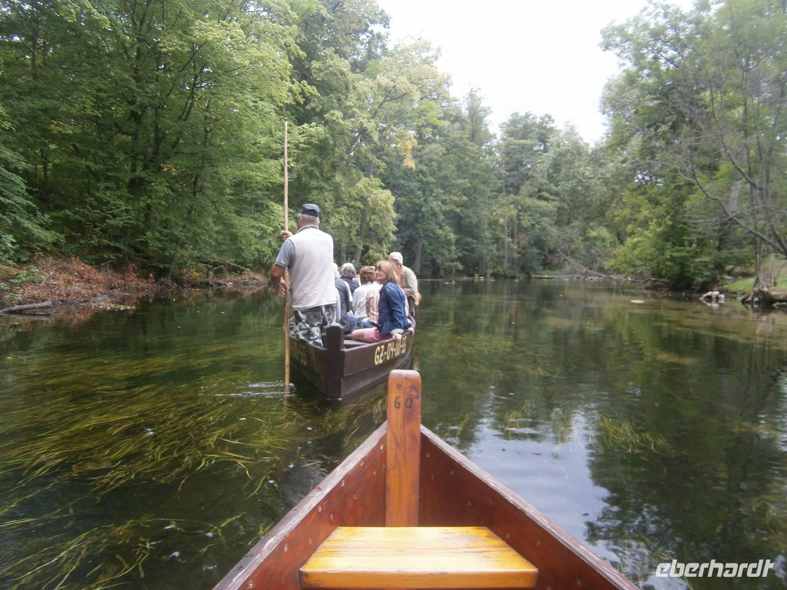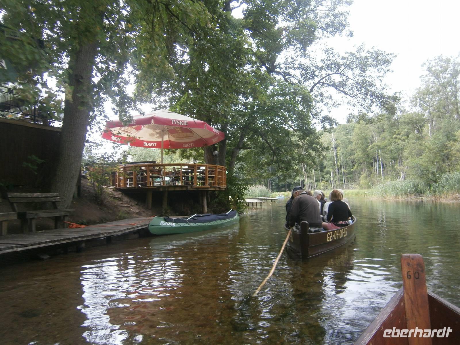 Gut gestärkt fuhren wir in die „Johannesburger Heide", nach Krutynen, einen kleinen Ort an der Krutyna. Hier erfolgte eine Staakenbootsfahrt auf dem insgesamt 99 km langen Flüßchen. Zuerst ging es durch unberührte Natur flußaufwärts anschließend mit der Strömung flussabwärts. Uns begegneten Kajakfahrer, Enten und im Wasser sahen wir zahlreiche Fische und sog. „Blutsteine".