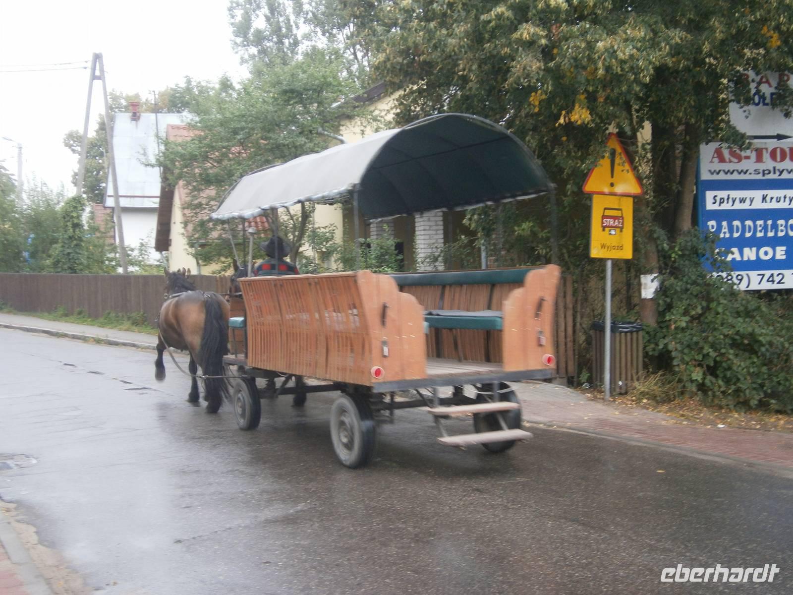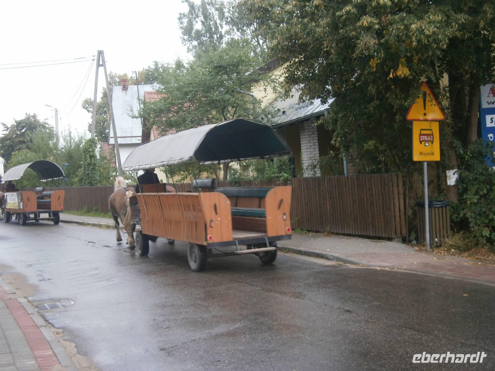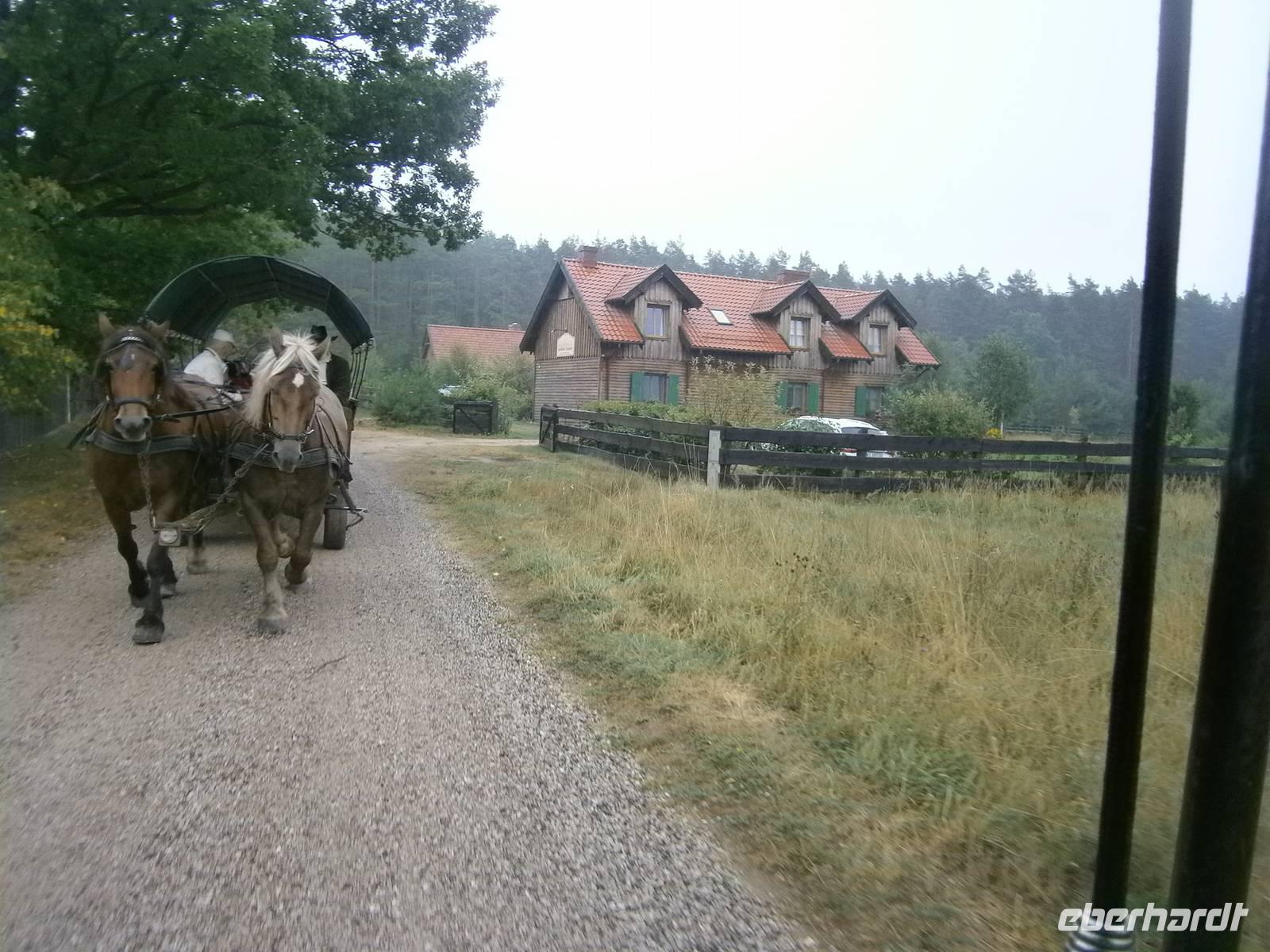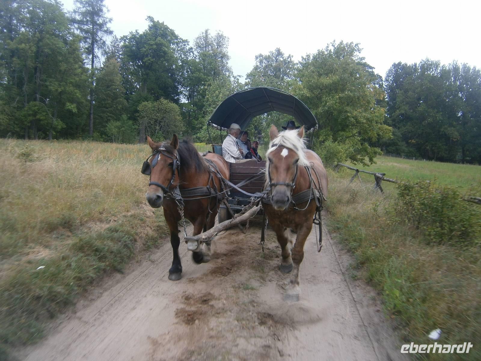 Kaum von Bord unserer Staakenboote, erwarteten uns drei Pferdegespanne, die uns nach einer längeren Fahrt durch die herrliche Natur Masurens zur Bauernhochzeit in das Restaurant „Mazuria" brachten.