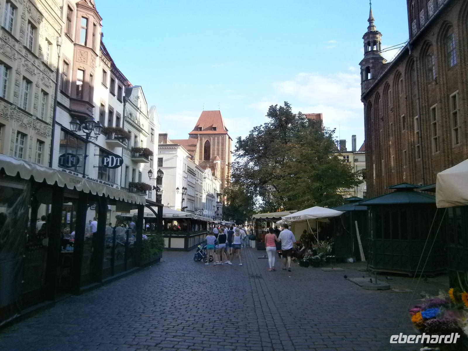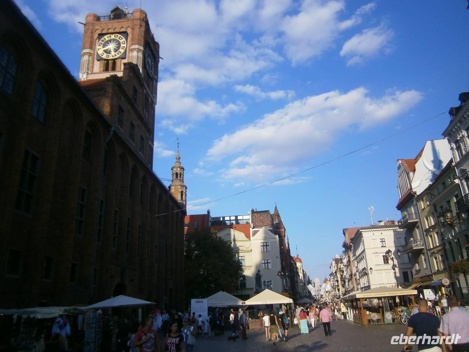 In der Altstadt ist die Bausubstanz sehr gut erhalten geblieben, da die Stadt weder Kriegszerstörungen noch Hochwasserkatastrophen erlebt hat. Thorn, wie die Stadt früher hieß, war von 1264 bis 1411 Mitglied der Hanse und gehörte bis in das 17.Jh. zur Elite der europäischen Handelsstädte. Über Jahrhunderte war sie das Zentrum des Kornhandels. Das Getreide wurde von den Äckern Ostpolens auf der Weichsel nach Danzig verschifft. An diese Zeit der damaligen Weichselschiffer erinnert auch der Flößer-Brunnen am Rathaus. Ein Flößerjunge lockt mit seiner Geige die Frösche aus der Stadt.