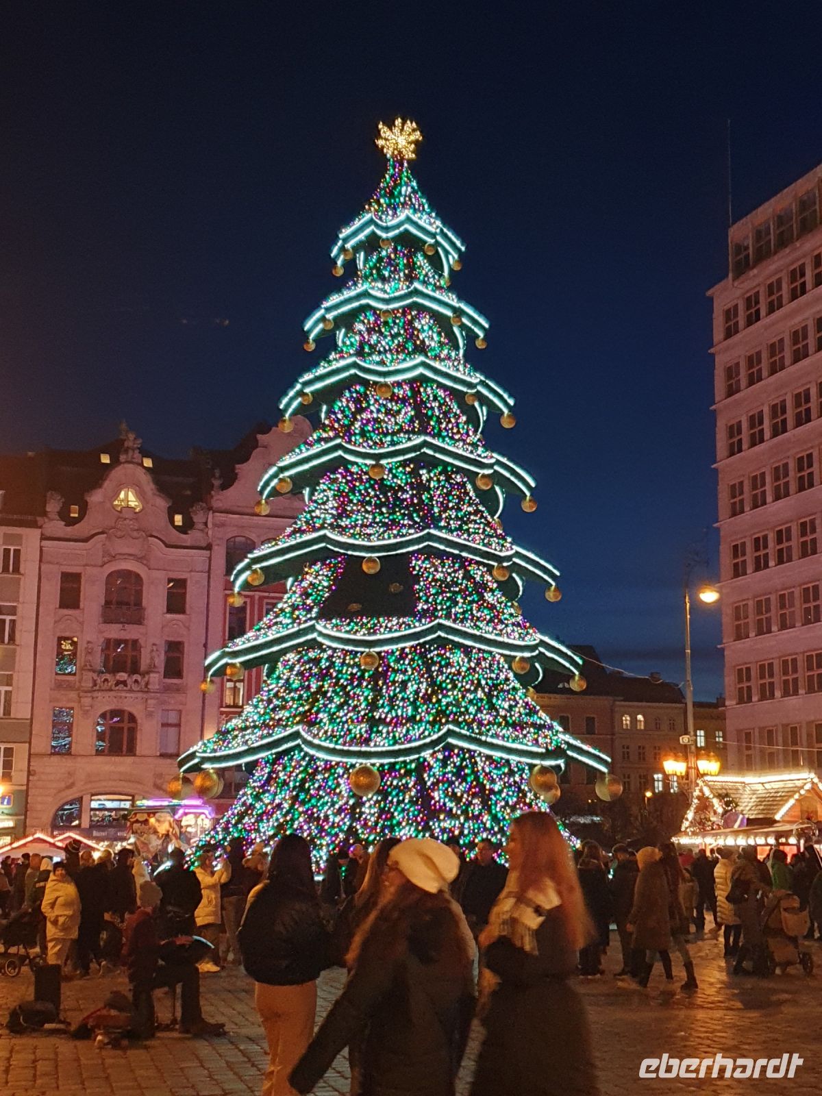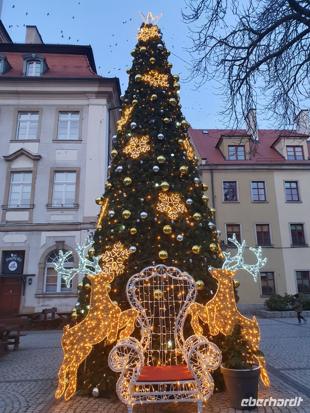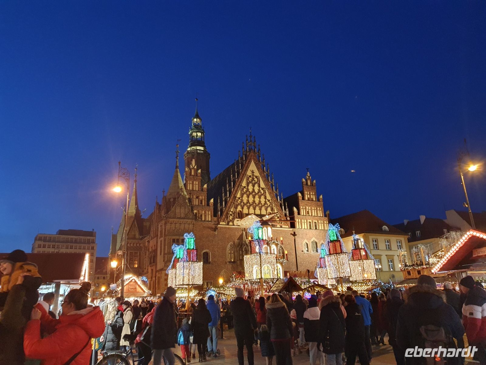 Auf polnischer Seite machten wir dann eine längere Pause, wo man schon die Möglichkeit hatten Euro in Zloty zu tauschen. Bis auf zwei kleinere Staus kurz vor Breslau kamen wir aber sehr gut durch und erreichten am Nachmittag unser Hotel NOVOTEL Centrum. Nachdem alle ihre Zimmer bezogen haten, unternahmen wir einen ersten orientierenden Spaziergang. An den letzten Tagen des Jahres hatte der Weihnachtsmarkt noch geöffnet, sodass man zwischen den kleinen Holzbuden schlendern und polnische Spezialitäten, wie geräucherten Ziegenkäse, Gofry, Cabanossi-Würstchen oder Naleszniki probieren konnte. Der gesamte Rynek mitsamt Rathaus war wunderschön beleuchtet und es gab auch einen imposanten Weihnachtsbaum. Der Rynek ist der Mittelpunkt der Breslauer Innenstadt. Mit Maßen von 178 x 208 Meterhandelt es sich hierbei um einen der größten mittelalterlichen Marktplätze.