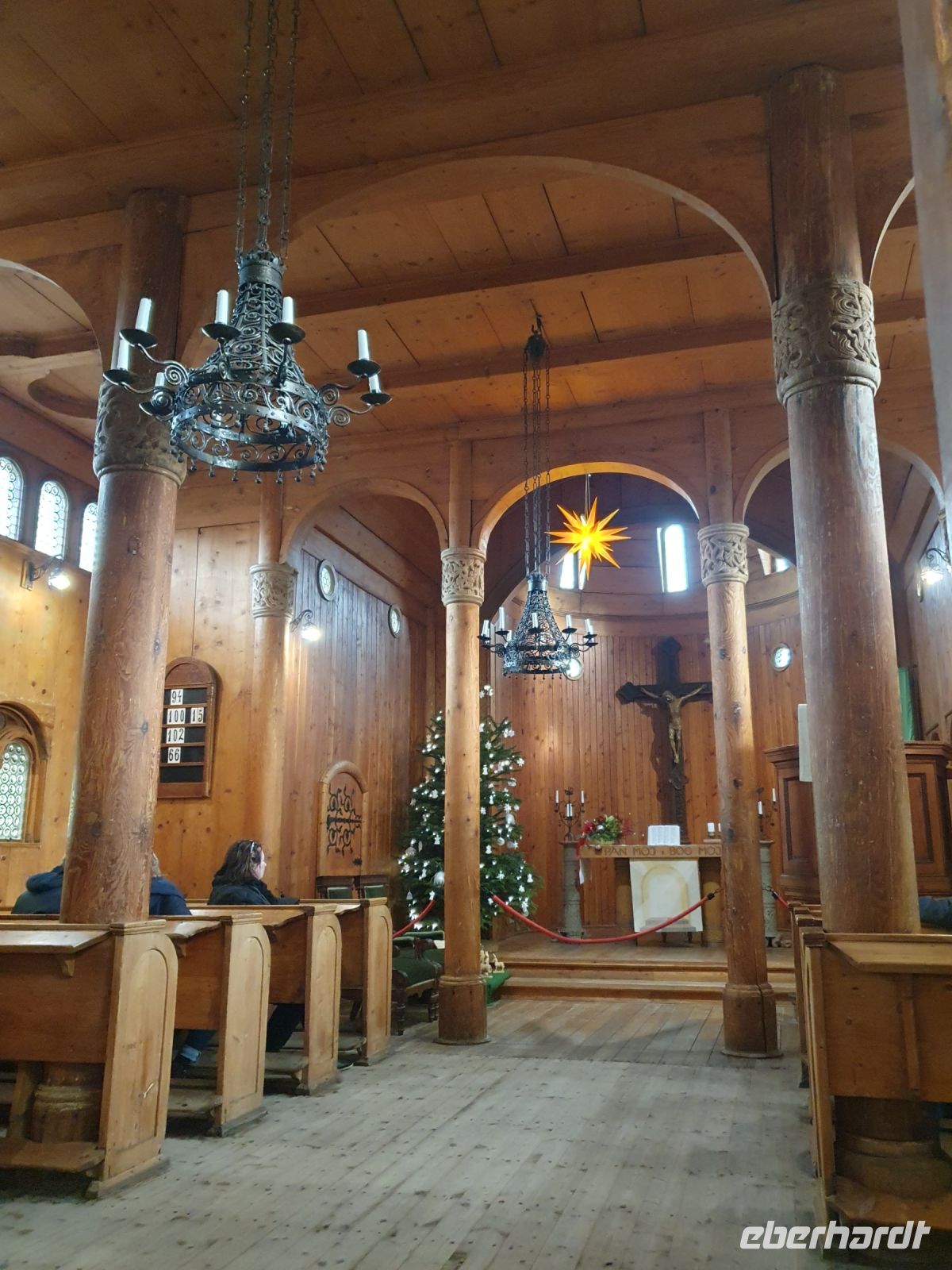 Die Stabkirche Wang wurde ursprünglich im norwegischen Ort Vang erbaut. König Friedrich Wilhelm IV. erwarb diese im Jahr 1841 und ließ sie in Karpacz originalgetreu wiederaufbauen. Im Inneren der Kirche haben wir über Band mehr über die Geschichte der Kirche und ihre Architektur erfahren.