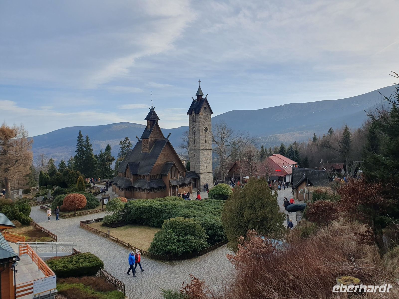 Nach einer kurzen Nacht, stärkten wir uns beim Neujahrsfrühstück. Um 10.00 Uhr brachen wir aber schon wieder auf zu unserem Ausflug in das polnische Riesengebirge auf. Erster Halt war hier der Kurort Karpacz, in dem in den letzten Jahre zahlreiche neue Hotels und Appartements entstanden sind. Bei bestem Wetter und milden Temperaturen bot sich uns sogar ein direkter Blick auf die Schneekoppe, die 1603 Metern über dem Meeresspiegel liegt und somit der höchste Gipfel im Riesengebirge ist. Nach einem kurzen, aber steilen Aufstieg erreichten wir die Stabkirche Wang.