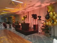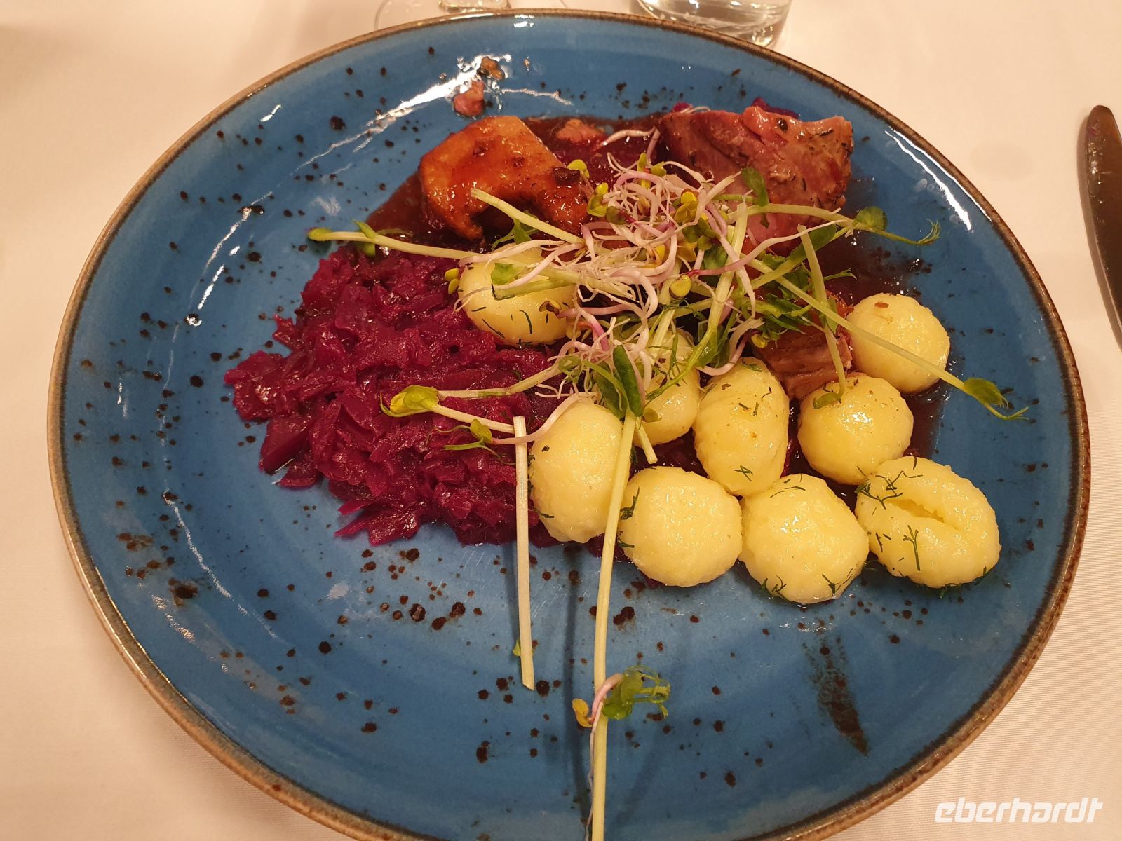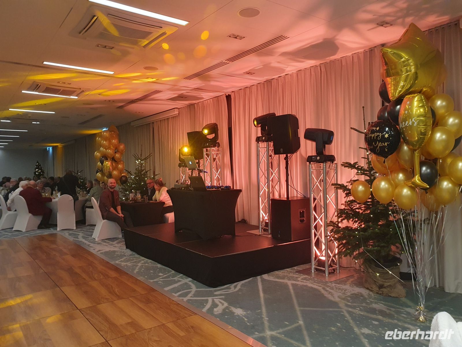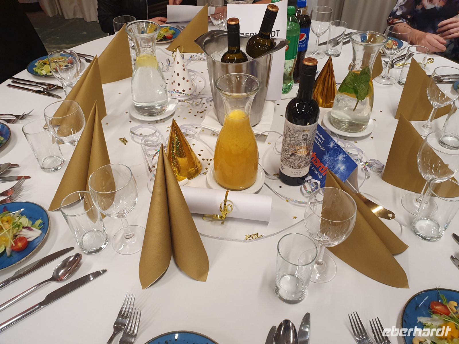 Um 20.00 Uhr durften wir dann in einen wunderschön in Weiß und Schwarz/Gold geschmückten Saal eintreten. In der Mitte befanden sich eine kleine Bühne und eine Tanzfläche. Für Eberhardt TRAVEL waren insgesamt drei Tische reserviert und der Abend begann zunächst mit einem servierten Drei Gang-Menü, das aus einem frischen Salat, einer herzhaften Pilzsuppe und confierter Entenbrust mit Pflaumensauce, Gnocchi und Rotkohl bestand. Getränke, wie Wasser, Säfte, Softdrinks, offene Weine und Bier wurden immer nachgefüllt. Nach dem Menü konnte man sich am süßen Buffet und kalten Buffet und nach 23.00 Uhr auch am warmen Buffet bedienen.