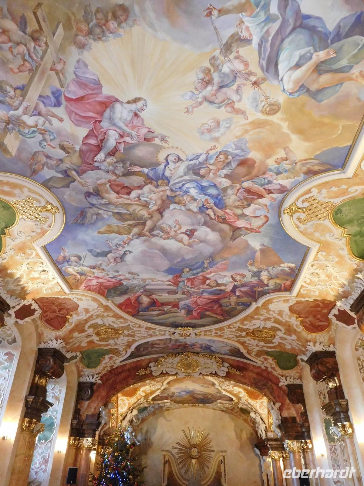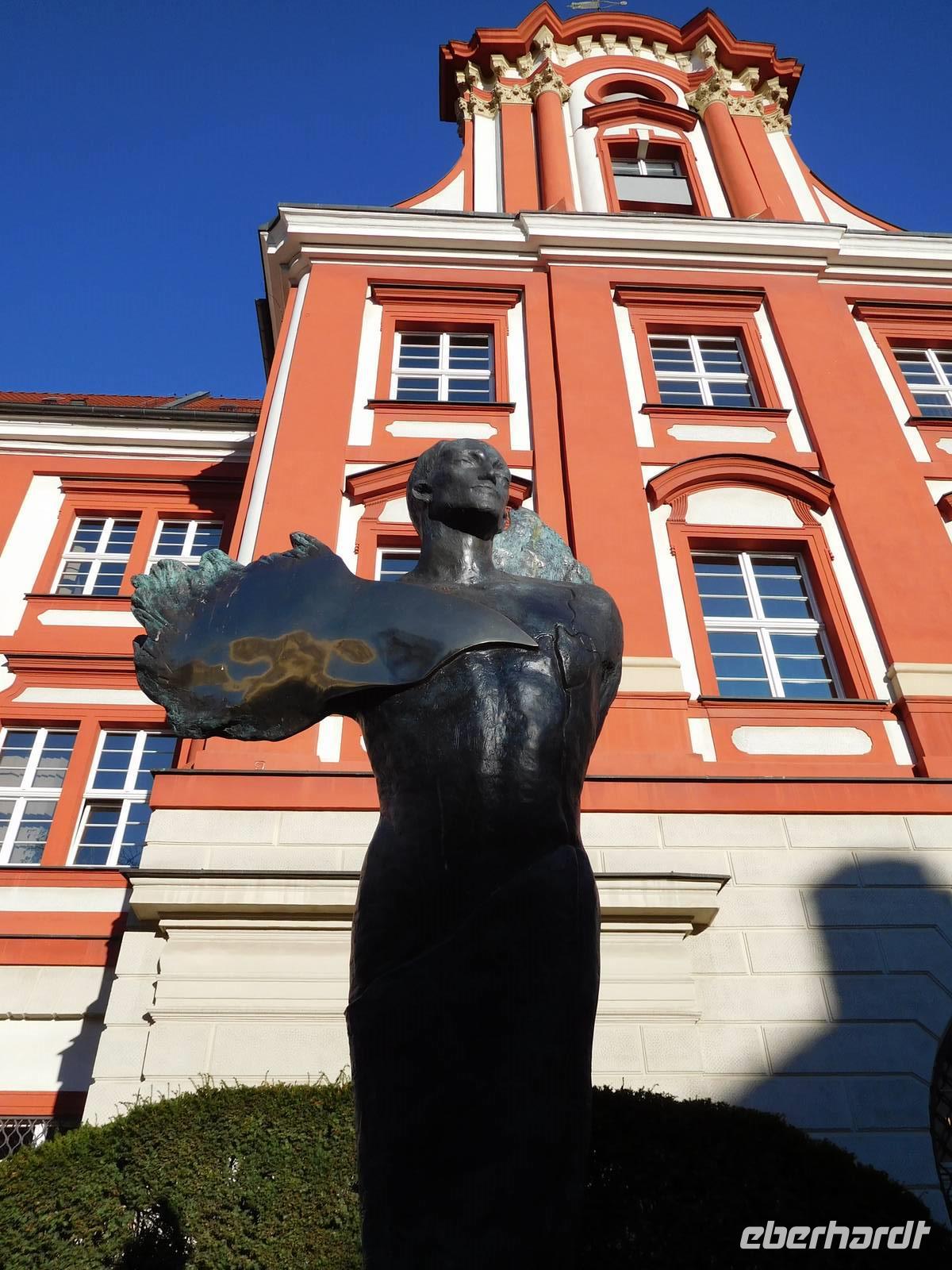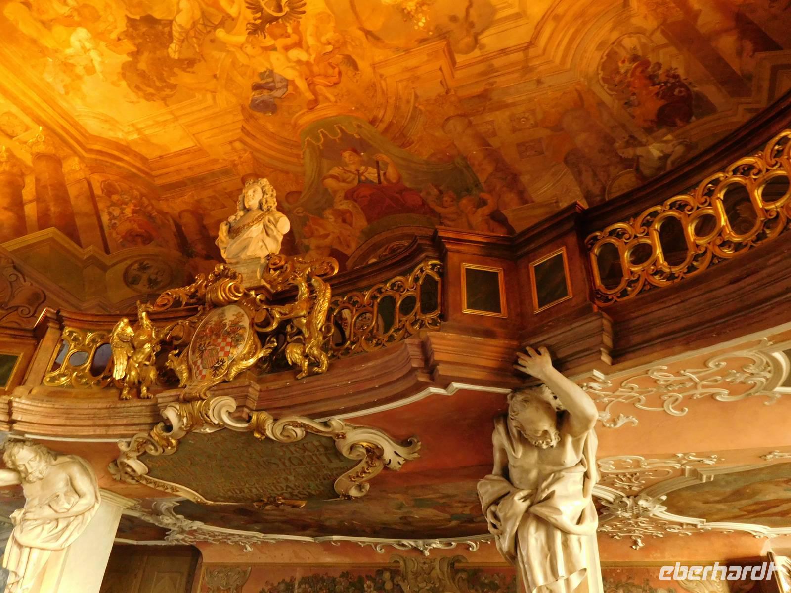 Am Morgen machten wir uns erst einmal mit den schönsten Sehenswürdigkeiten Breslaus bekannt: der Dominsel und der Altstadt rund um den Rynek. Da unser Hotel die perfekte Ausgangslage bot, konnten wir gleich zu Fuß starten. Unser Guide Andreas wusste viel spannendes über die Sehenswürdigkeiten und das heutige Leben in Breslau zu erzählen. Im Breslauer Dom durften wir in die kleinen Kapellen, wo es sogar noch mehr reiche Verzierungen zu bestaunen gab als im Hauptschiff des Doms. Weiter führte unser Spaziergang am Bischofssitz und an barocken Denkmälern vorbei, bis wir in der Hala Targowa kurz pausierten. In der alten Markthalle kann man auch heute noch alles kaufen, was das Herz begehrt. Weiter, am Ossolineum vorbei, liefen wir nun zur Universität. Diese beherbergt die wohl schönste Aula der Welt, reich an Gold, Stuck und Malerei. Eine Etage weiter unten befindet sich der Musiksaal der Universität, der ebenfalls von einer wunderschönen Deckenmalerei geziert wird.