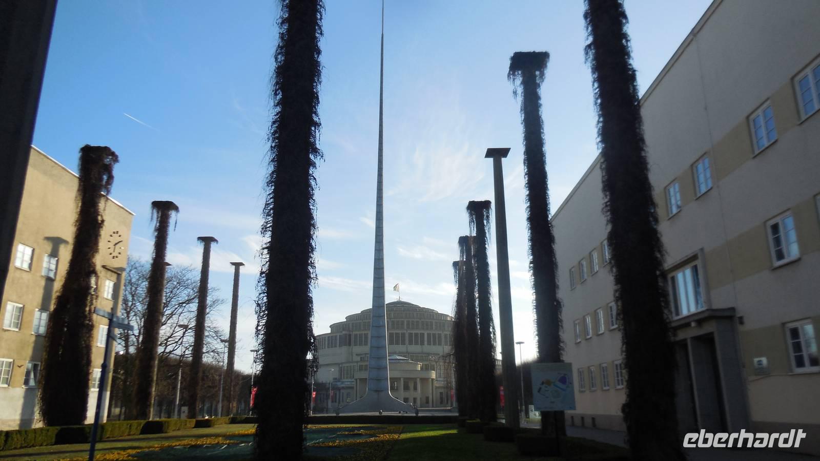 Weiter auf der Stadtrundfahrt erreichen wir nun die Jahrhunderthalle. Dieses beeindruckende Bauwerk, von Max Berg neben zahlreichen Architekten mit konstruiert, weißt eine Kuppel mit einer Spannweite von 65 m auf. Lange zählte diese Kuppel zu den größten in der ganzen Welt.