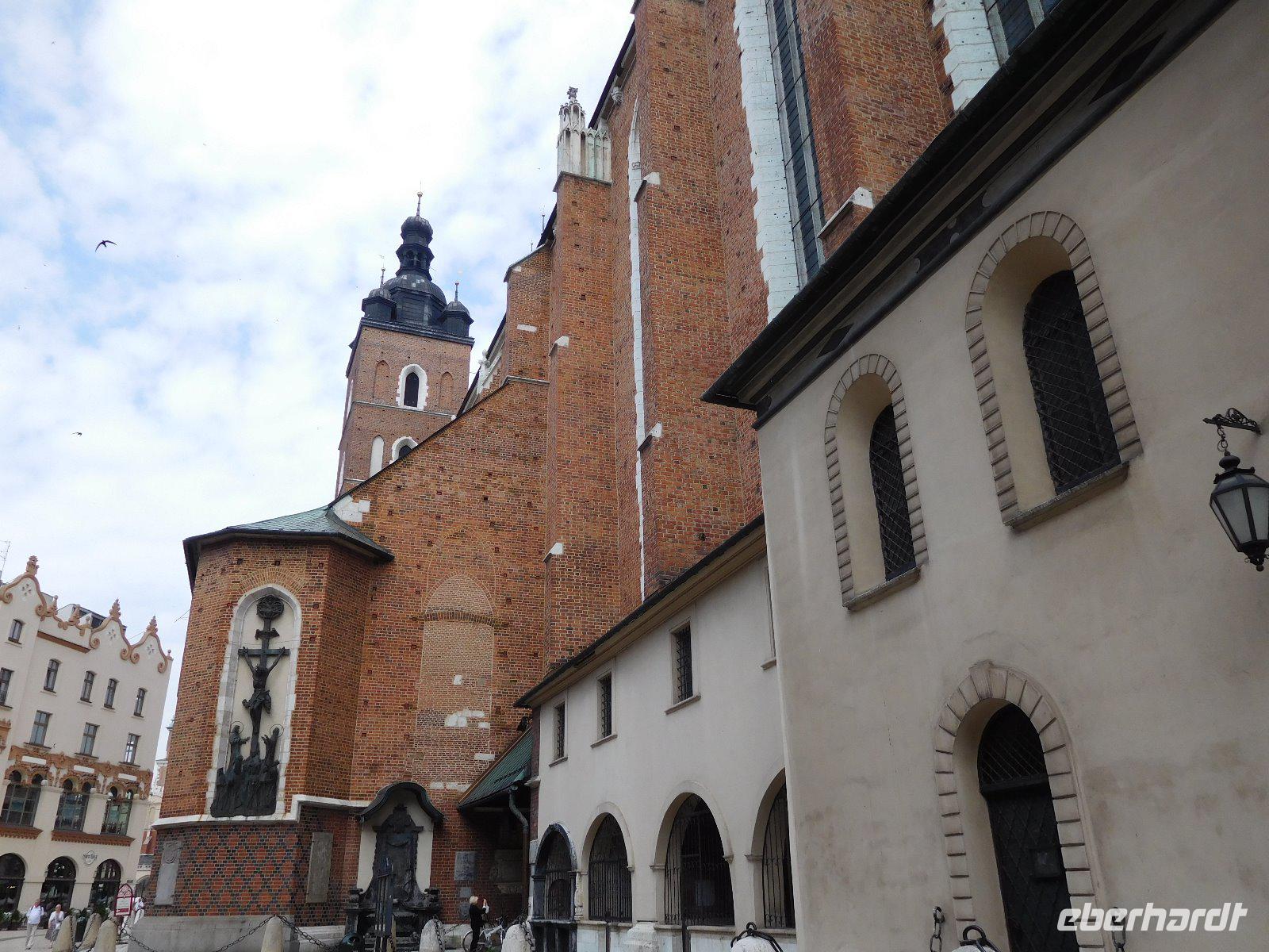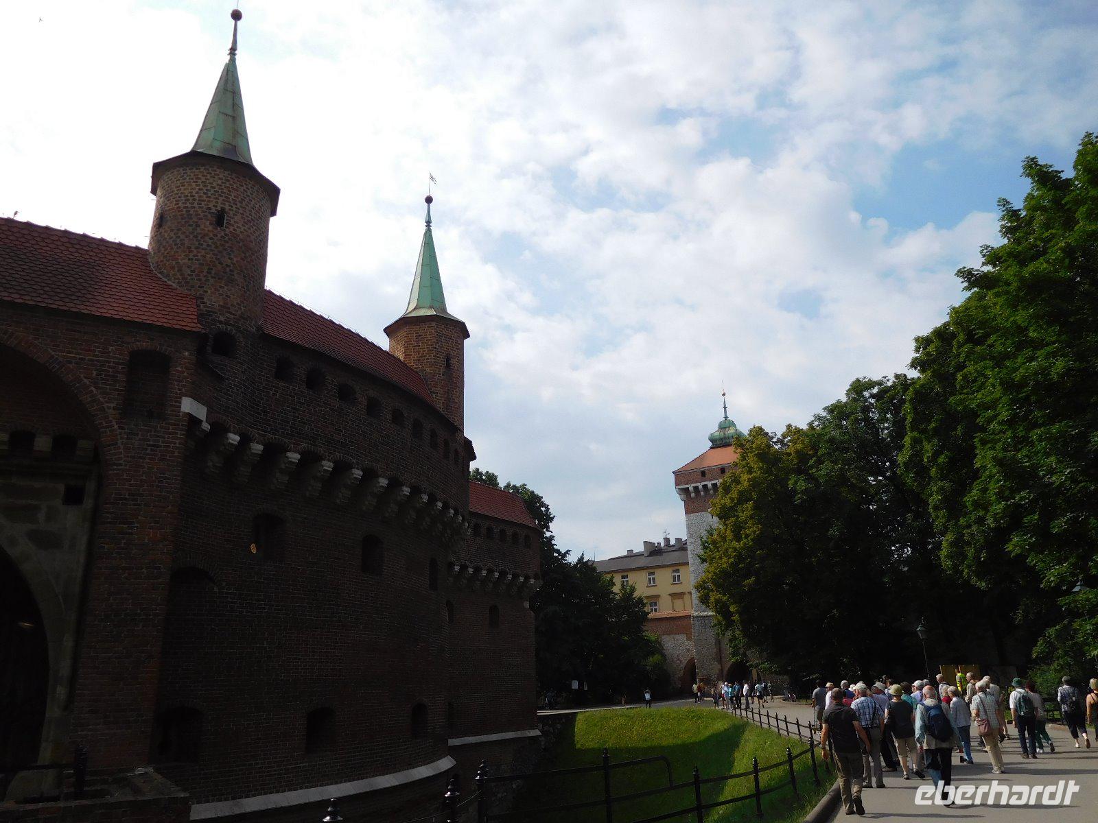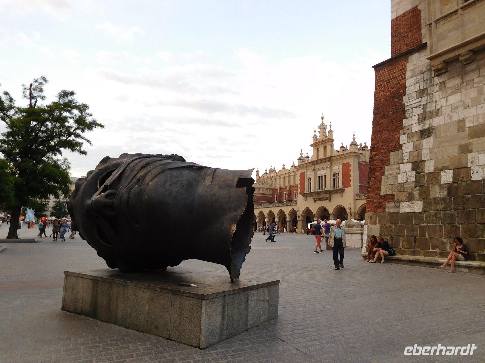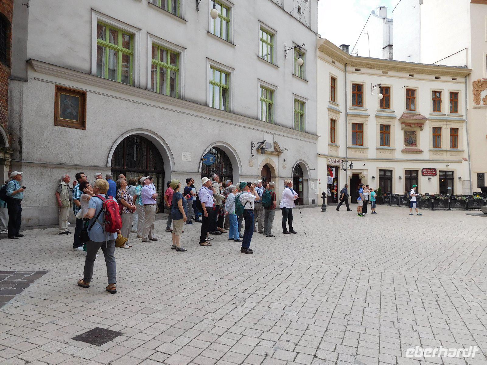 Gleich am Morgen starteten wir gemeinsam mit Guide Ela zum Stadtspaziergang durch Krakau, der uns zuerst an der elfenbeinweißen Florianskapelle mit ihrer barocken Gestalt aus dem 17. Jahrhundert, dann am - an diesem Vormittag noch verhüllten - Grundwald-Denkmal vorbei zum Barbakan. Dieses wuchtige Verteidigungswerk vor der Stadtmauer steht seit dem 15. Jahrhundert zum Schutz der Krakauer Stadtmitte bereit. In die Krakauer Altstadt selbst gelangten wir durch das Florianstor aus dem 14. Jahrhundert, dem letzten erhaltenen Stadttor der Krakauer Stadtmauer. Weiter führte uns Ela durch die mittelalterlichen Gassen, die nicht nur dank der warmen Temperaturen italienisch anmuteten, am Krakauer Juliusz-Slowacki-Theater vorbei bis hin zum kleinen Rynek. Nun war die Zeit für ein besonderes Schauspiel: Das Hejnal wurde vom Turm der Marienkirche gespielt. Hier spielt ein Trompeter jede volle Stunde diese Melodie in jede Himmelsrichtung Krakaus. Das Spiel endet in Krakau abrupt, womit es an den Mongolenangriff im 13. Jahrhundert erinnert. Der damals warnende Trompeter wurde, so die Legende, während des Trompetenspiels von einem Pfeil tödlich getroffen. Heute wird das Hejnal Mariacki täglich um 12 Uhr im Polnischen Radio gespielt. Weiter führte uns der Weg über den Rynek und durch die Tuchhallen, in denen heute Polnische Folklore und Handwerkskunst feilgeboten wird. Der Rathausturm wurde zum markanten Treffpunkt und die moderne Darstellung des Eros-Kopfes von allen bestaunt: Kopflos und Blind, so wird die Liebe in Krakau symbolisiert.