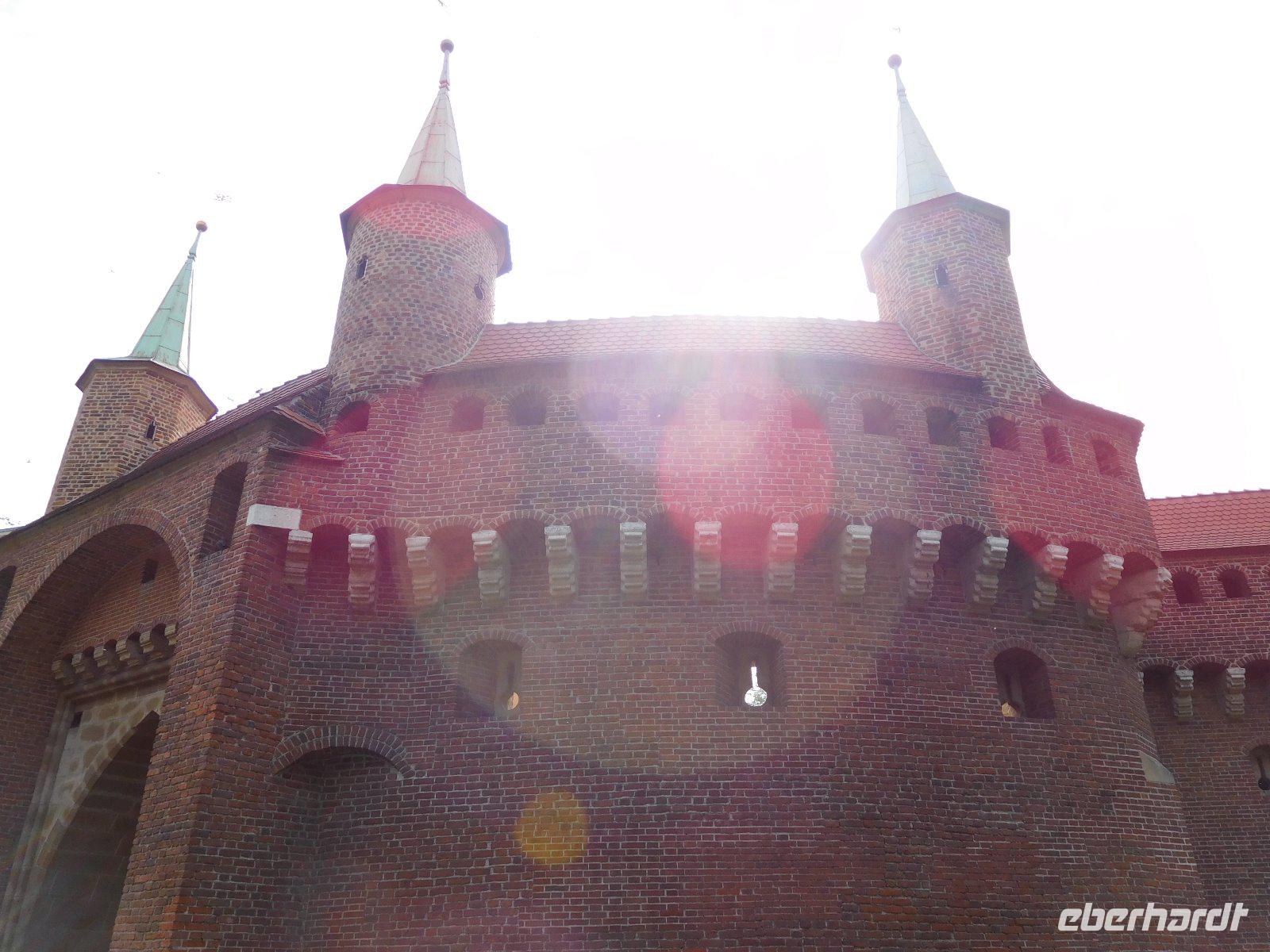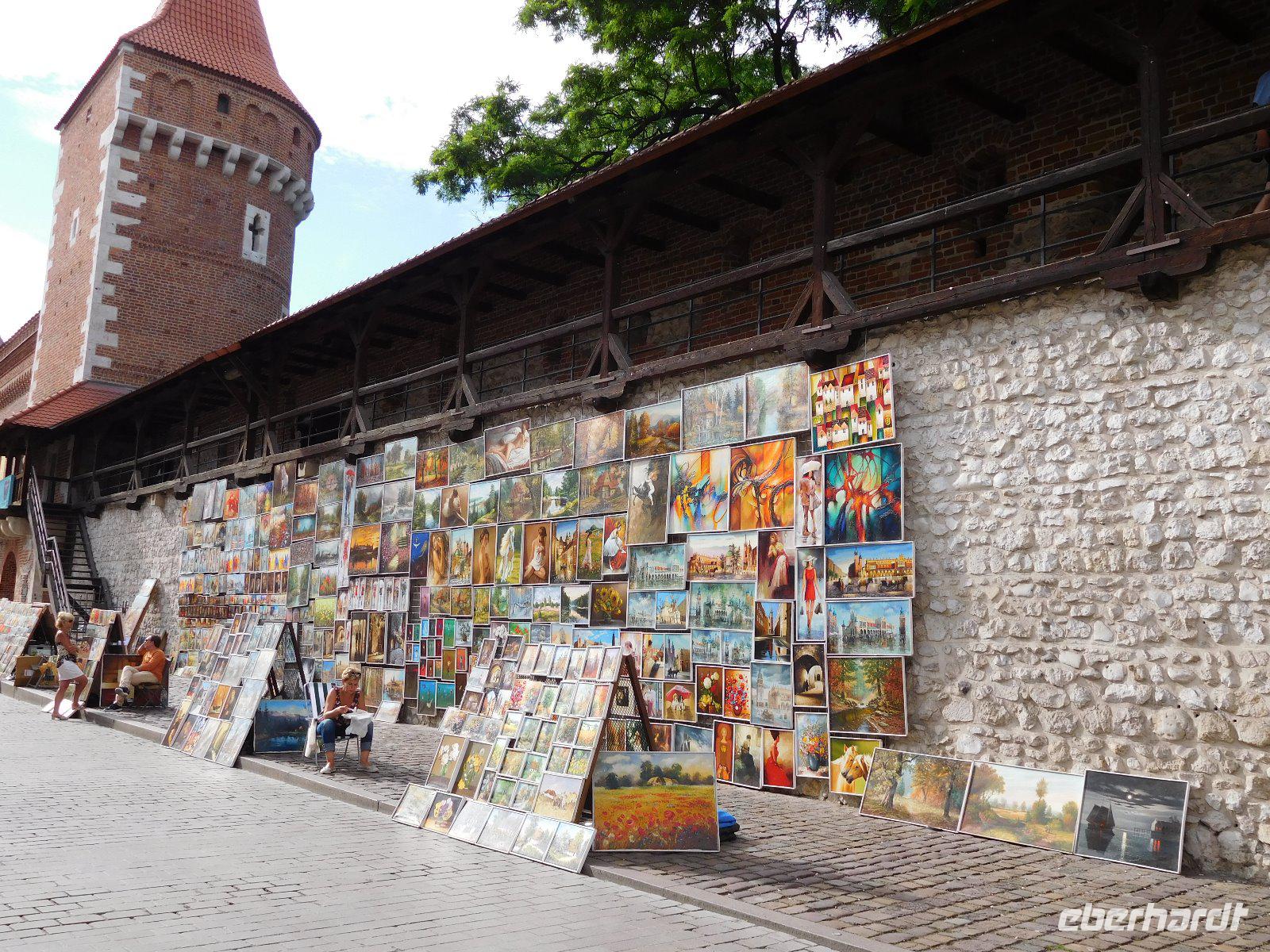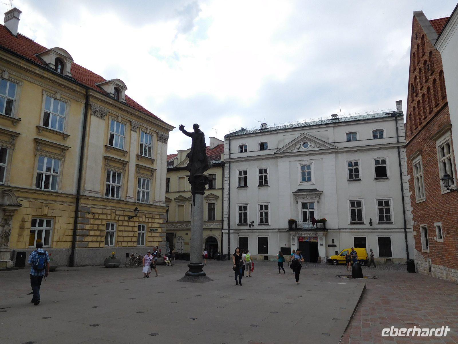 Gleich am Morgen starteten wir gemeinsam mit Guide Ela zum Stadtspaziergang durch Krakau, der uns zuerst an der elfenbeinweißen Florianskapelle mit ihrer barocken Gestalt aus dem 17. Jahrhundert, dann am - an diesem Vormittag noch verhüllten - Grundwald-Denkmal vorbei zum Barbakan. Dieses wuchtige Verteidigungswerk vor der Stadtmauer steht seit dem 15. Jahrhundert zum Schutz der Krakauer Stadtmitte bereit. In die Krakauer Altstadt selbst gelangten wir durch das Florianstor aus dem 14. Jahrhundert, dem letzten erhaltenen Stadttor der Krakauer Stadtmauer. Weiter führte uns Ela durch die mittelalterlichen Gassen, die nicht nur dank der warmen Temperaturen italienisch anmuteten, am Krakauer Juliusz-Slowacki-Theater vorbei bis hin zum kleinen Rynek. Nun war die Zeit für ein besonderes Schauspiel: Das Hejnal wurde vom Turm der Marienkirche gespielt. Hier spielt ein Trompeter jede volle Stunde diese Melodie in jede Himmelsrichtung Krakaus. Das Spiel endet in Krakau abrupt, womit es an den Mongolenangriff im 13. Jahrhundert erinnert. Der damals warnende Trompeter wurde, so die Legende, während des Trompetenspiels von einem Pfeil tödlich getroffen. Heute wird das Hejnal Mariacki täglich um 12 Uhr im Polnischen Radio gespielt. Weiter führte uns der Weg über den Rynek und durch die Tuchhallen, in denen heute Polnische Folklore und Handwerkskunst feilgeboten wird. Der Rathausturm wurde zum markanten Treffpunkt und die moderne Darstellung des Eros-Kopfes von allen bestaunt: Kopflos und Blind, so wird die Liebe in Krakau symbolisiert.