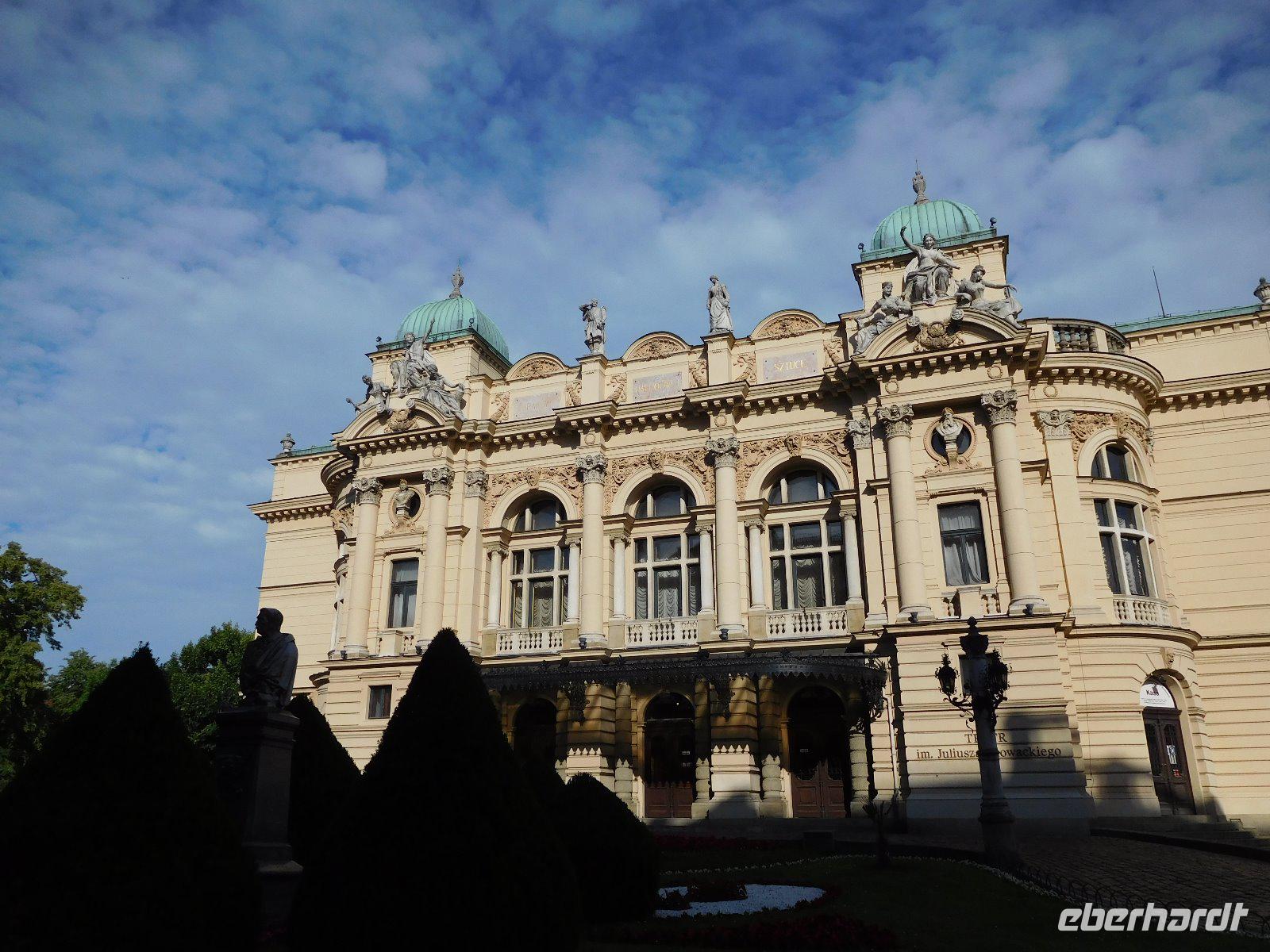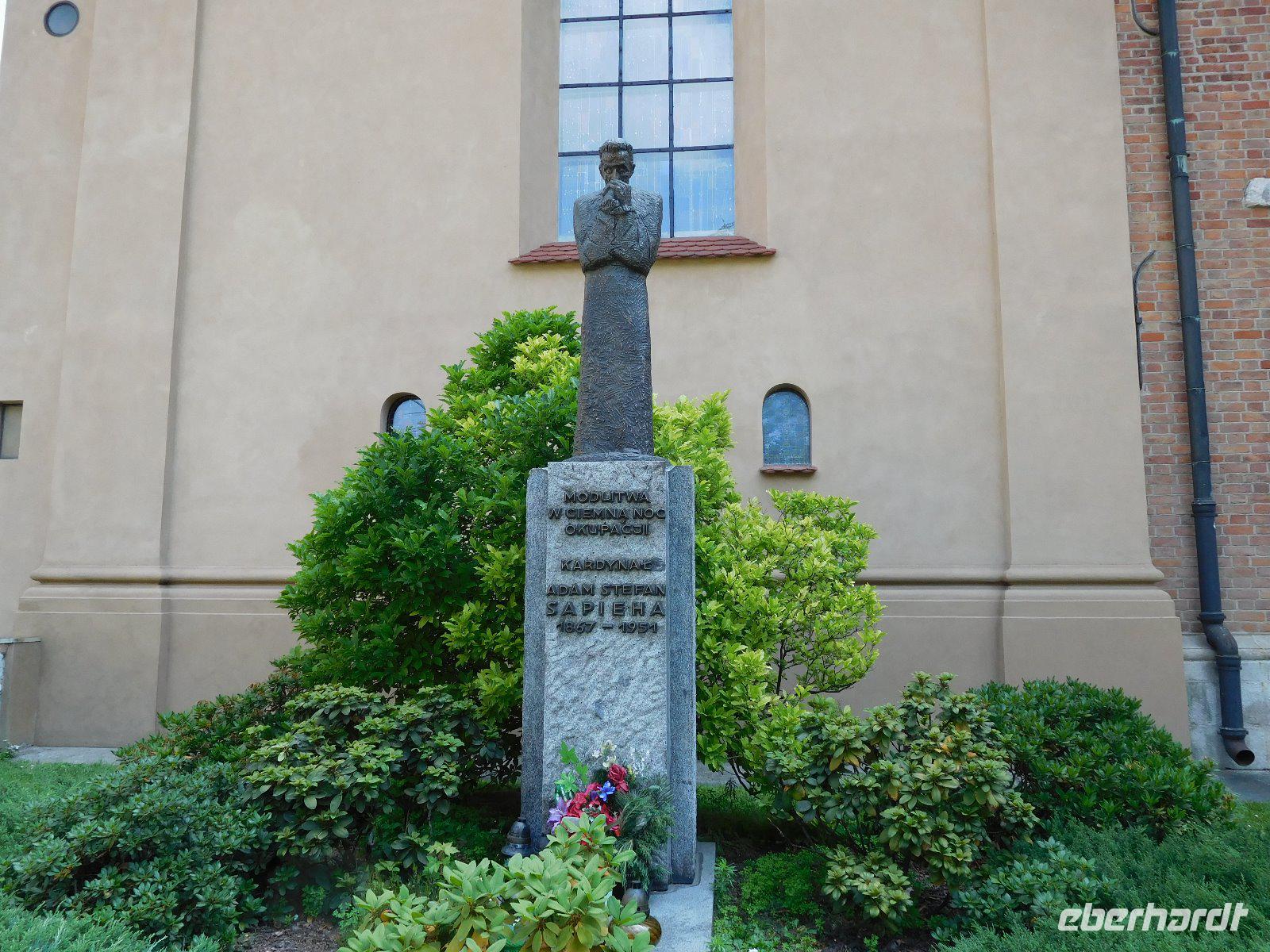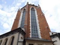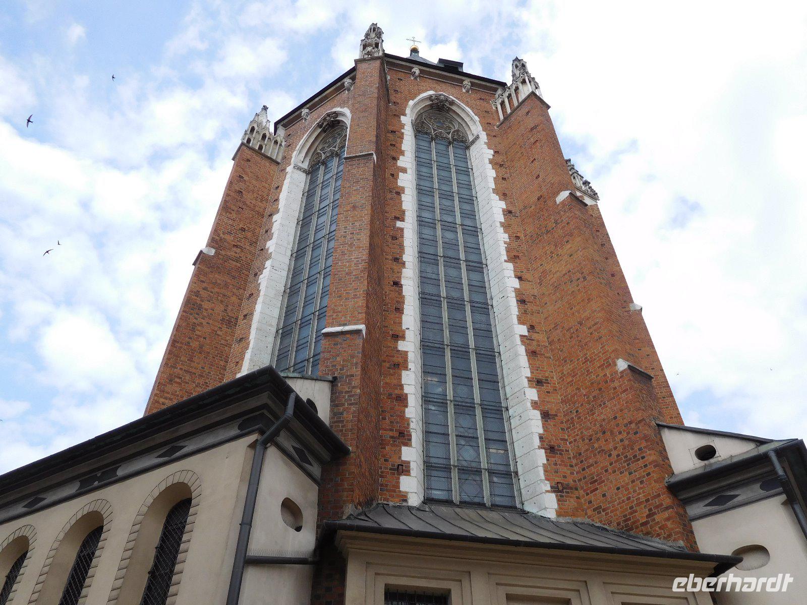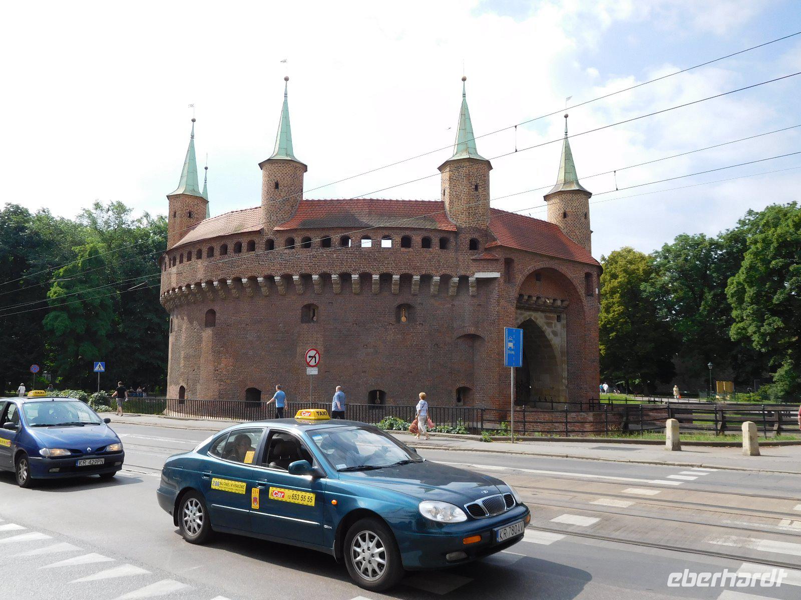 Gleich am Morgen starteten wir gemeinsam mit Guide Ela zum Stadtspaziergang durch Krakau, der uns zuerst an der elfenbeinweißen Florianskapelle mit ihrer barocken Gestalt aus dem 17. Jahrhundert, dann am - an diesem Vormittag noch verhüllten - Grundwald-Denkmal vorbei zum Barbakan. Dieses wuchtige Verteidigungswerk vor der Stadtmauer steht seit dem 15. Jahrhundert zum Schutz der Krakauer Stadtmitte bereit. In die Krakauer Altstadt selbst gelangten wir durch das Florianstor aus dem 14. Jahrhundert, dem letzten erhaltenen Stadttor der Krakauer Stadtmauer. Weiter führte uns Ela durch die mittelalterlichen Gassen, die nicht nur dank der warmen Temperaturen italienisch anmuteten, am Krakauer Juliusz-Slowacki-Theater vorbei bis hin zum kleinen Rynek. Nun war die Zeit für ein besonderes Schauspiel: Das Hejnal wurde vom Turm der Marienkirche gespielt. Hier spielt ein Trompeter jede volle Stunde diese Melodie in jede Himmelsrichtung Krakaus. Das Spiel endet in Krakau abrupt, womit es an den Mongolenangriff im 13. Jahrhundert erinnert. Der damals warnende Trompeter wurde, so die Legende, während des Trompetenspiels von einem Pfeil tödlich getroffen. Heute wird das Hejnal Mariacki täglich um 12 Uhr im Polnischen Radio gespielt. Weiter führte uns der Weg über den Rynek und durch die Tuchhallen, in denen heute Polnische Folklore und Handwerkskunst feilgeboten wird. Der Rathausturm wurde zum markanten Treffpunkt und die moderne Darstellung des Eros-Kopfes von allen bestaunt: Kopflos und Blind, so wird die Liebe in Krakau symbolisiert.