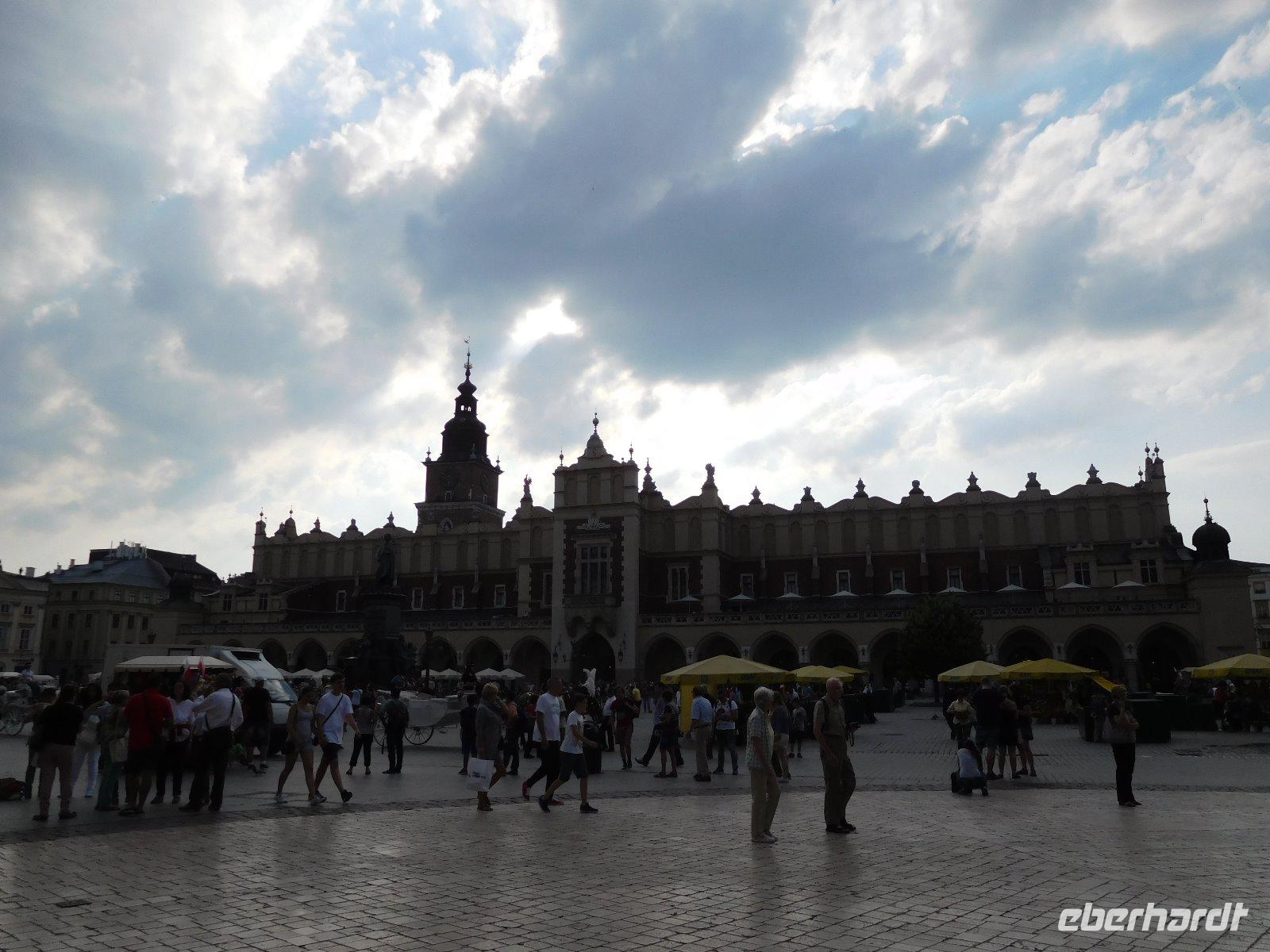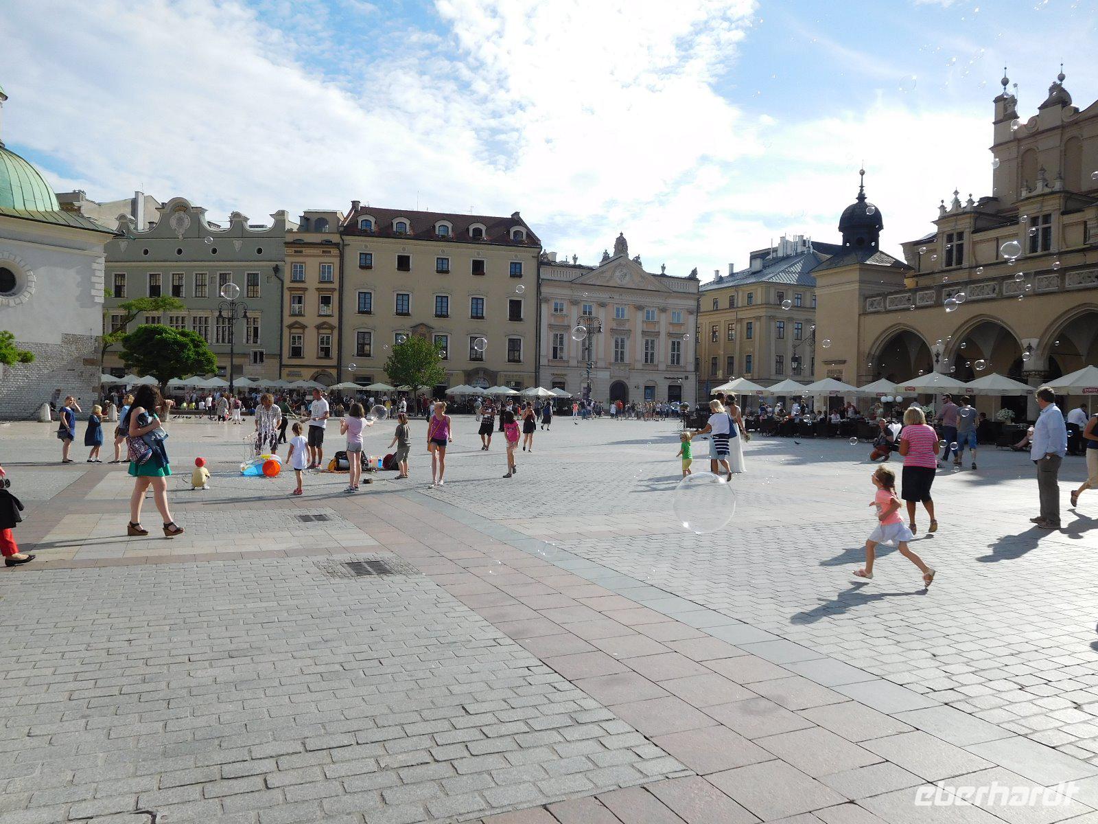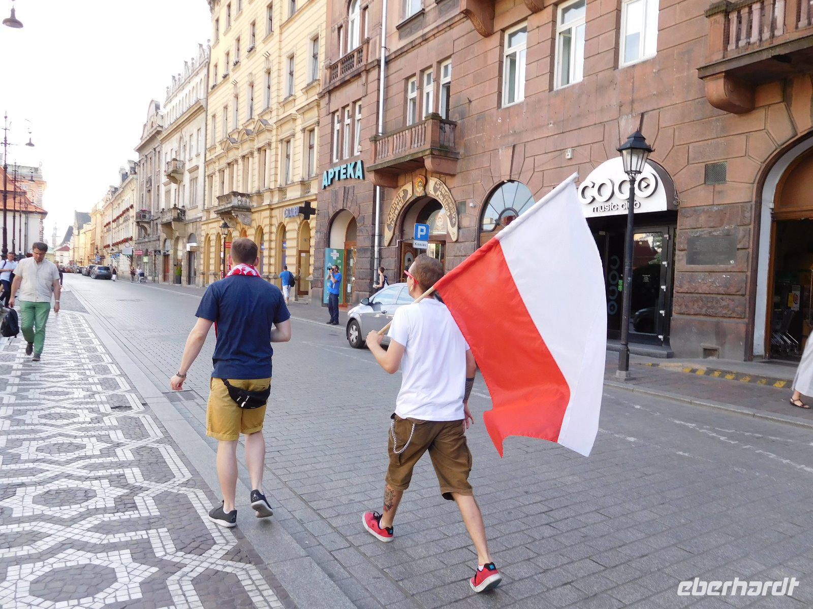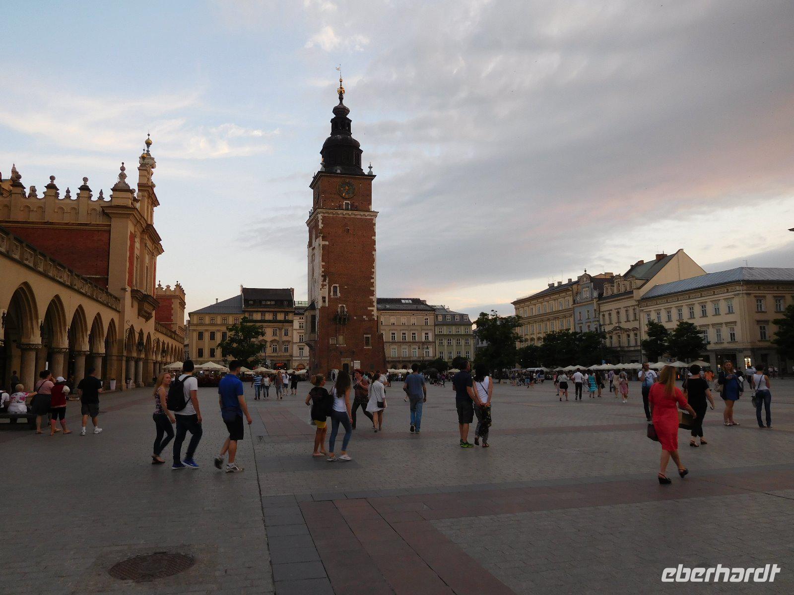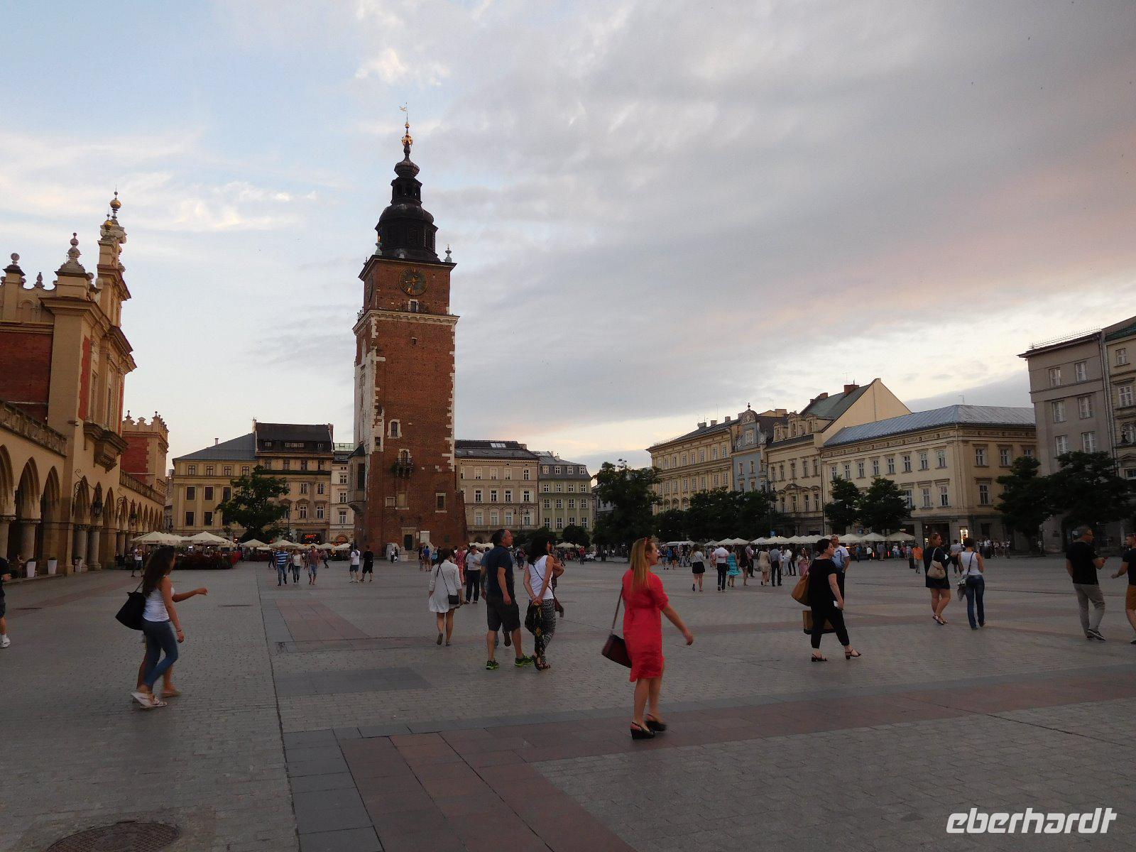 Wer wollte, der konnte noch am Abend einen kleinen Spaziergang zum Rynek, dem Krakauer Marktplatz, unternehmen. Dort gab es bei herrlich warmen Temperaturen schon viel zu sehen: Vielerlei Gaukler und Kutschen standen bereit, um der schönen Kulisse des Marktplatzes mehr Leben zu verleihen. Die Cafés und Restaurants luden ein für einen Umtrunk oder man konnte einfach nur durch die Gassen schlendern und die schon fast südländische Betriebsamkeit des Abends genießen. Auch in den Straßen konnte man viele glückliche Fußball-Fans sehen, denn immerhin hatte sich auch Polen an diesem Abend für das Achtelfinale qualifiziert.