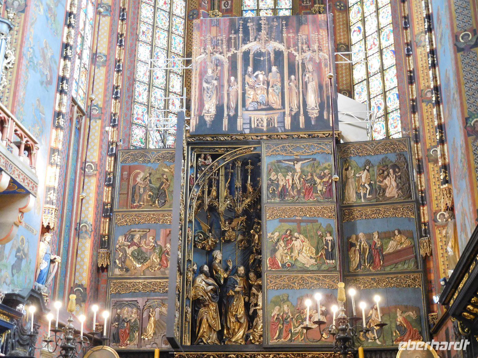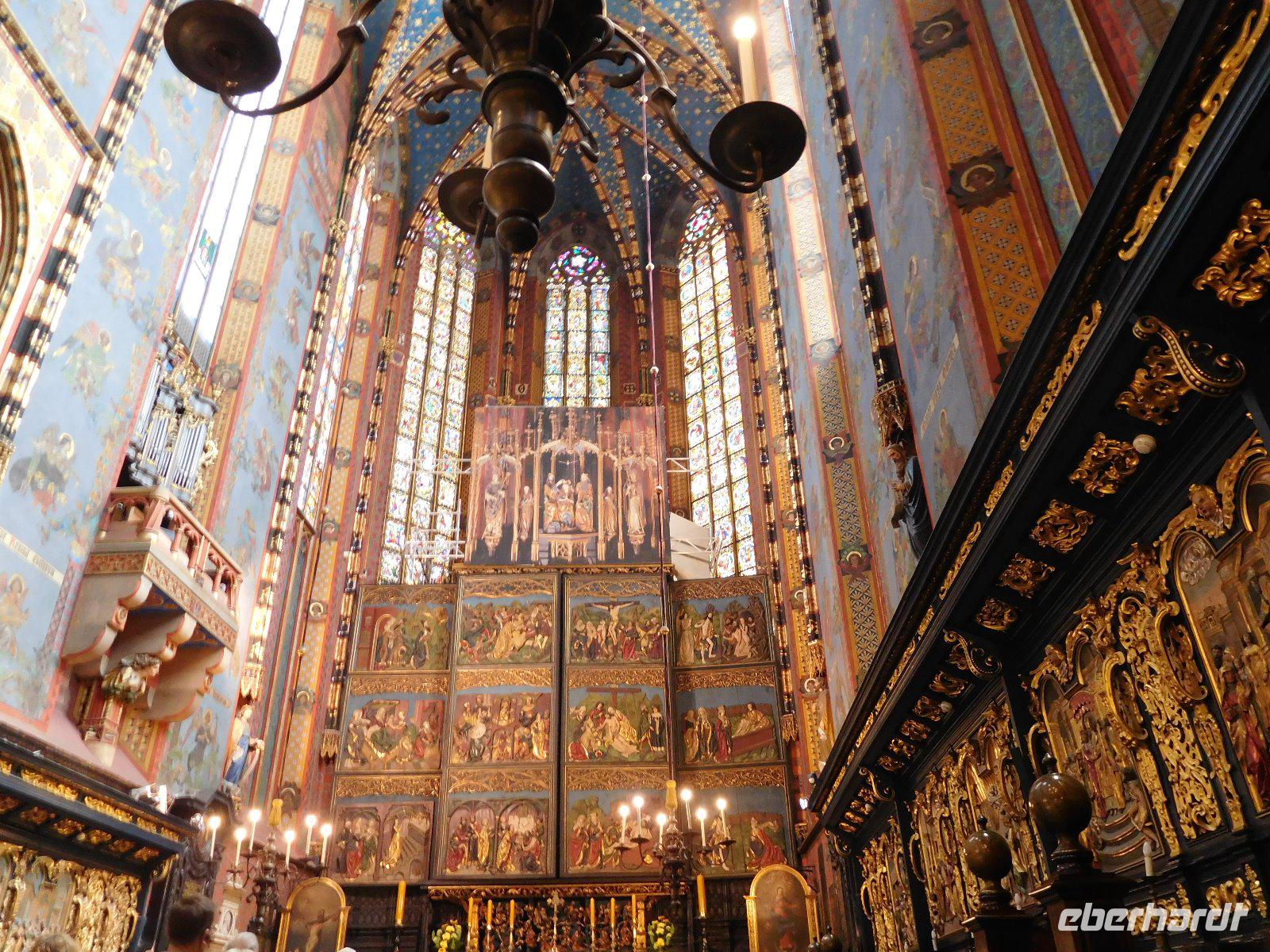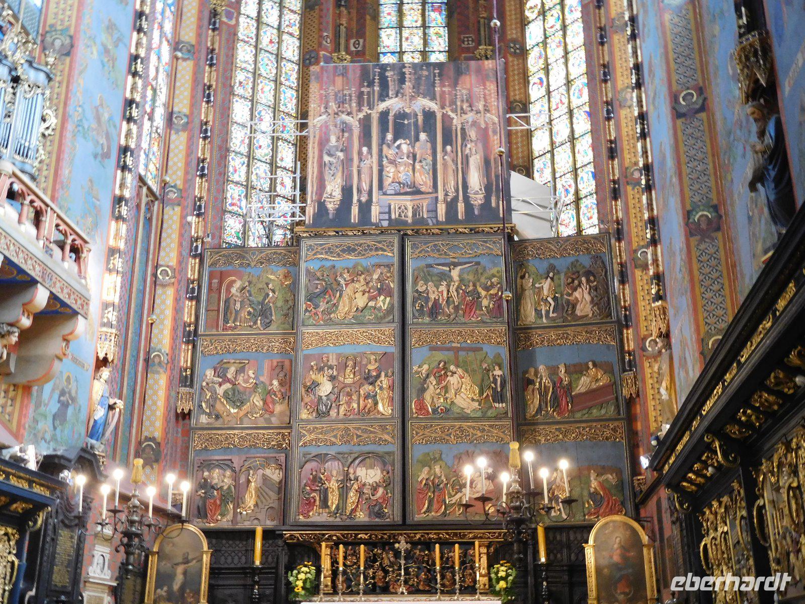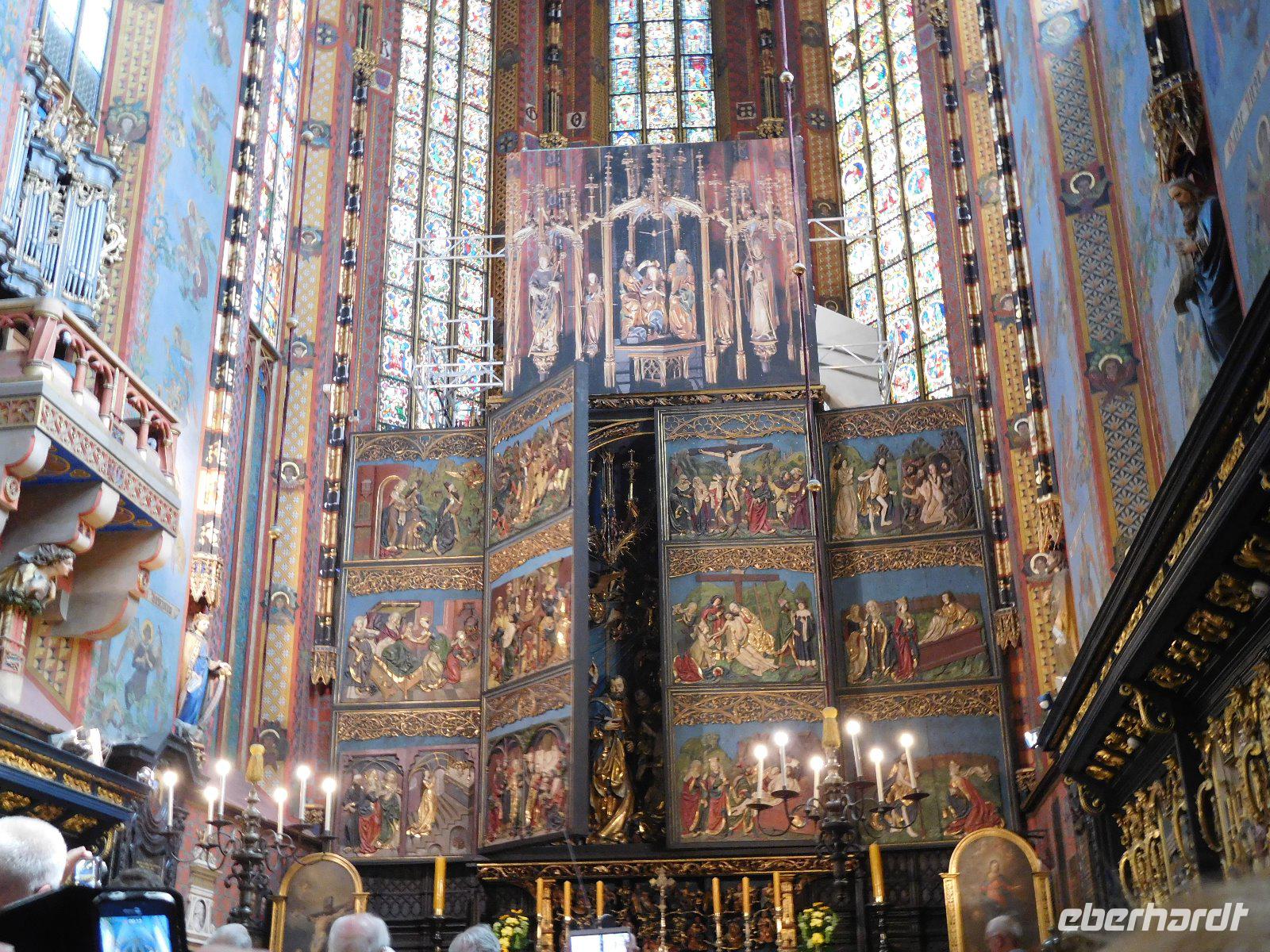 Nun spazierten wir weiter zur Universität zu Krakau, genauer dem Collegium Maius, wo wir das Spiel des Uhrwerkes mit beweglichen Figuren beobachten konnten. Der Weg führte uns weiter zum Papstfenster und Franziskanerkloster zurück bis zur Marienkirche, wo wir der Öffnung des kostbaren Veit Stoß Altares beiwohnten.
